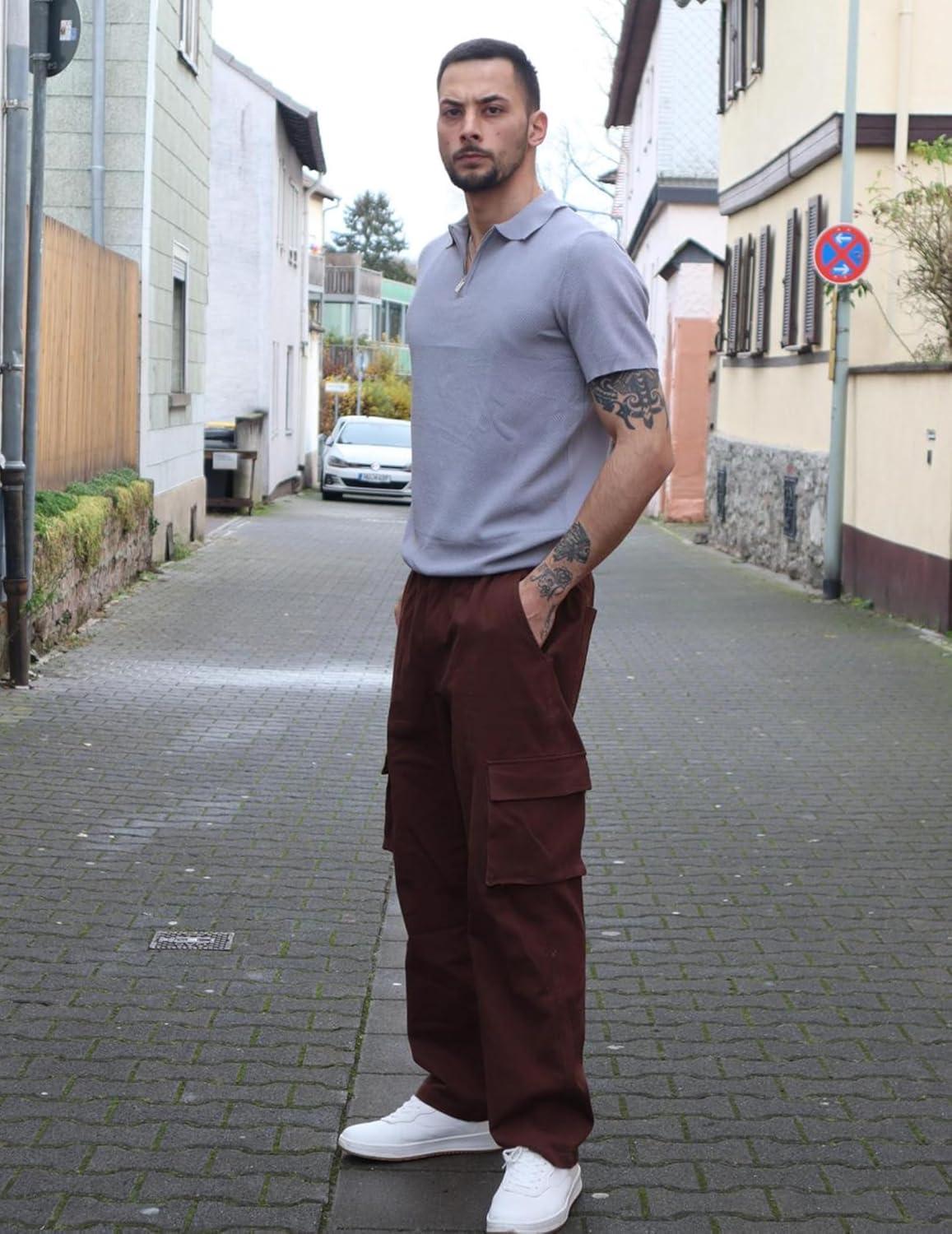 COOFANDY Mens Textured Knit Polo Shirts Zipper Polo Shirts Short Sleeve Casual Lightweight Golf Shirt(Stripes – Brown & White)