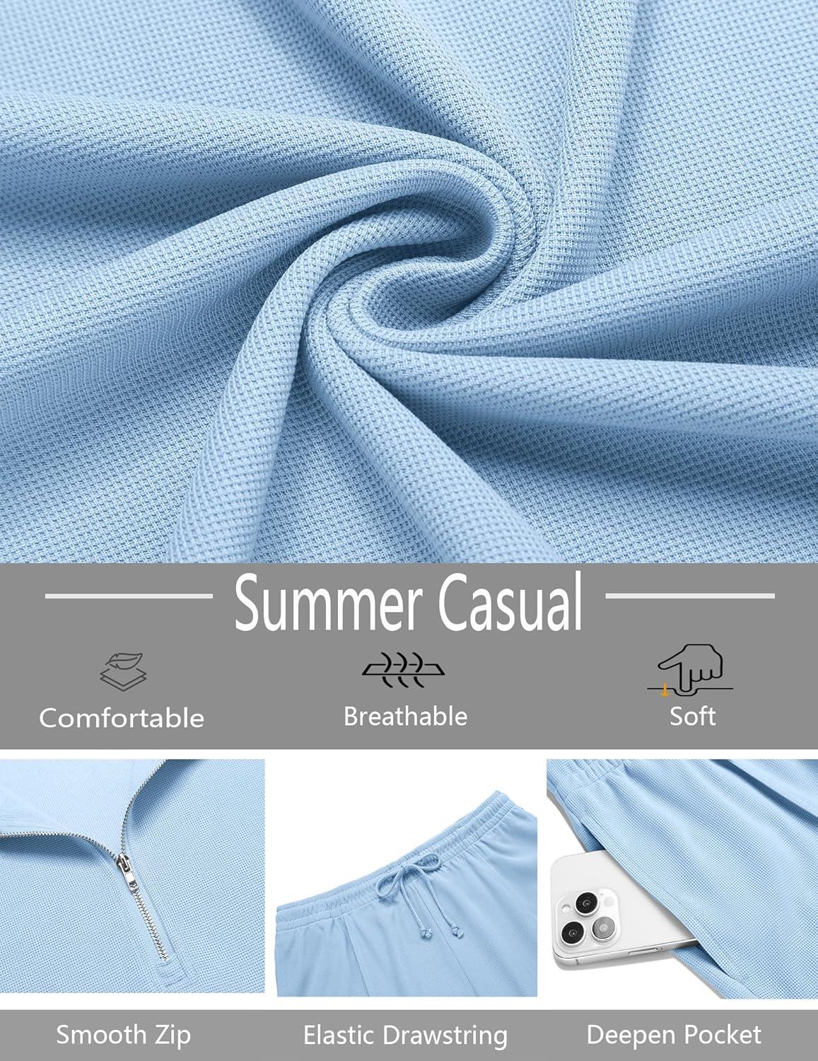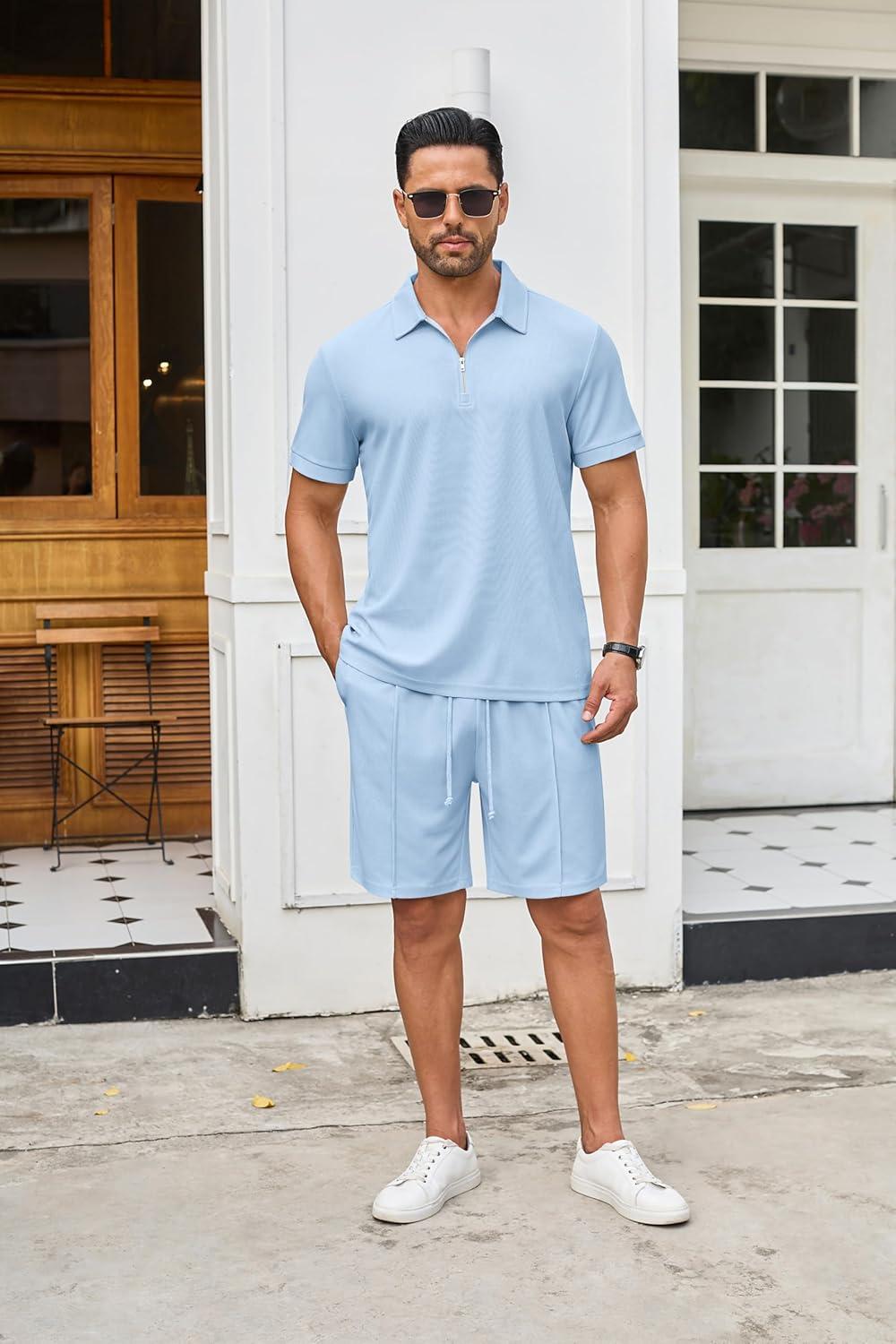 COOFANDY Men’s Track Suits 2 Piece Set Quarter Zip Polo Shirt and Shorts Set Summer Casual Outfits(Light Blue)