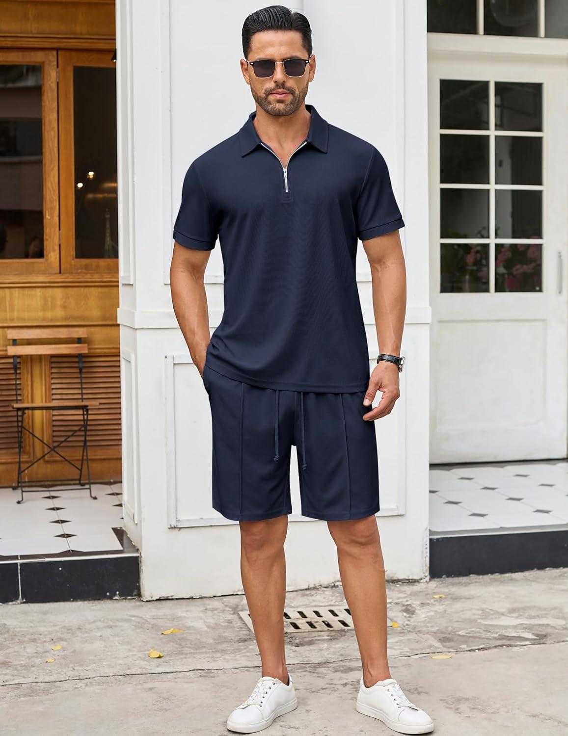 COOFANDY Men’s Track Suits 2 Piece Set Quarter Zip Polo Shirt and Shorts Set Summer Casual Outfits(Navy Blue)