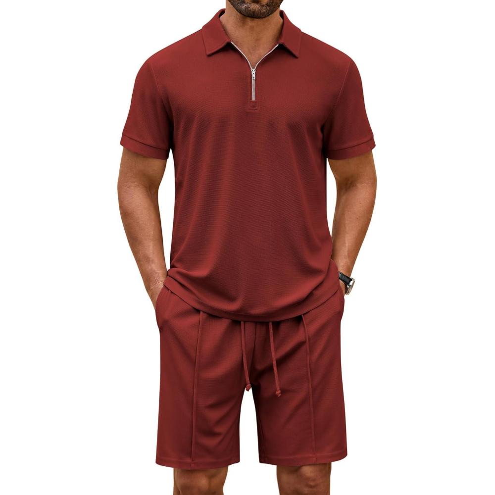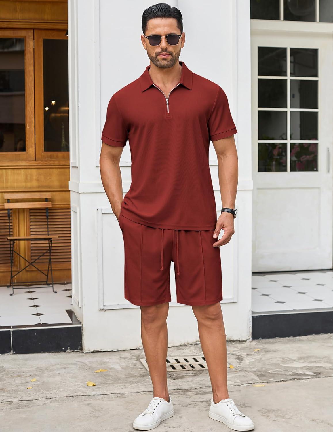 COOFANDY Men's Track Suits 2 Piece Set Quarter Zip Polo Shirt and Shorts Set Summer Casual Outfits(Wine Red)