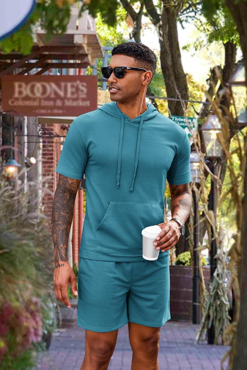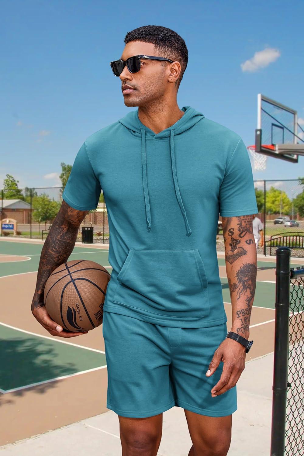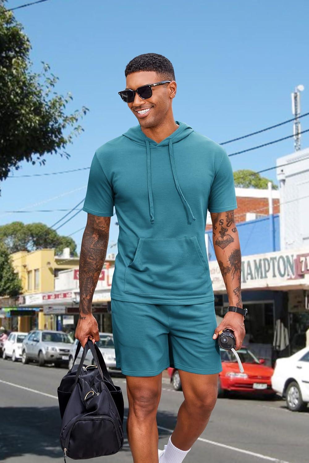 COOFANDY Men's Tracksuit 2 Piece Hooded Athletic Sweatsuit Short Sleeve Casual Sports Hoodie Shorts Set(Dark Peacock Blue)