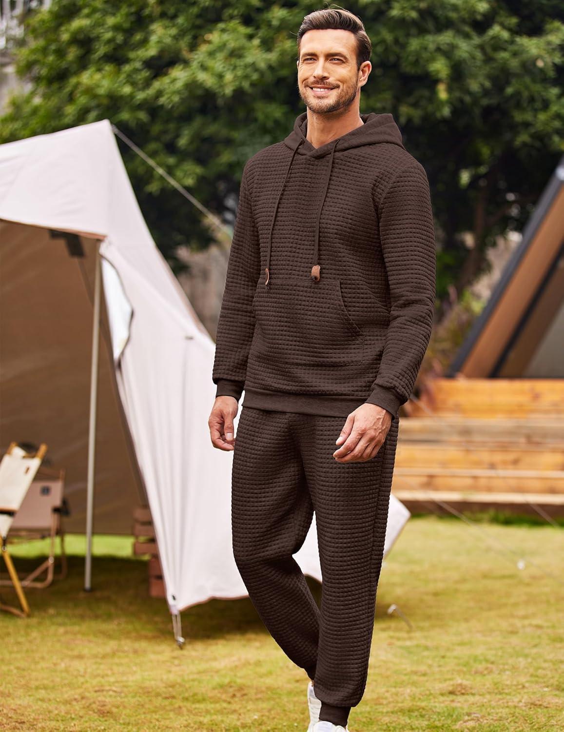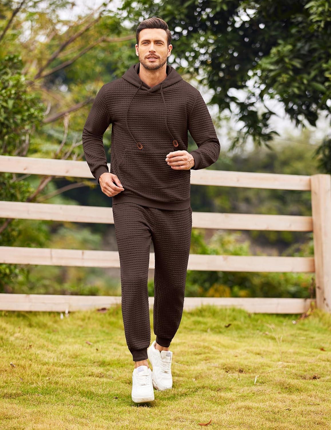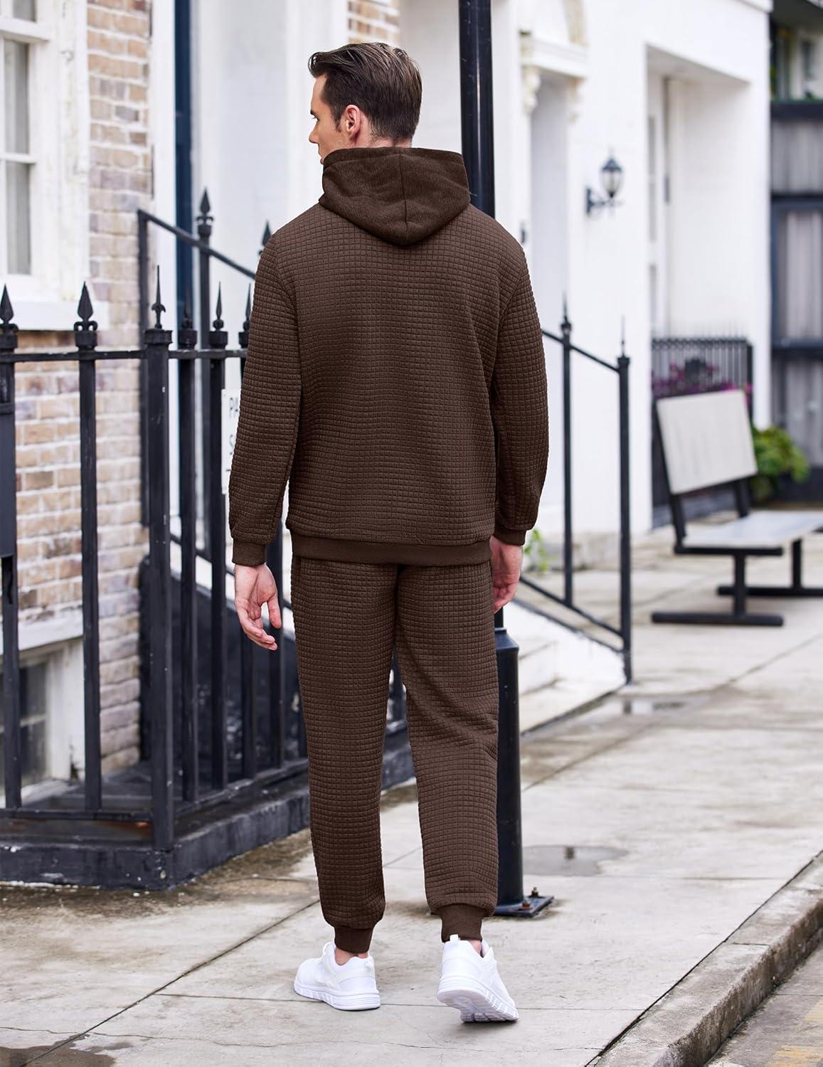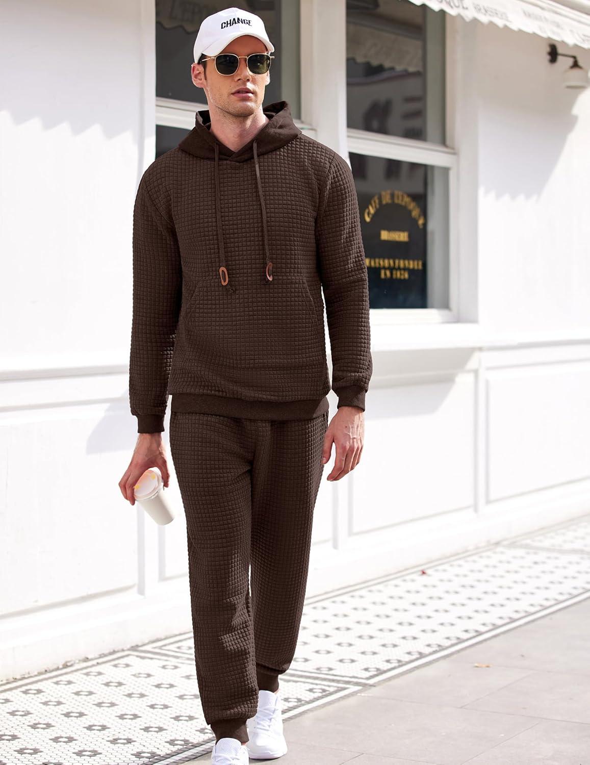 COOFANDY Men's Tracksuit 2 Piece Hoodie Sweatsuit Sets Casual Athletic Jogging Suits Waffle Plaid Jacquard Outfits(Brown)