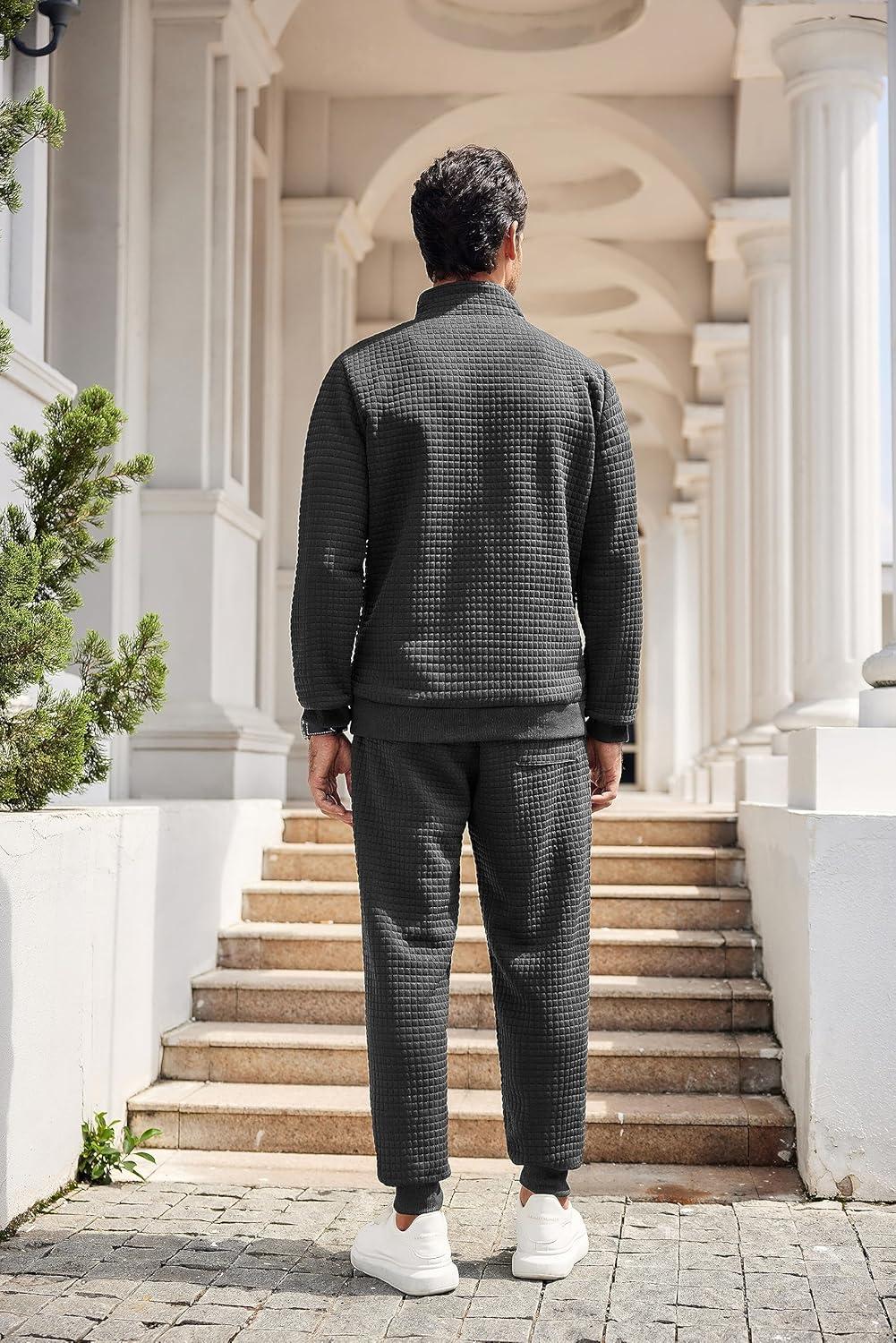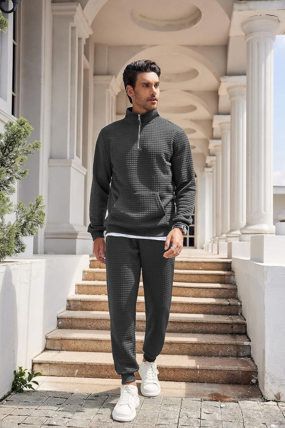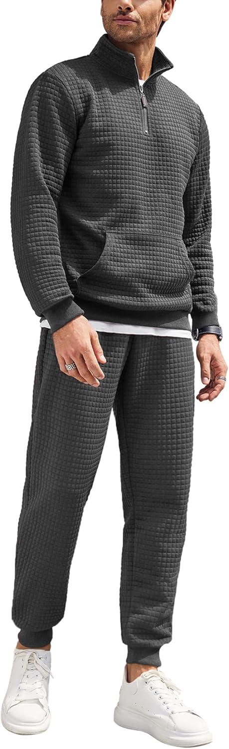 COOFANDY Men's Tracksuit 2 Piece Quarter Zip Sweatsuit Workout Plaid Jacquard Jogging Suit Set(Dark Grey)