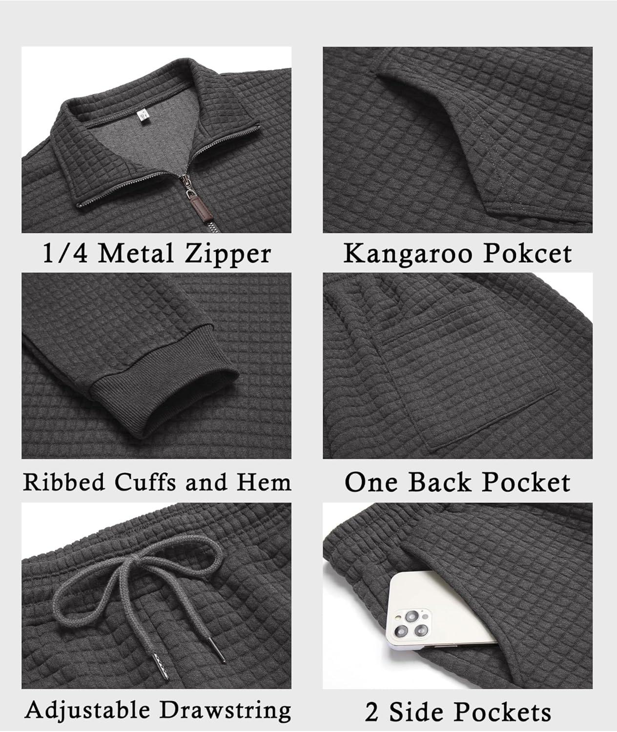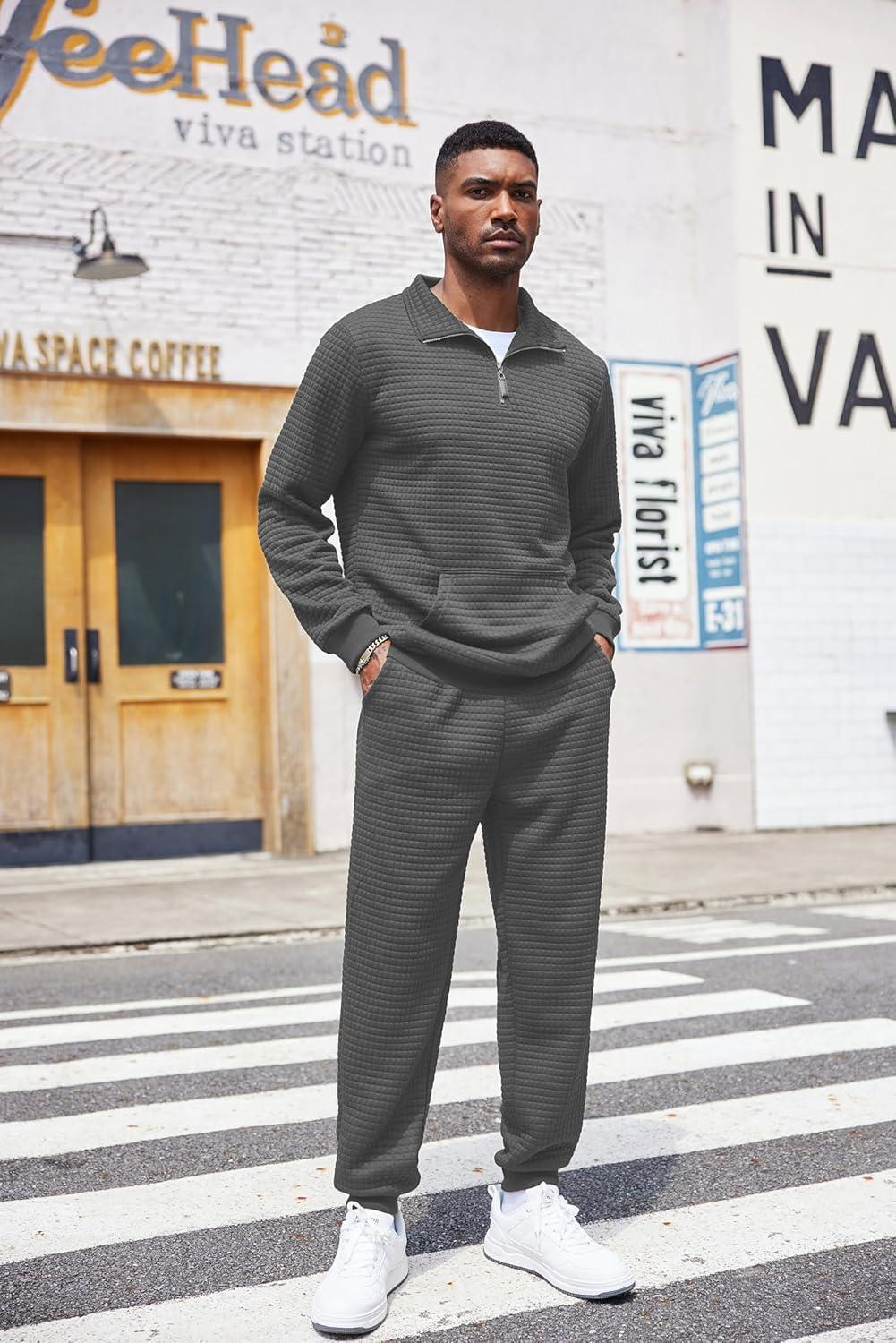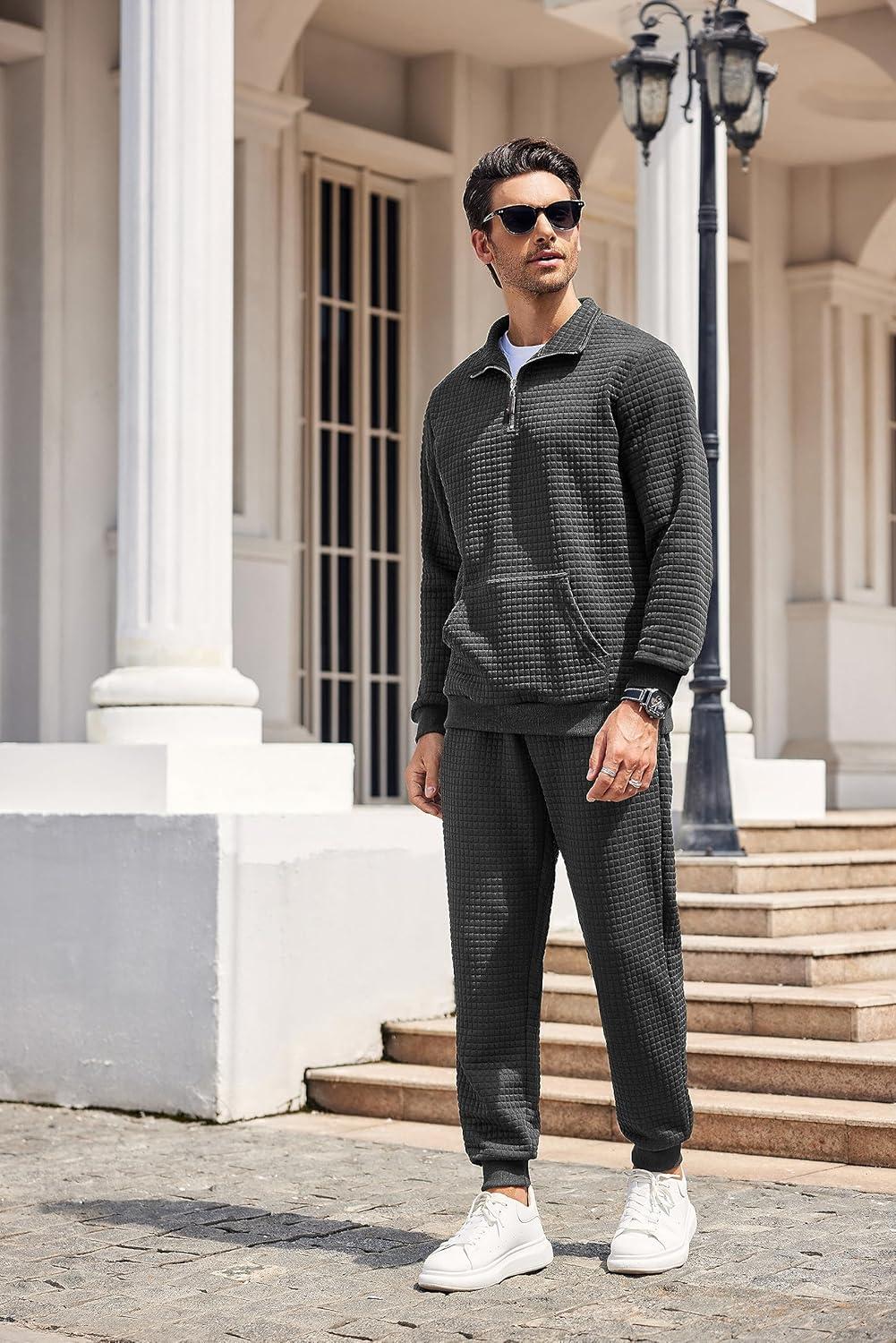 COOFANDY Men's Tracksuit 2 Piece Quarter Zip Sweatsuit Workout Plaid Jacquard Jogging Suit Set(Dark Grey)