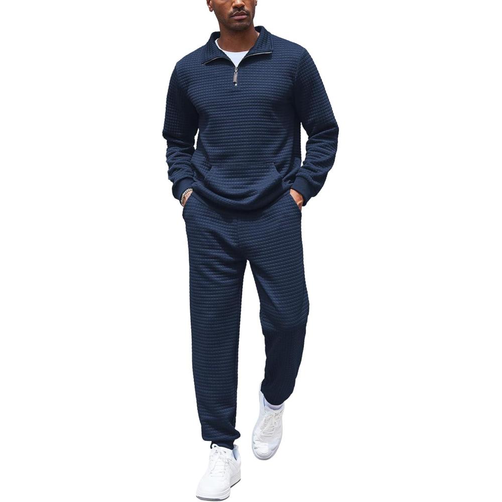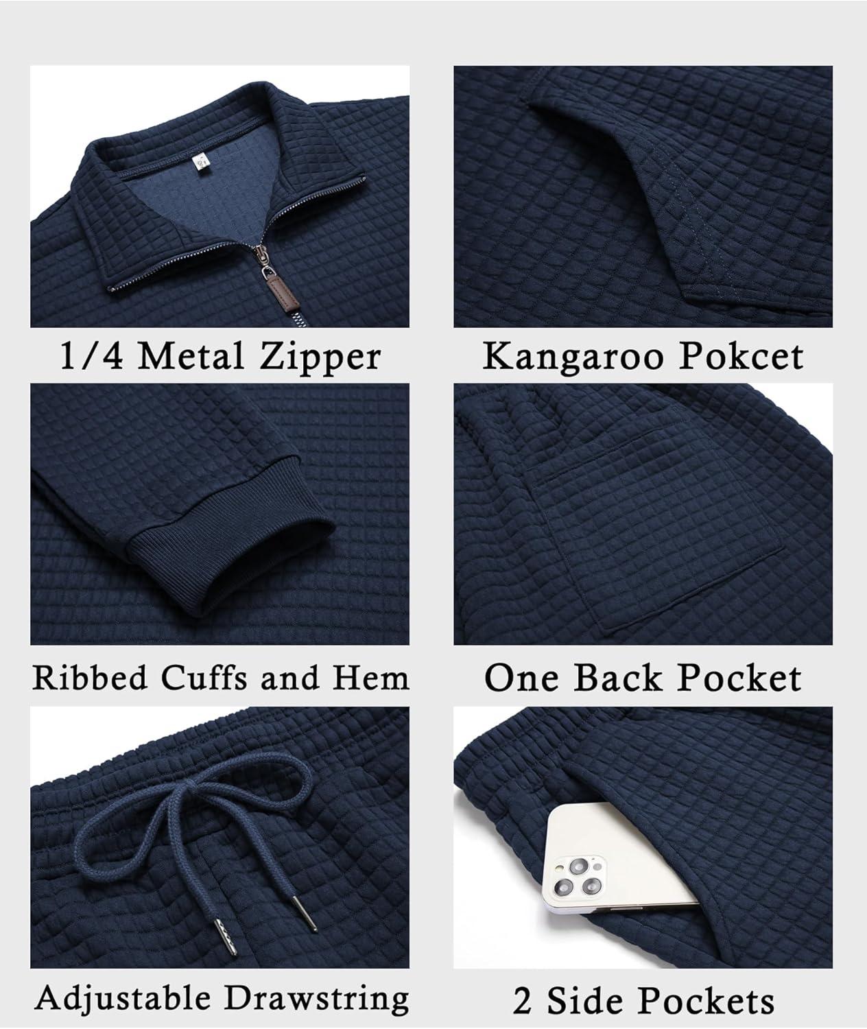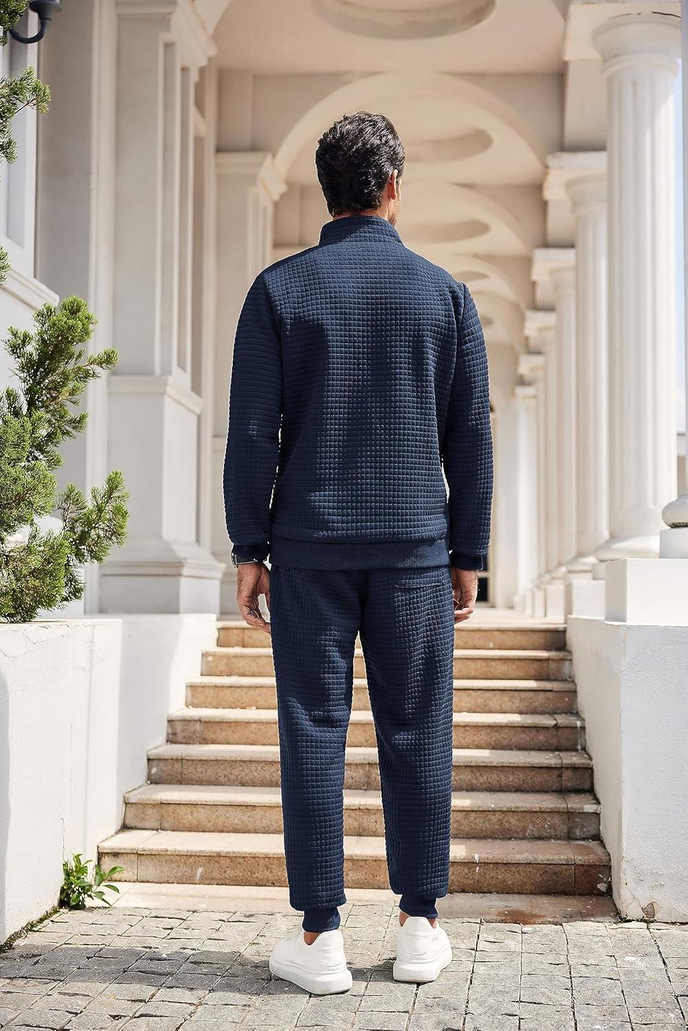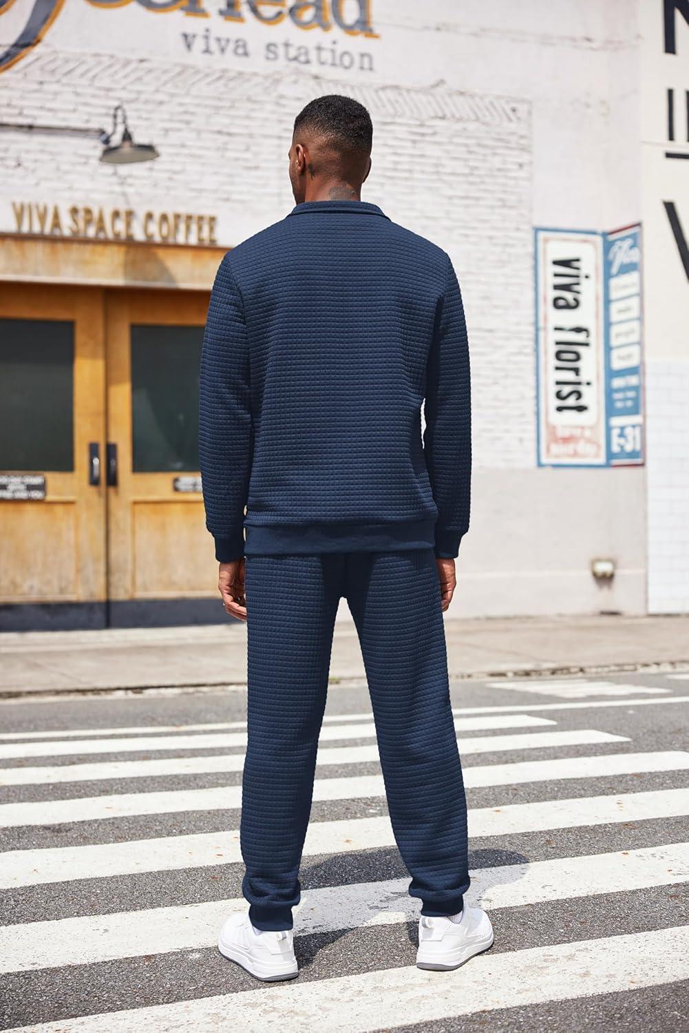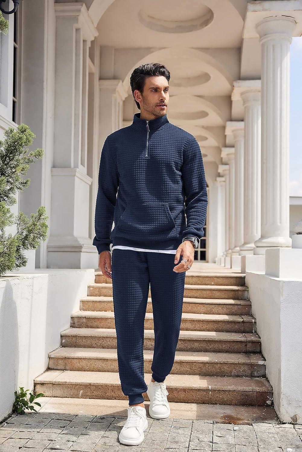 COOFANDY Men's Tracksuit 2 Piece Quarter Zip Sweatsuit Workout Plaid Jacquard Jogging Suit Set(Navy Blue)