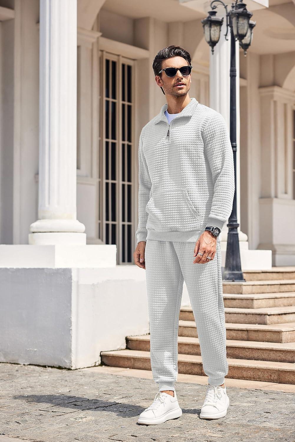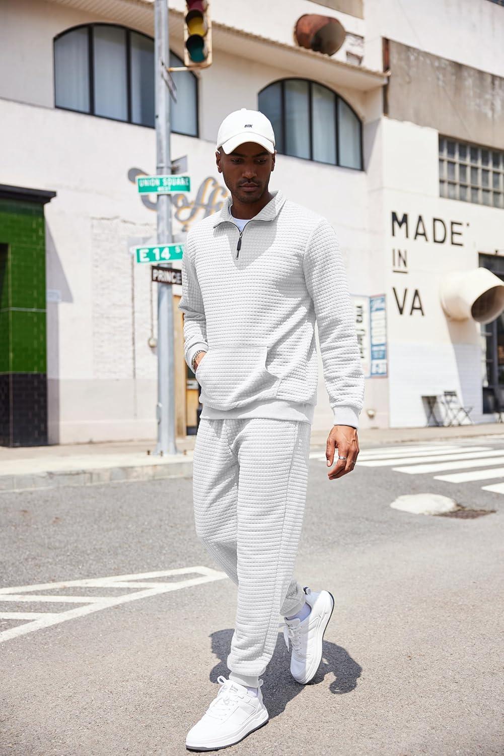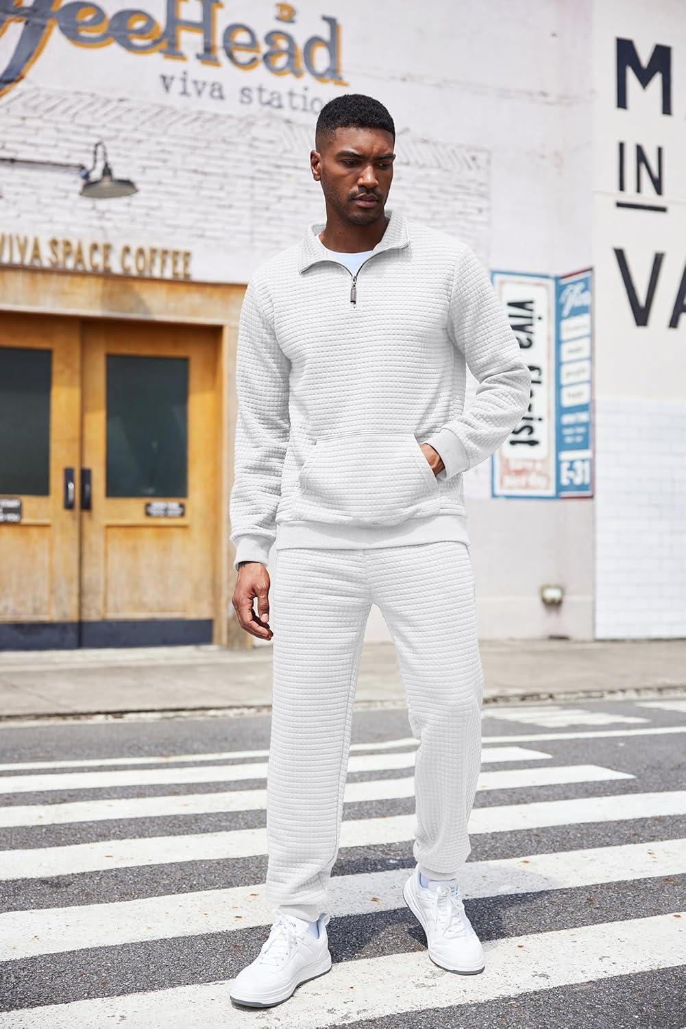 COOFANDY Men’s Tracksuit 2 Piece Quarter Zip Sweatsuit Workout Plaid Jacquard Jogging Suit Set(White)