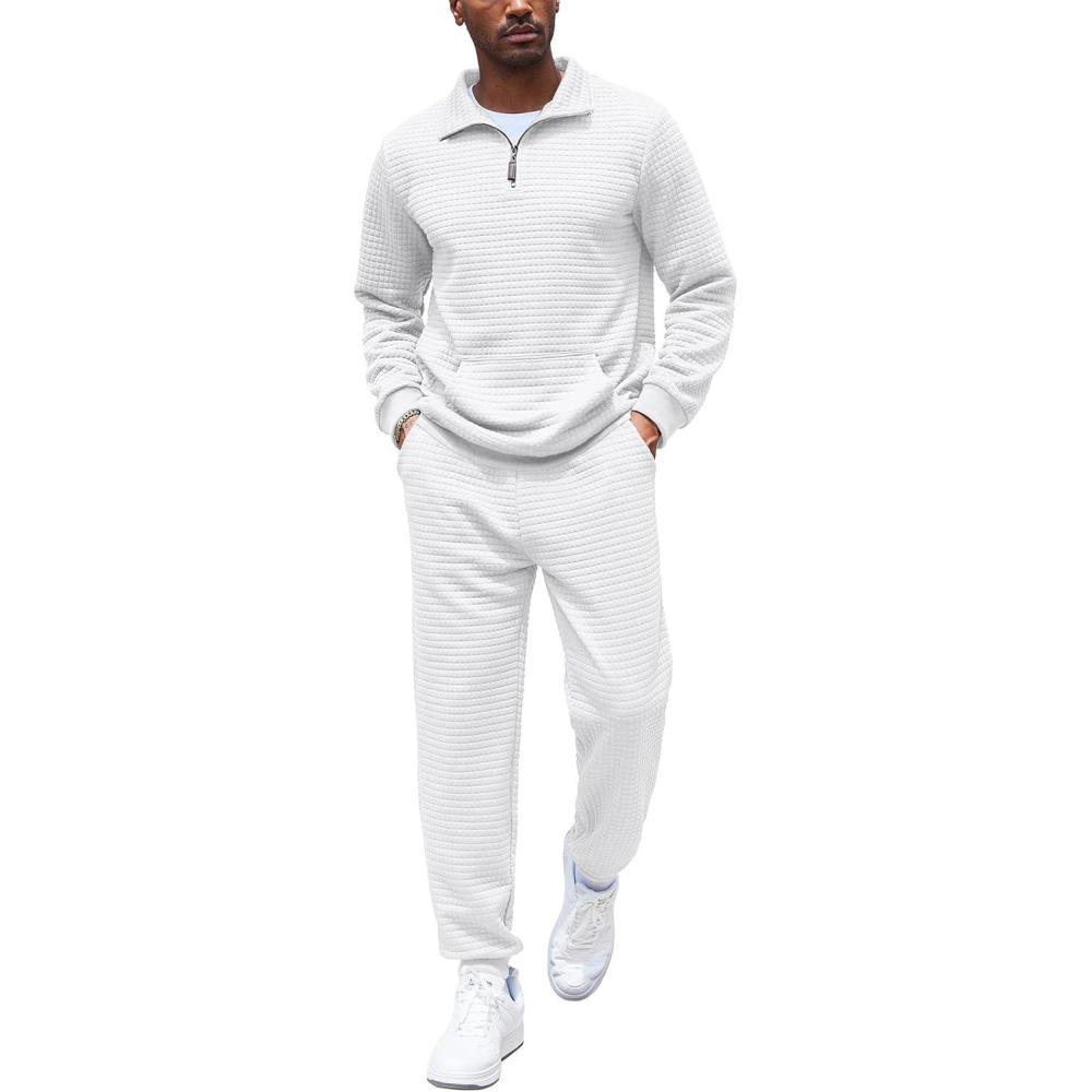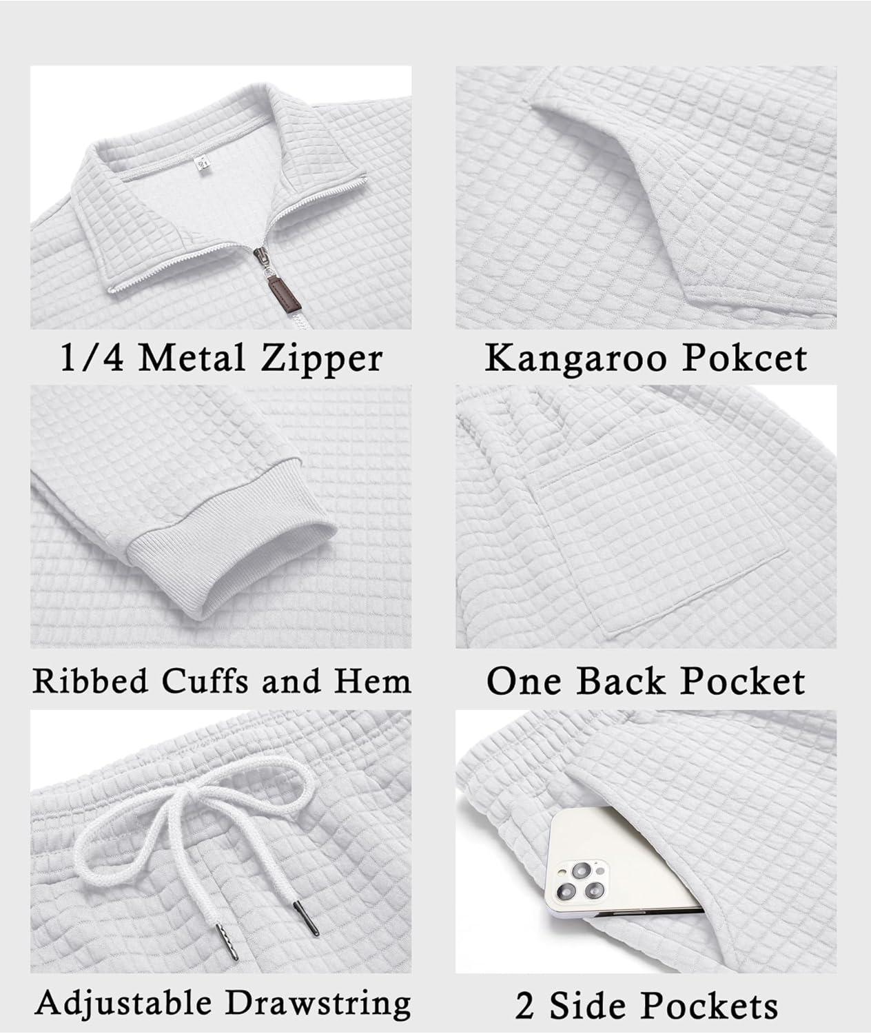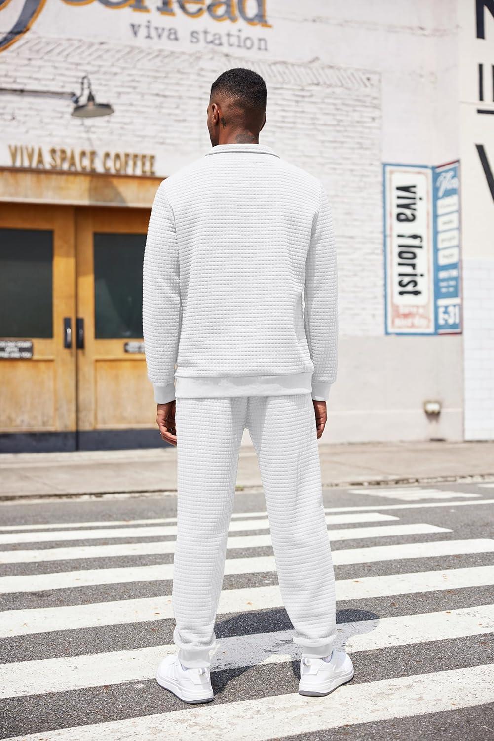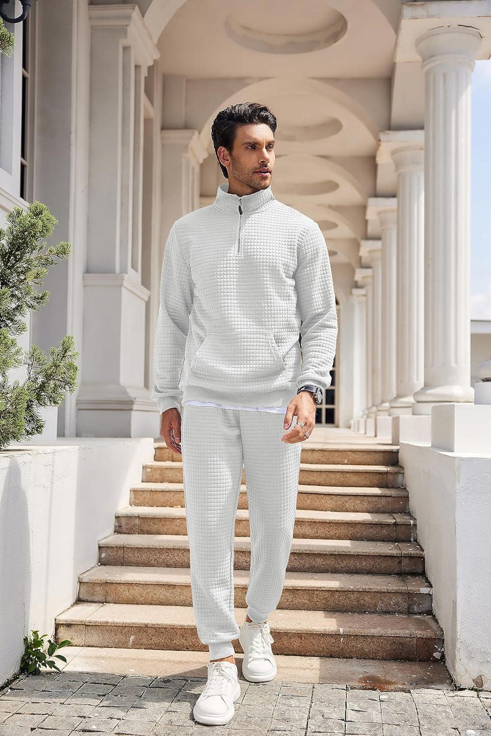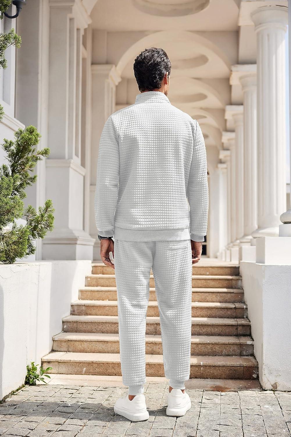 COOFANDY Men's Tracksuit 2 Piece Quarter Zip Sweatsuit Workout Plaid Jacquard Jogging Suit Set(White)