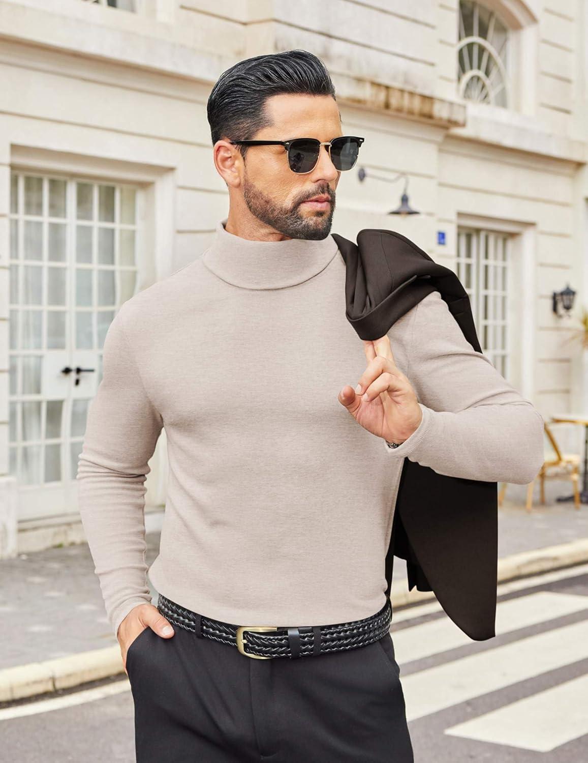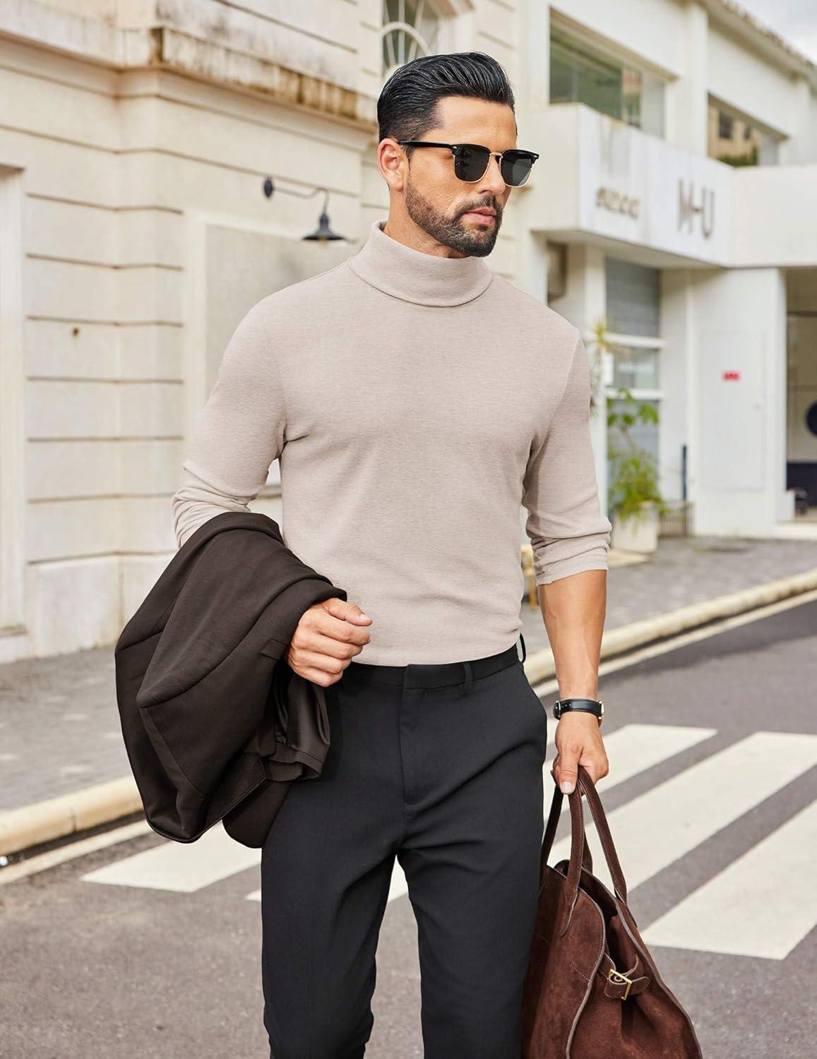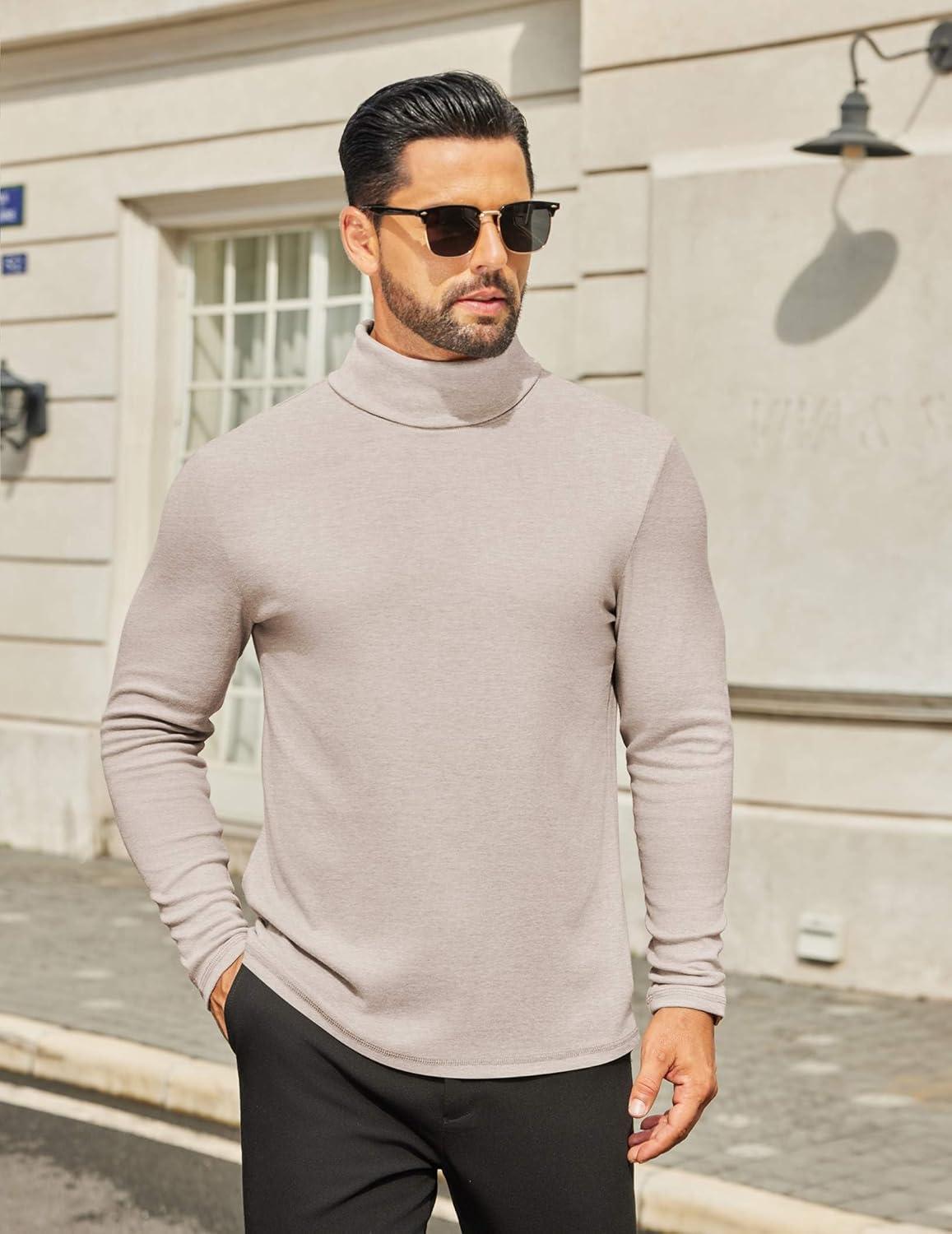 COOFANDY Mens Turtleneck Shirts Slim Fit Shirt Tops Lightweight Pullover Thermal Sweater Casual Long Sleeve Shirt(Almond)