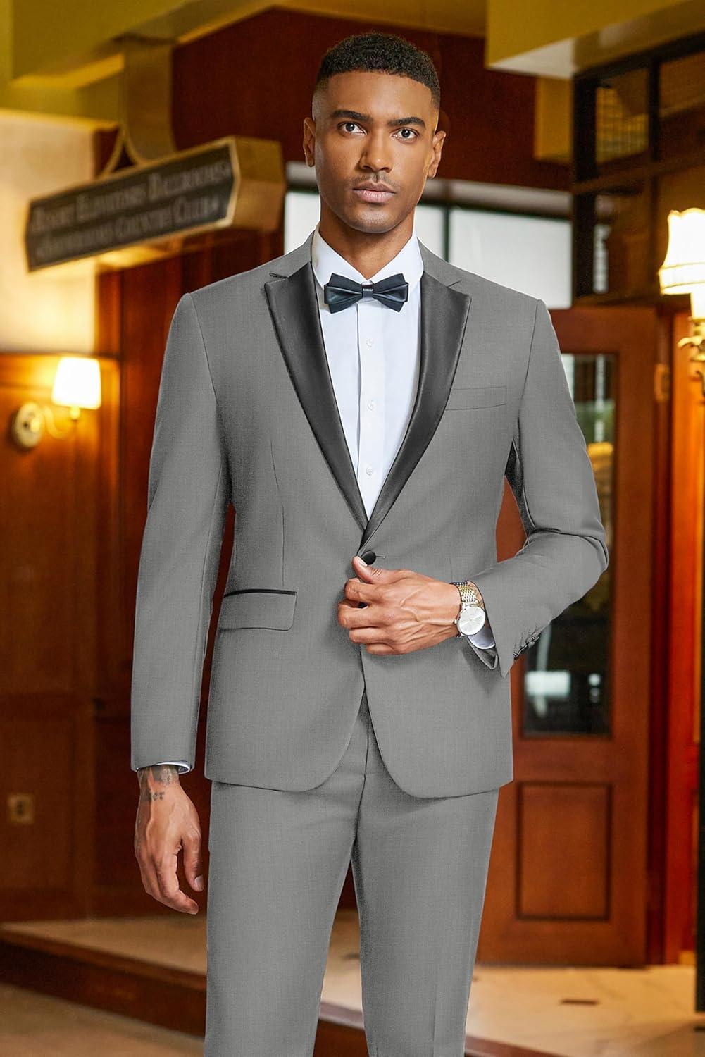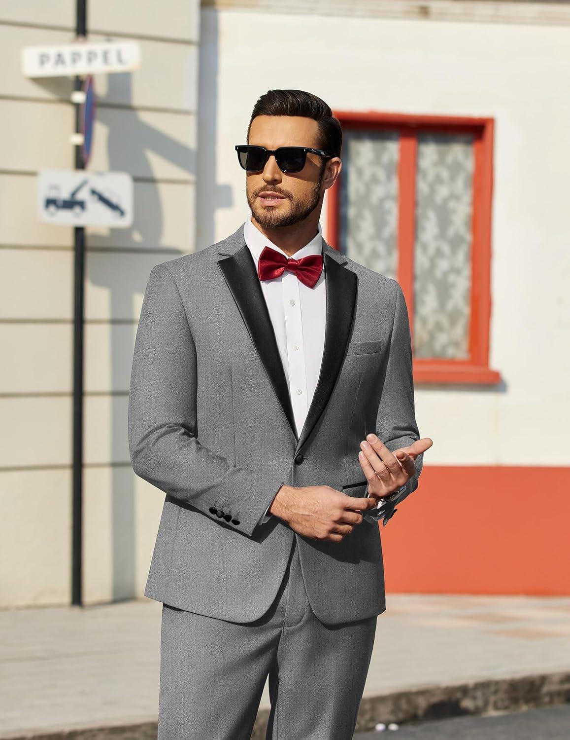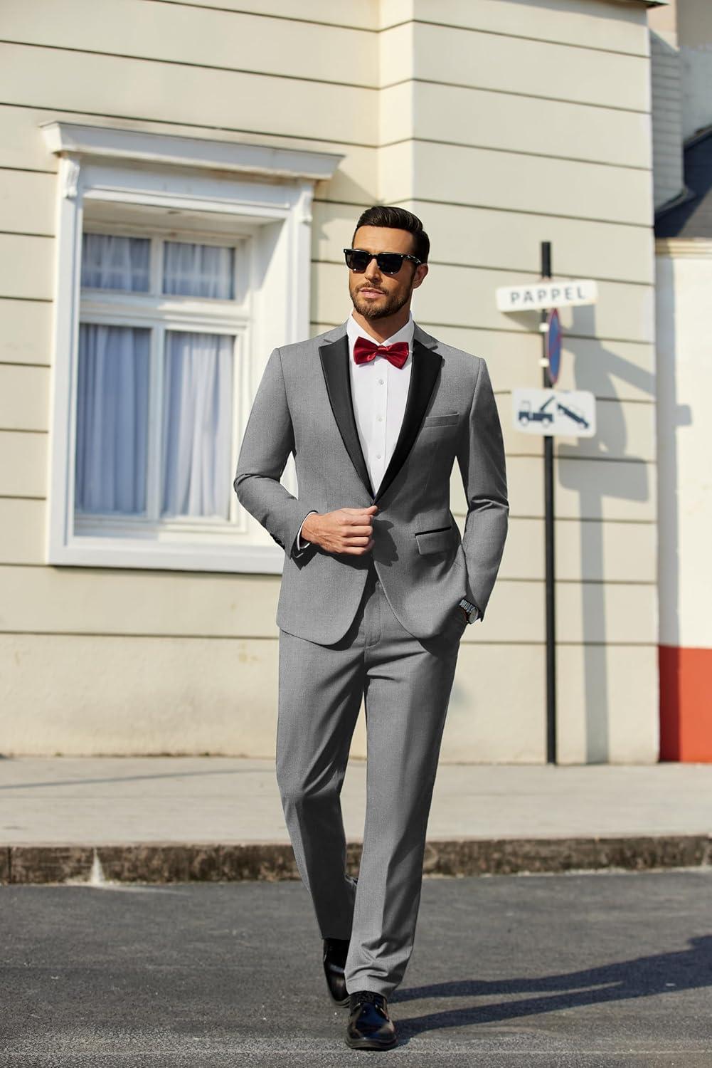 COOFANDY Mens Tuxedo Suit Set Slim Fit 2 Piece One Button Christmas Blazer Jacket Pants for Wedding,Dinner,Prom(Light Gray)