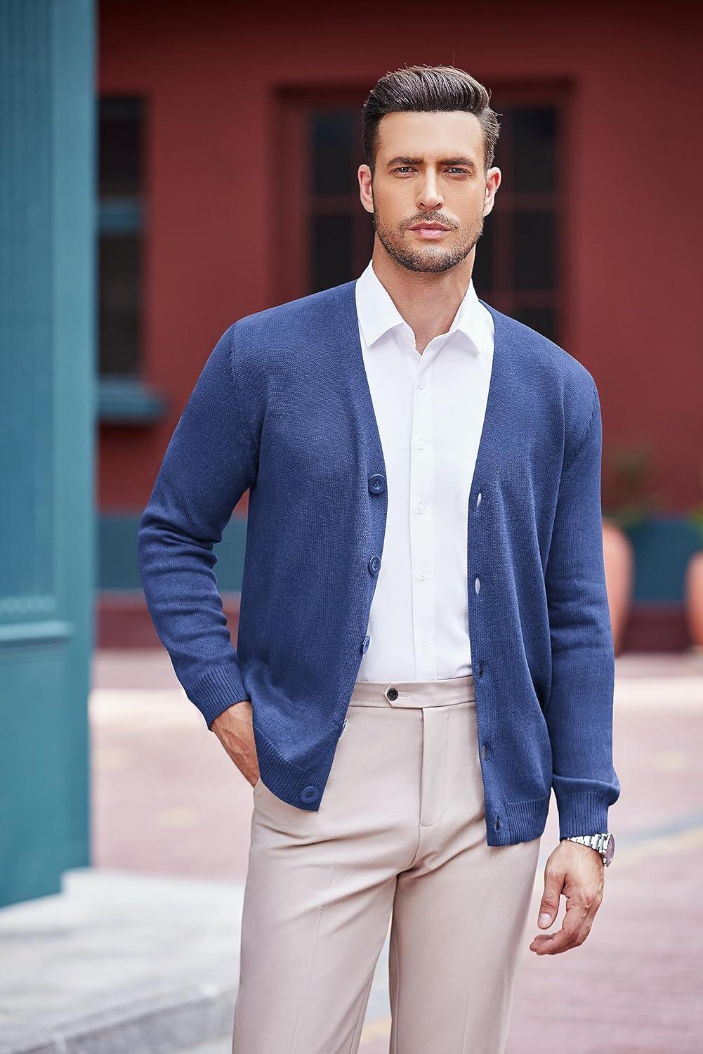 COOFANDY Men’s V Neck Cardigan Sweater Casual Lightweight Button Down Knitted Cardigan Sweater(Blue)