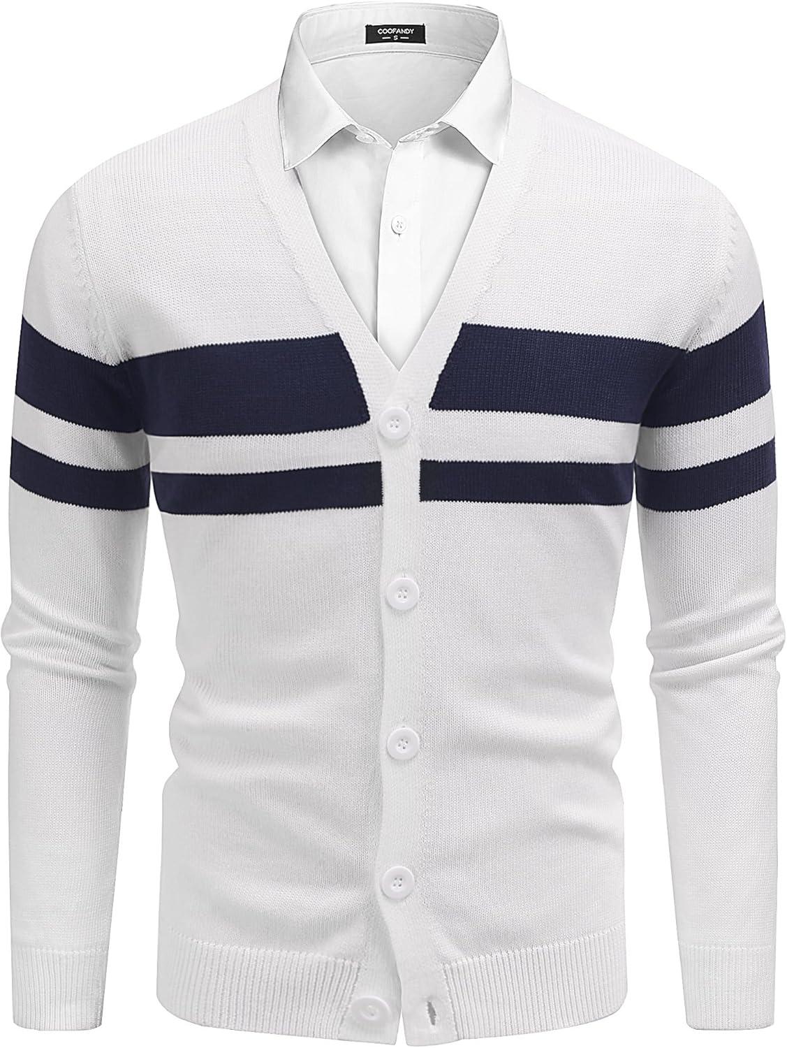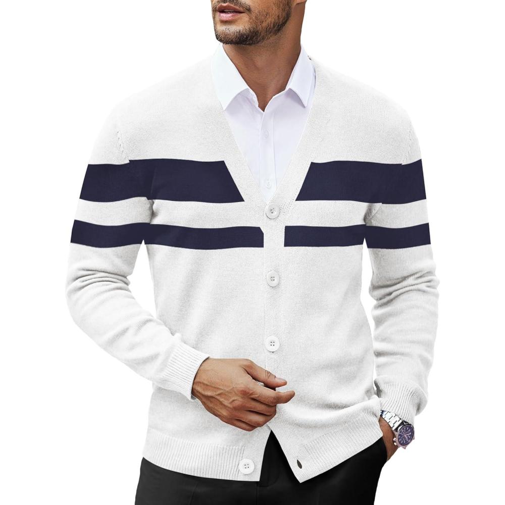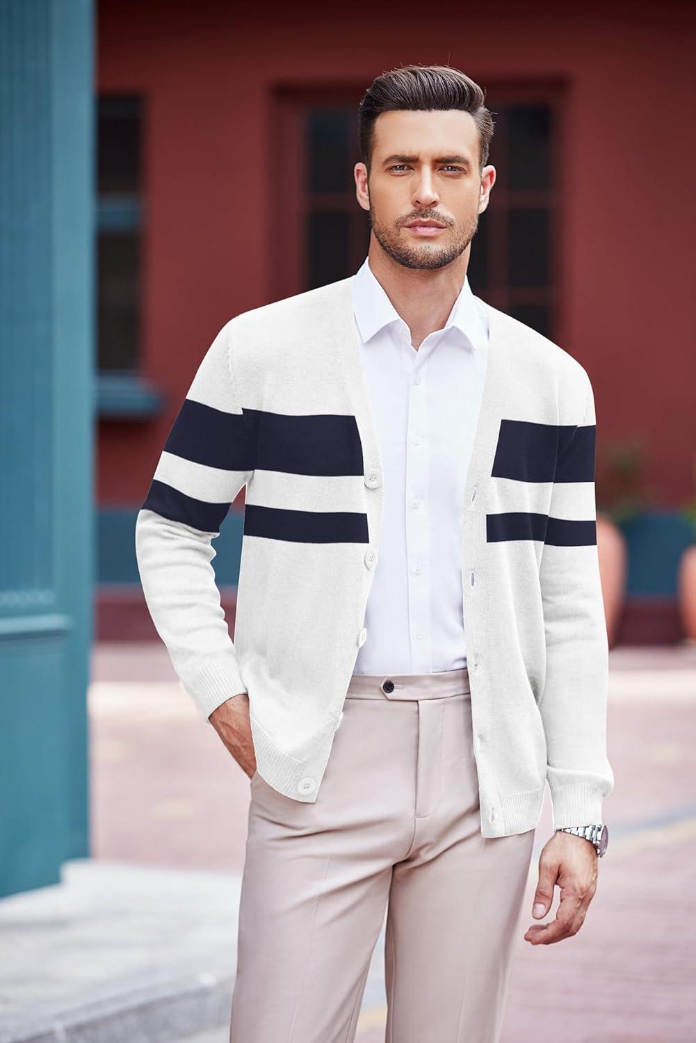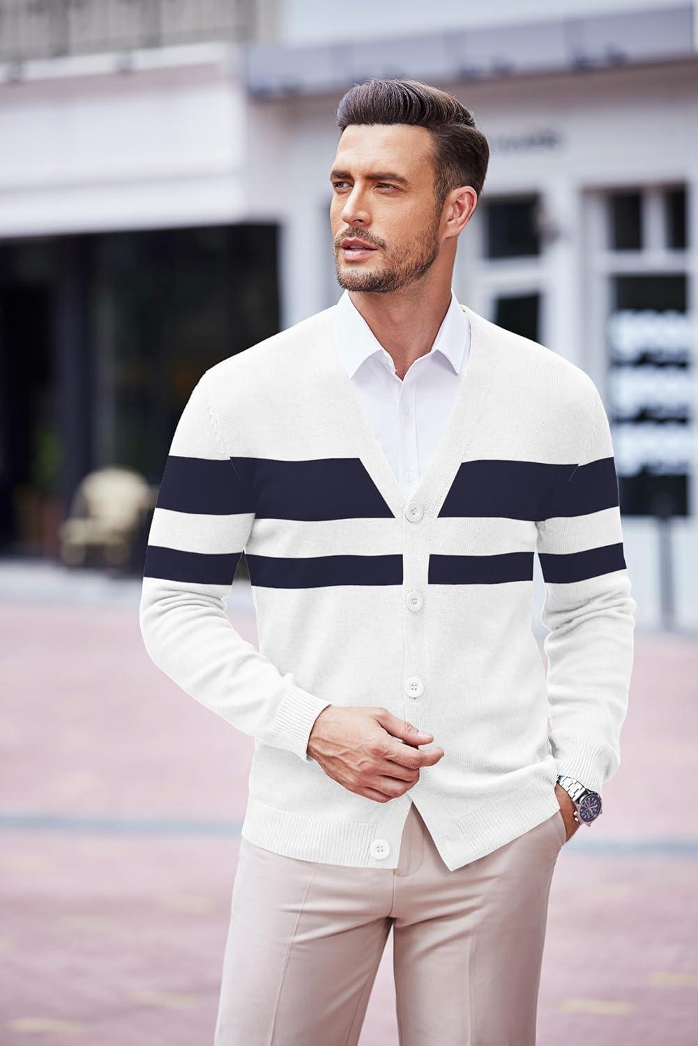 COOFANDY Men's V Neck Cardigan Sweater Casual Lightweight Button Down Knitted Cardigan Sweater(White Stripe)