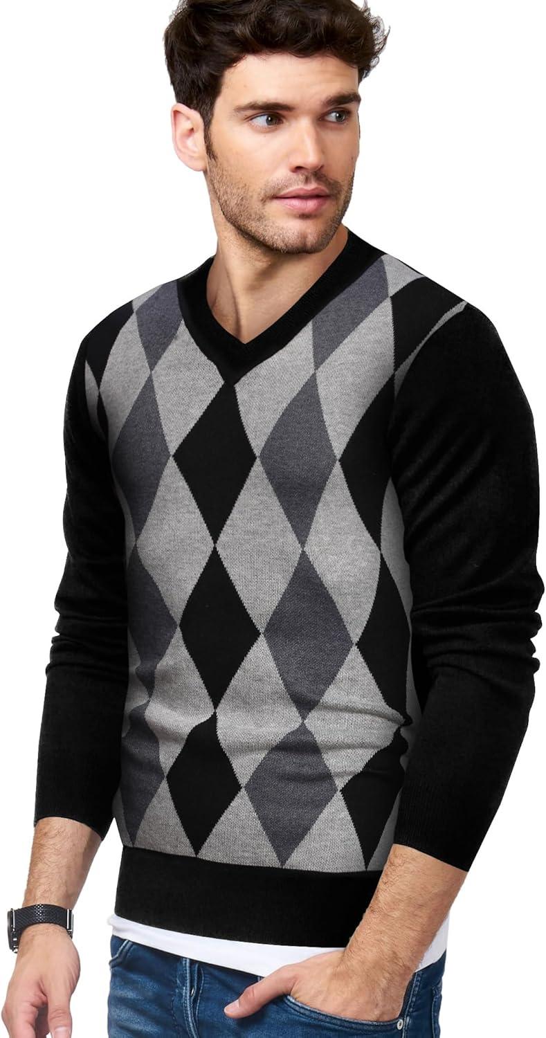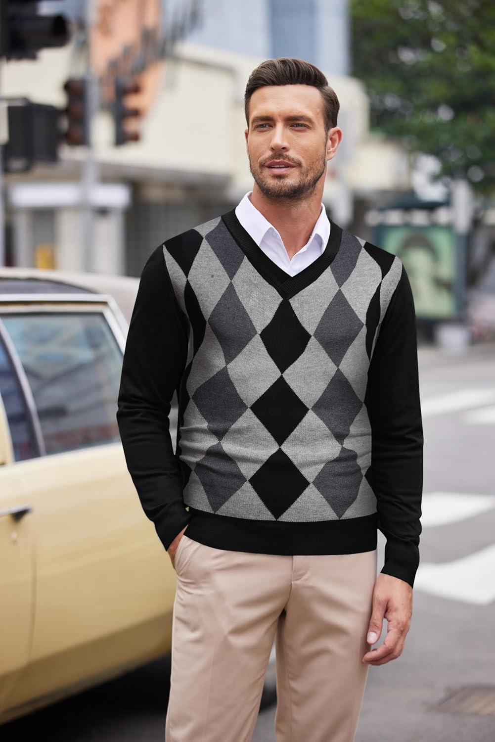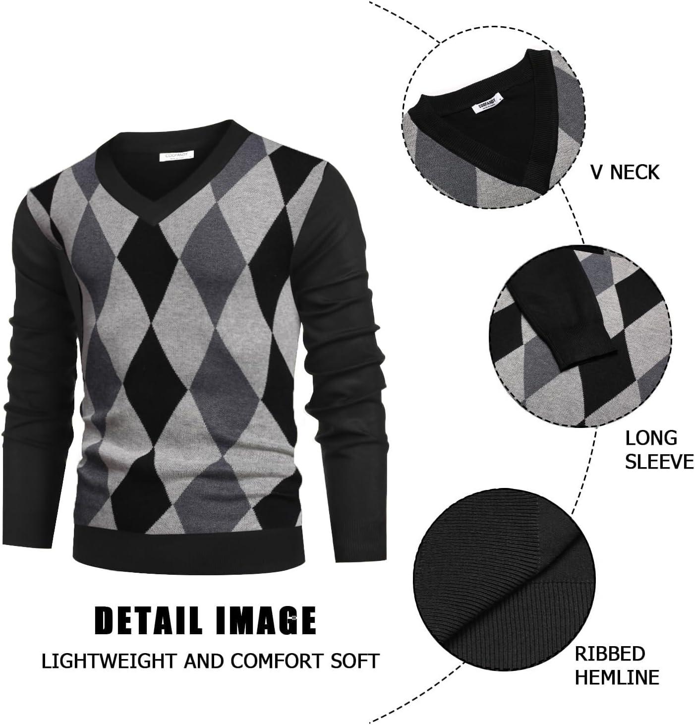 COOFANDY Mens V Neck Dress Sweater Knit Long Sleeve Slim Fit Sweaters Fashion Pullover Sweater(Balck Grey Argyle)