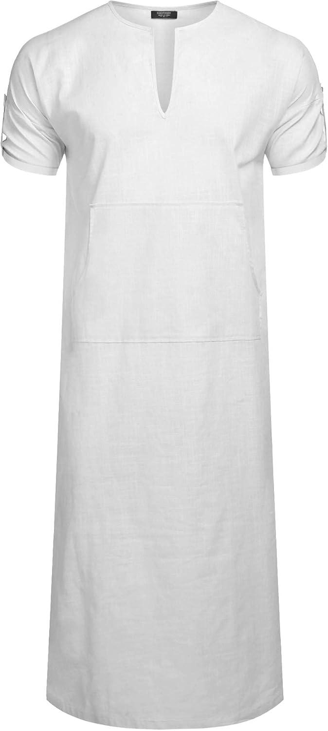 COOFANDY Men’s V-Neck Linen Robe Short Sleeve Kaftan Thobe Long Gown Casual Shirt for Beach, Summer(01-white)