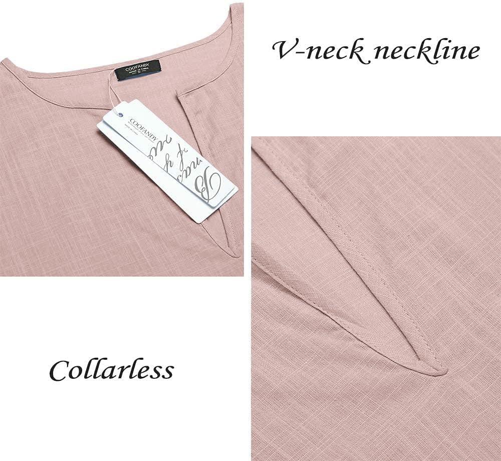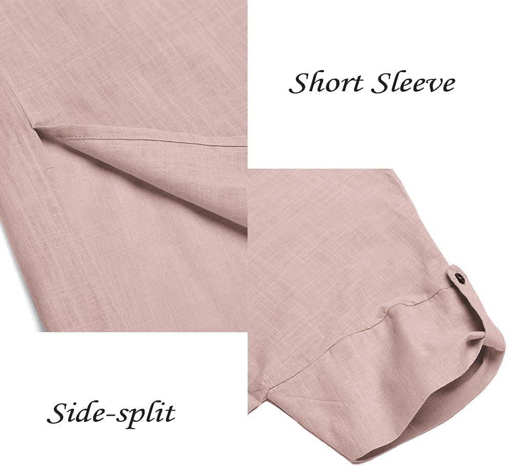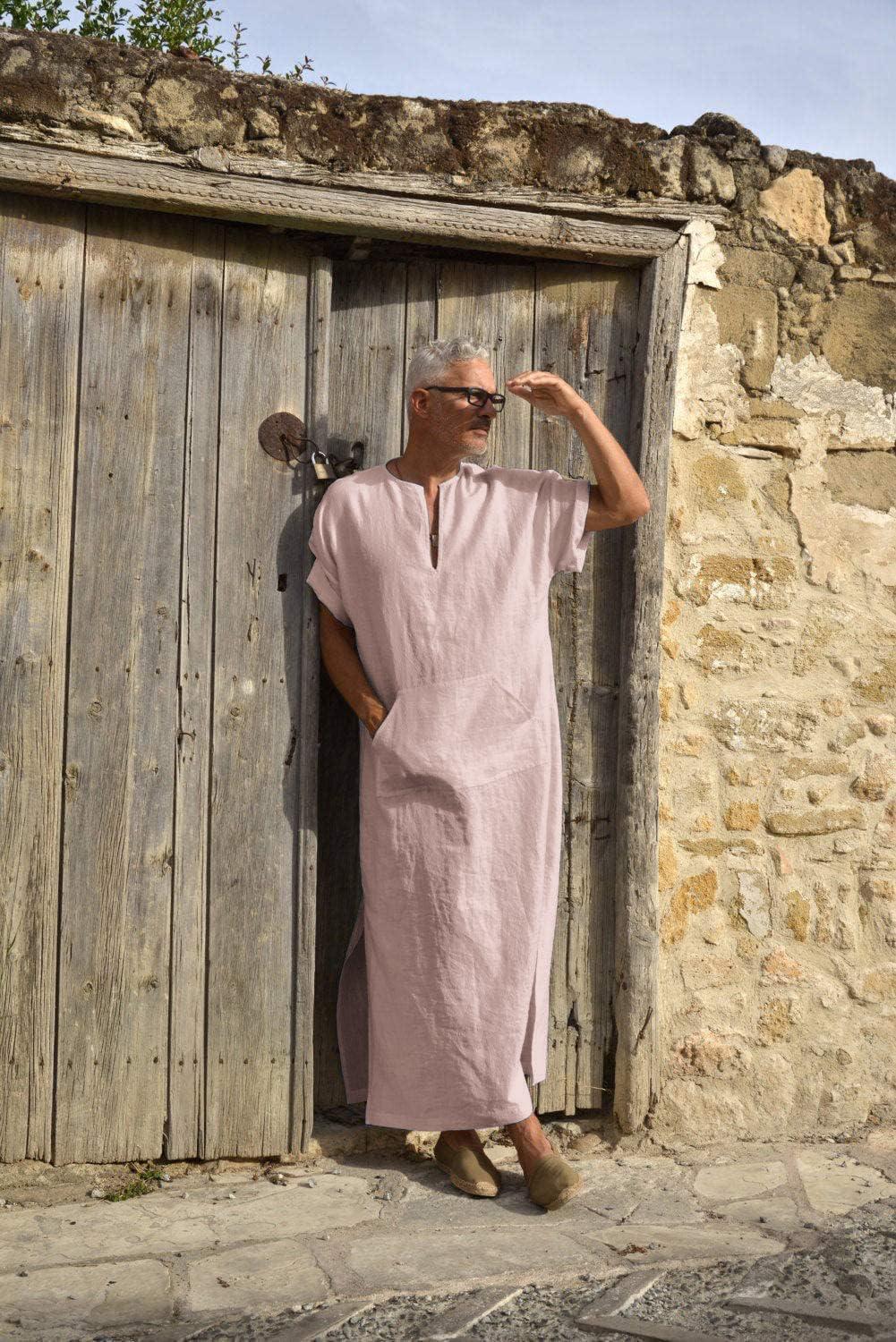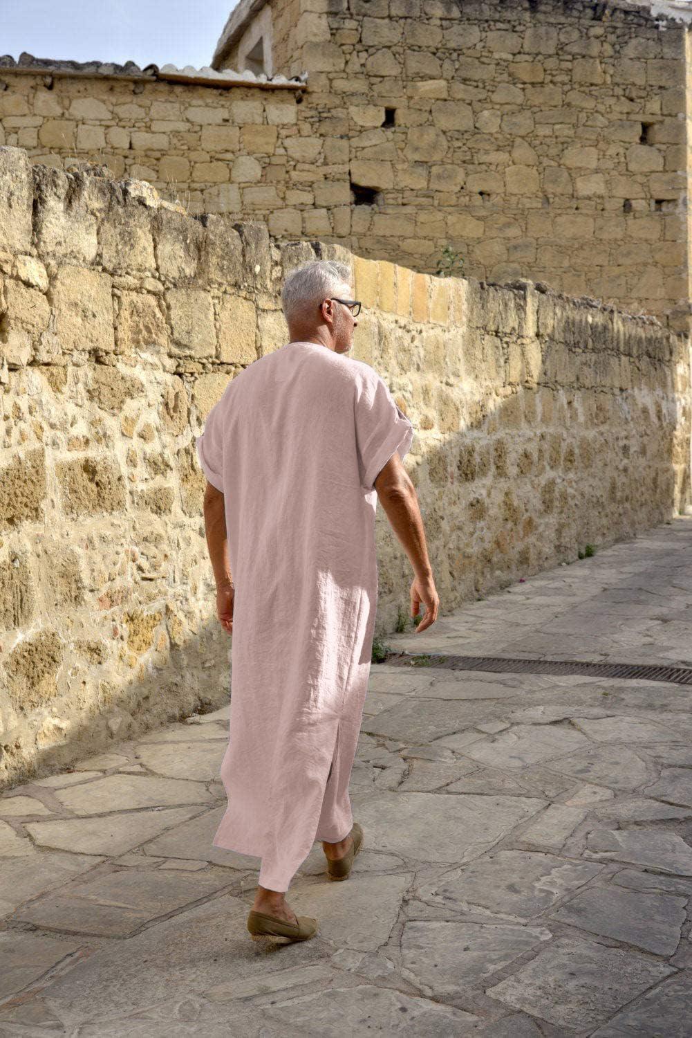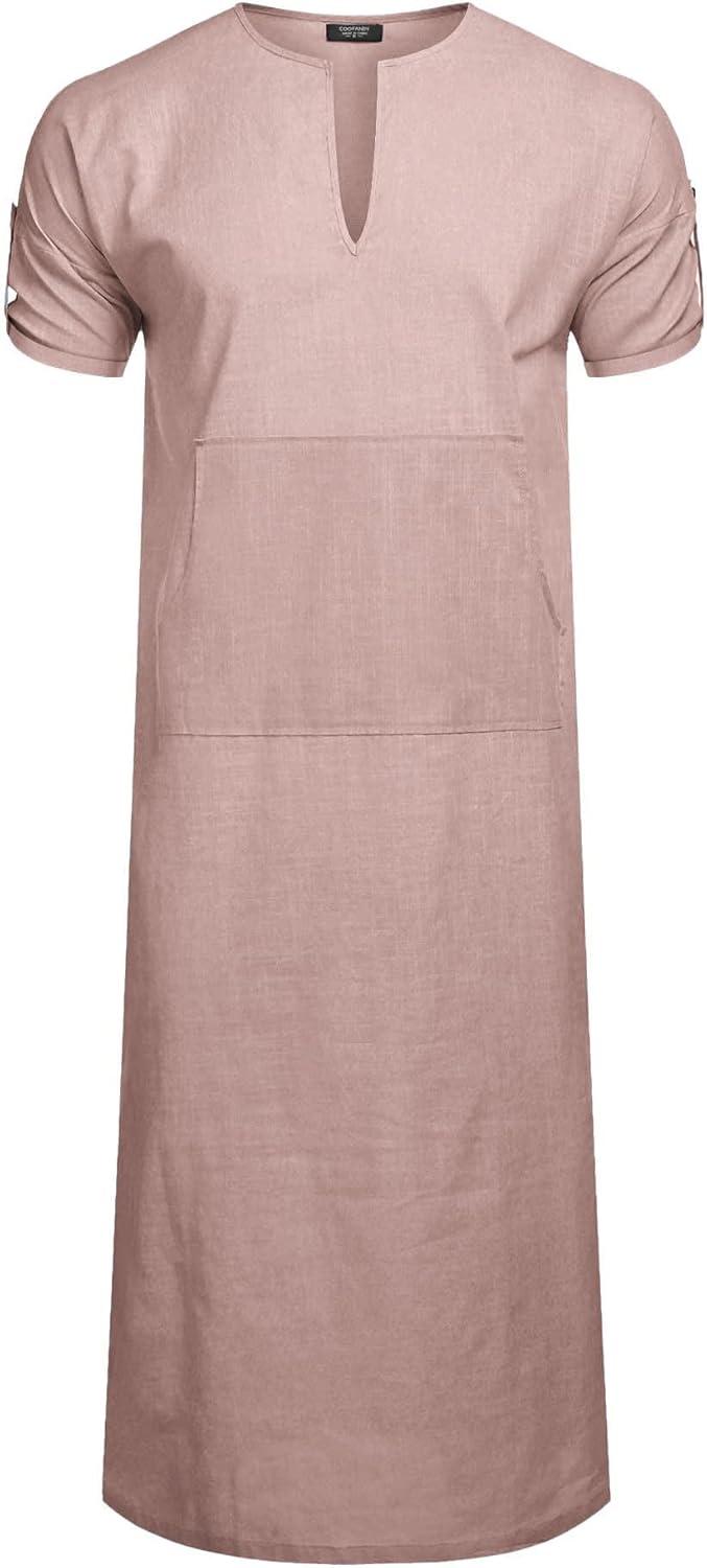 COOFANDY Men’s V-Neck Linen Robe Short Sleeve Kaftan Thobe Long Gown Casual Shirt for Beach, Summer(Dark Pink)