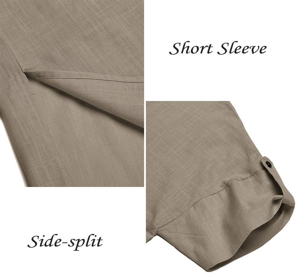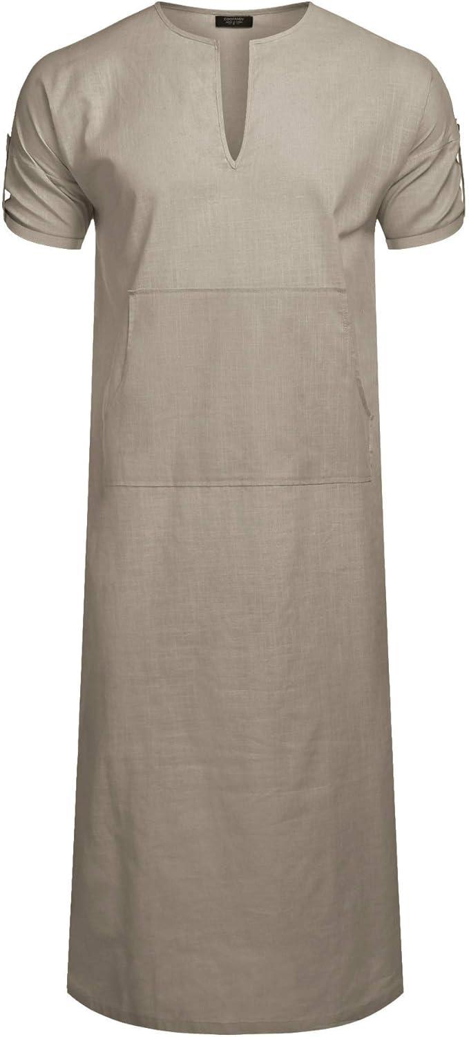 COOFANDY Men's V-Neck Linen Robe Short Sleeve Kaftan Thobe Long Gown Casual Shirt for Beach, Summer(Khaki)