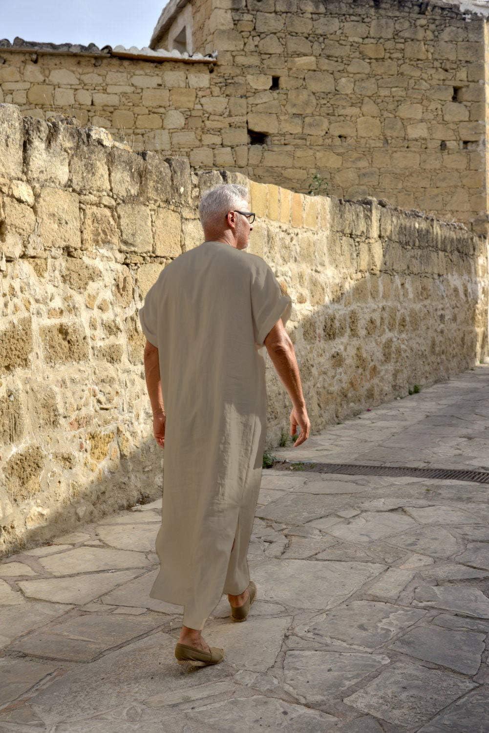 COOFANDY Men’s V-Neck Linen Robe Short Sleeve Kaftan Thobe Long Gown Casual Shirt for Beach, Summer(Khaki)