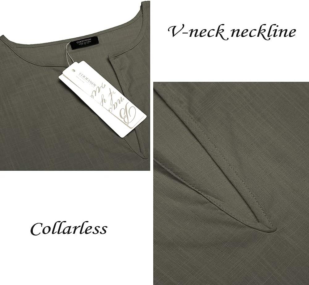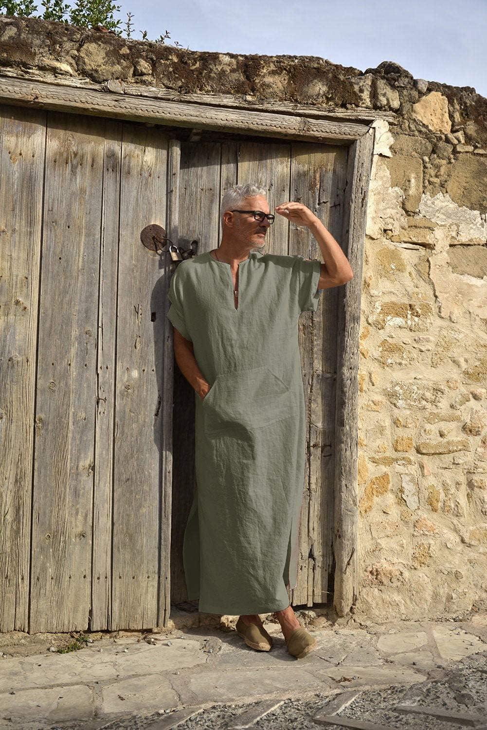 COOFANDY Men's V-Neck Linen Robe Short Sleeve Kaftan Thobe Long Gown Casual Shirt for Beach, Summer(Olive Green)