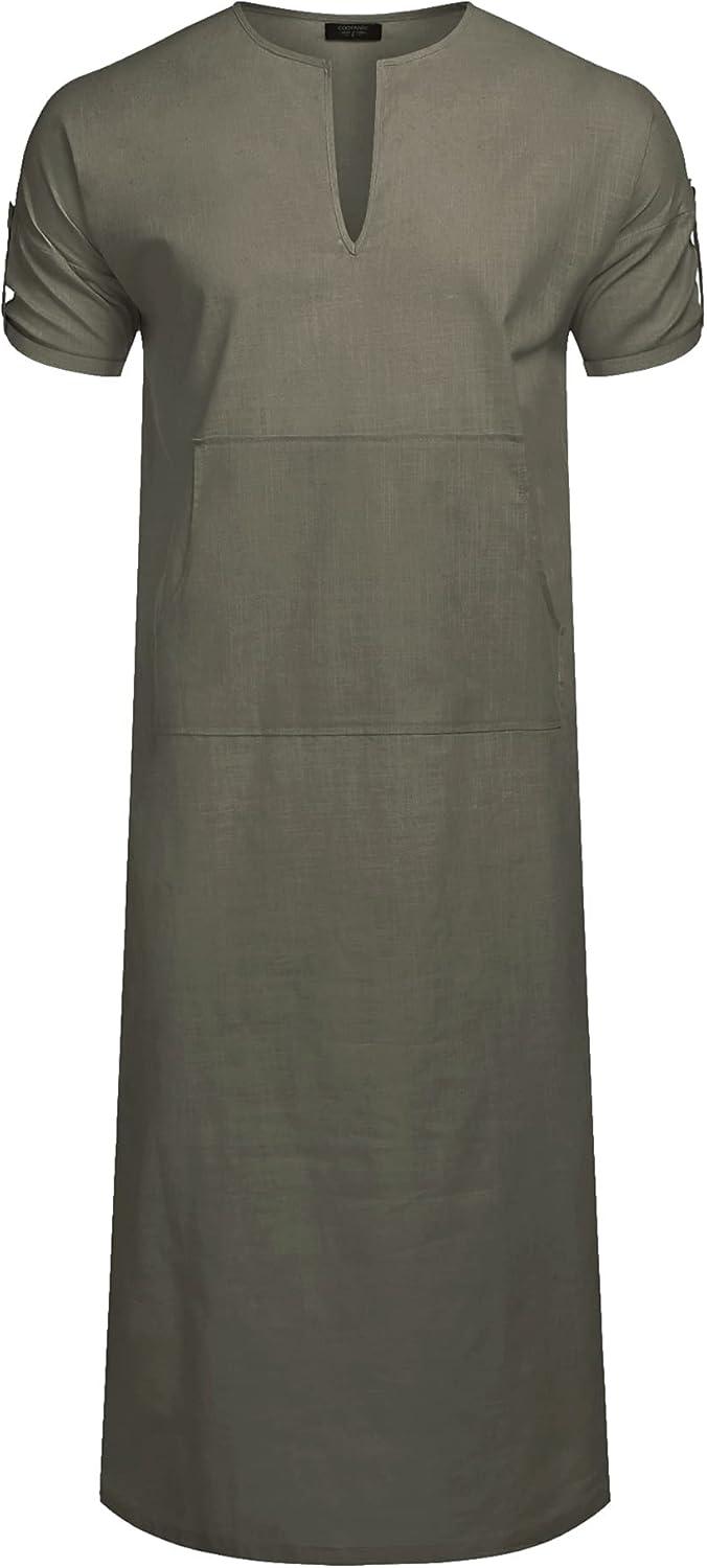 COOFANDY Men’s V-Neck Linen Robe Short Sleeve Kaftan Thobe Long Gown Casual Shirt for Beach, Summer(Olive Green)