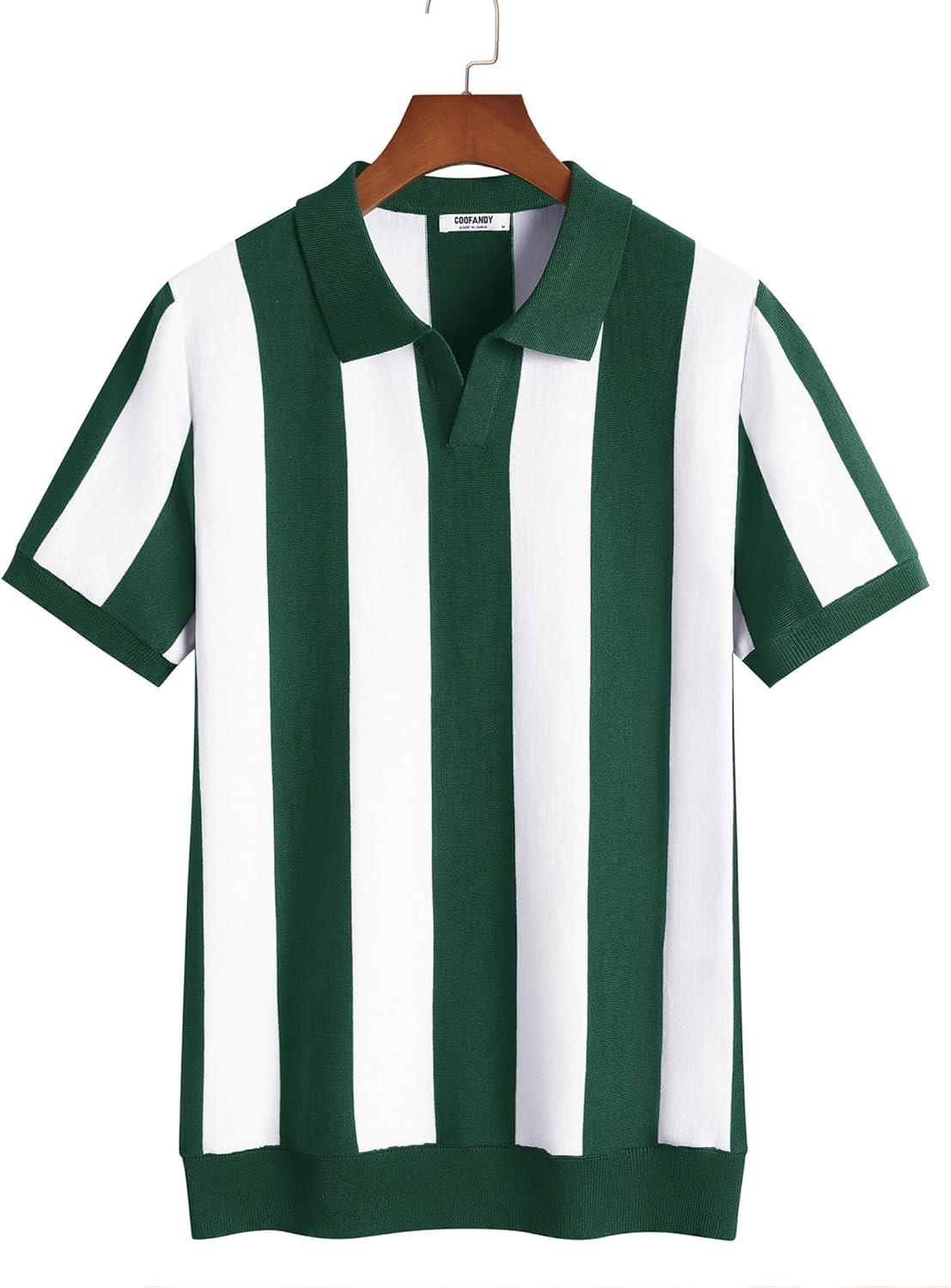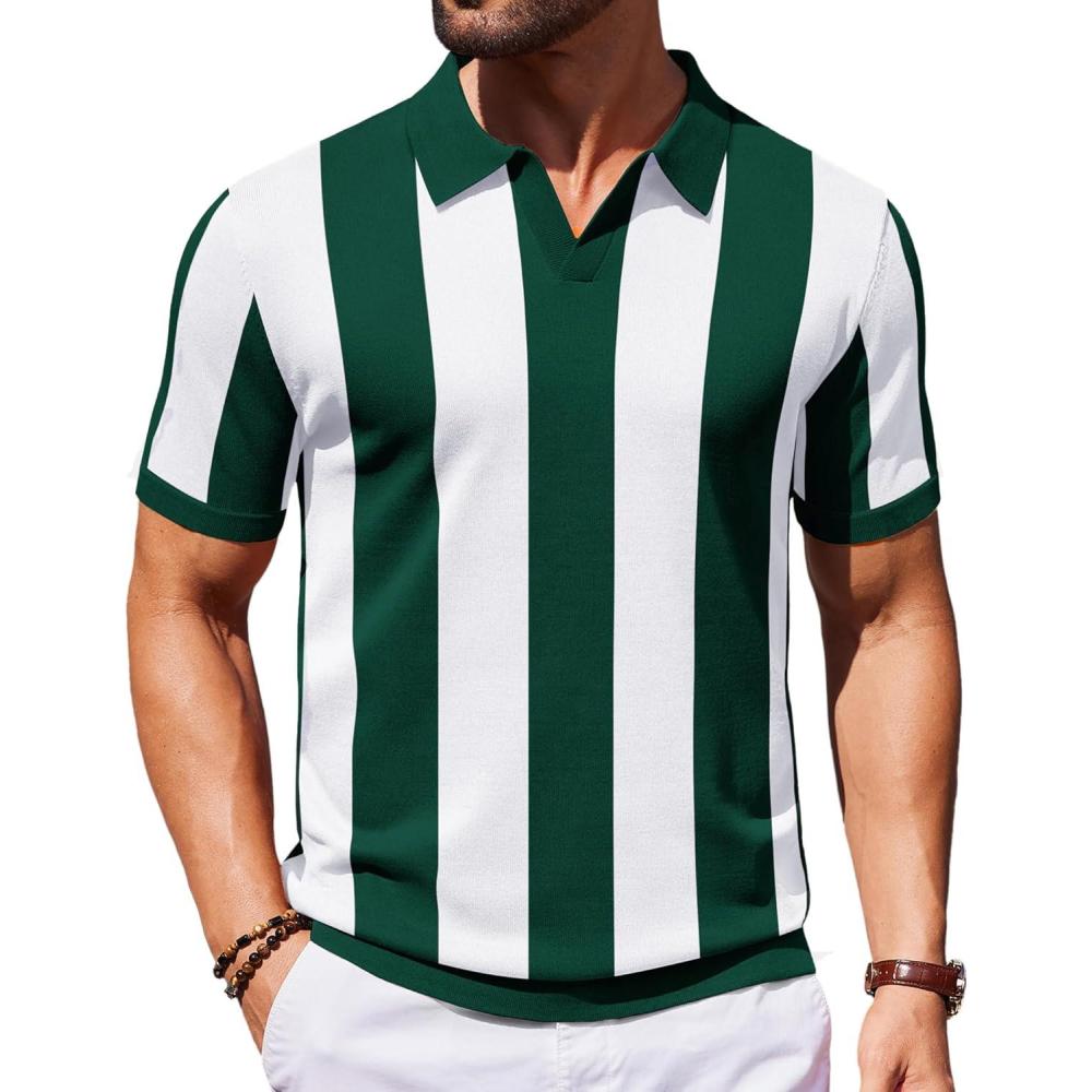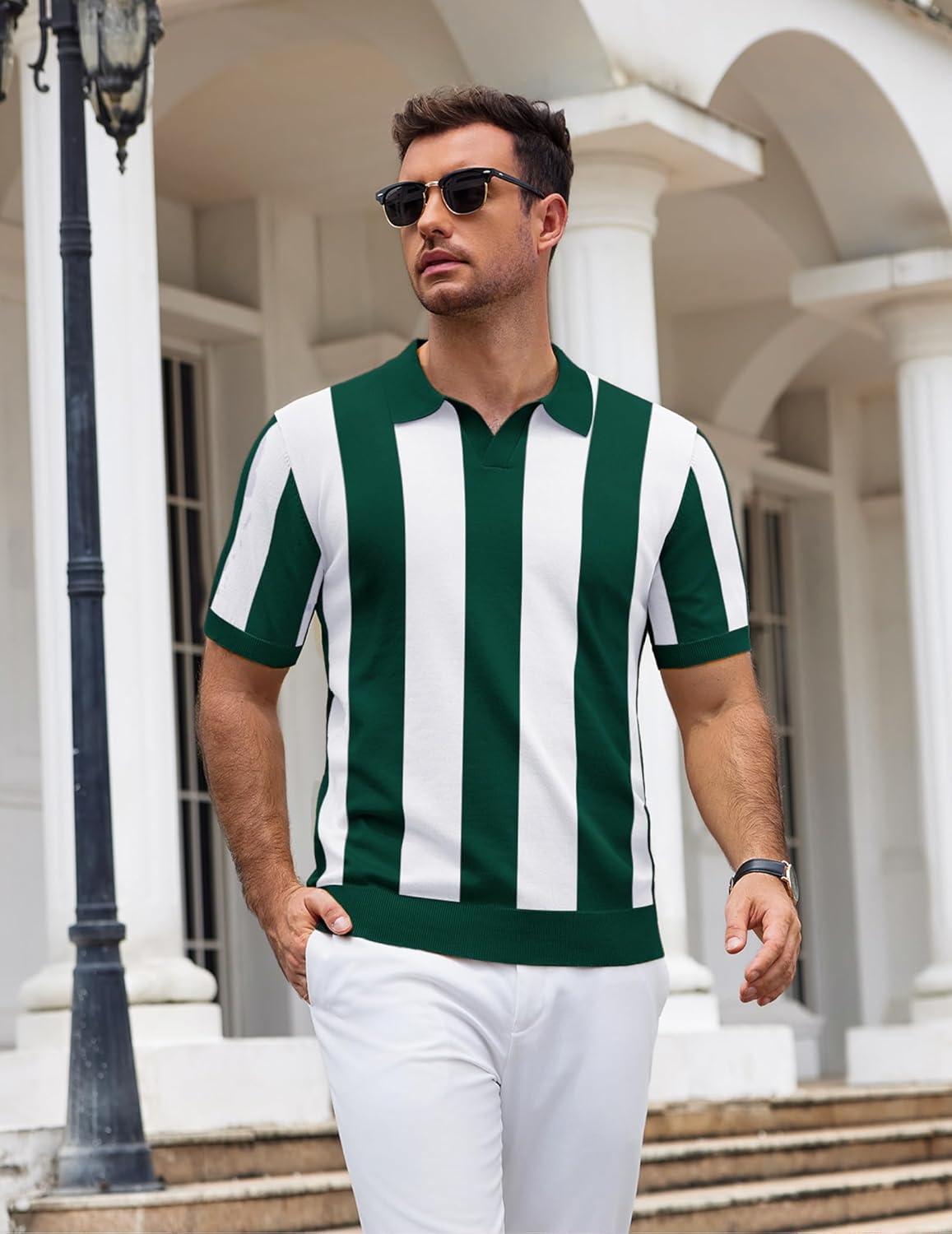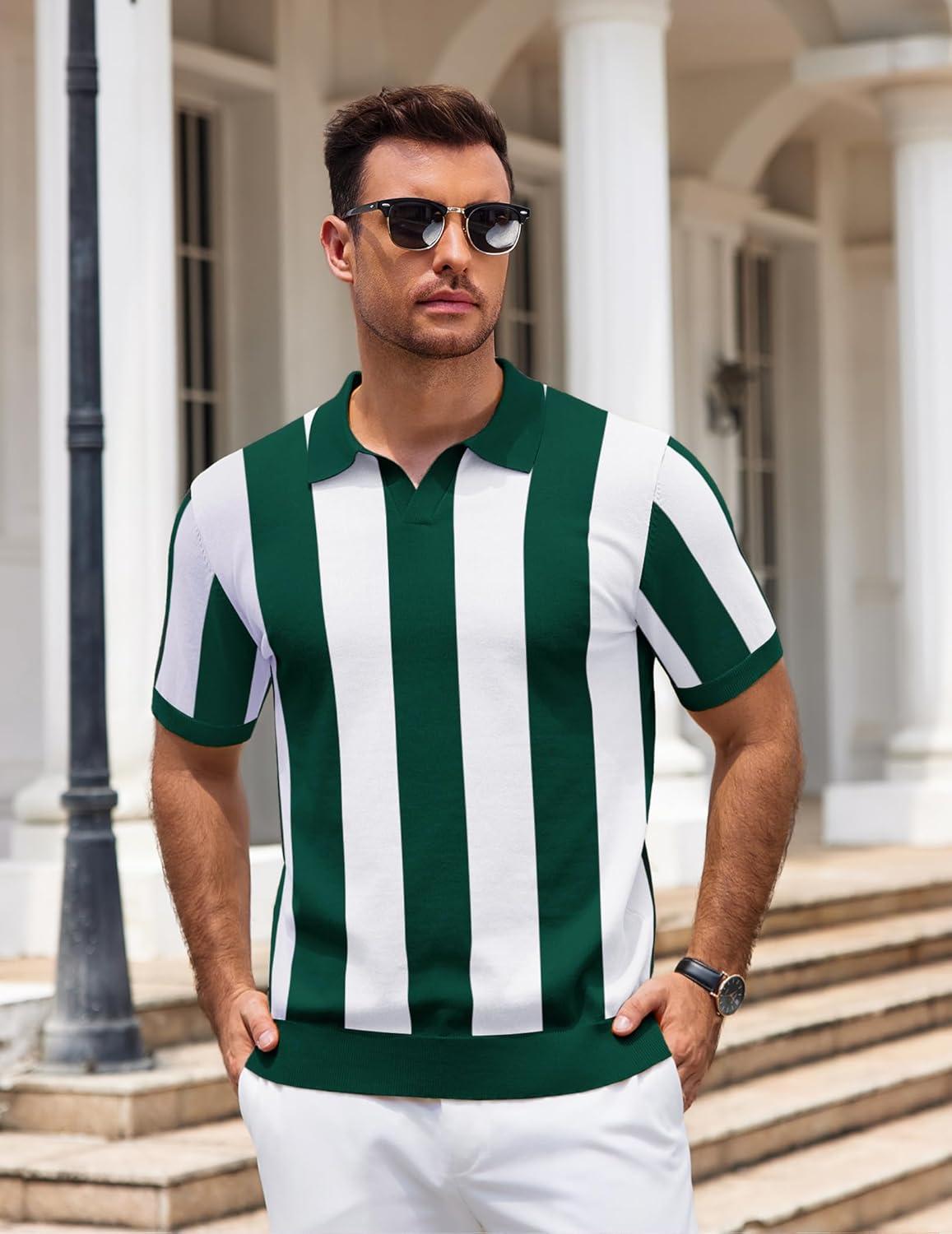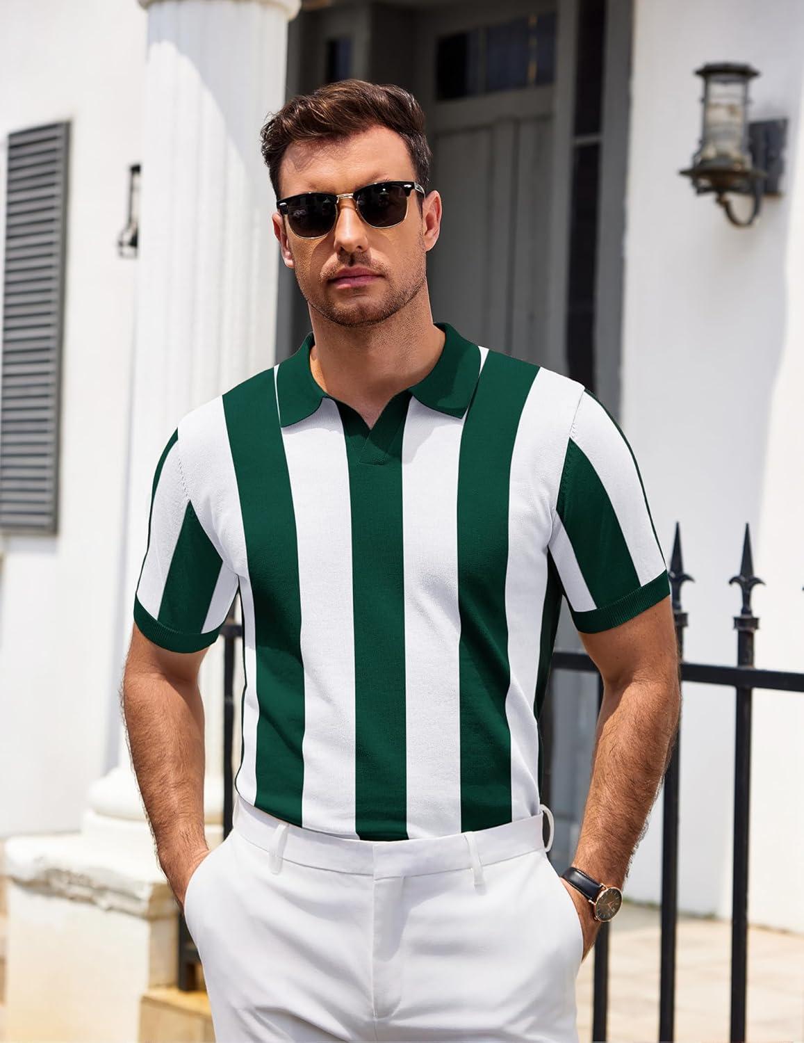 COOFANDY Men’s V Neck Short Sleeve Stretch Knit Polo Shirt(Green – White Stripes)