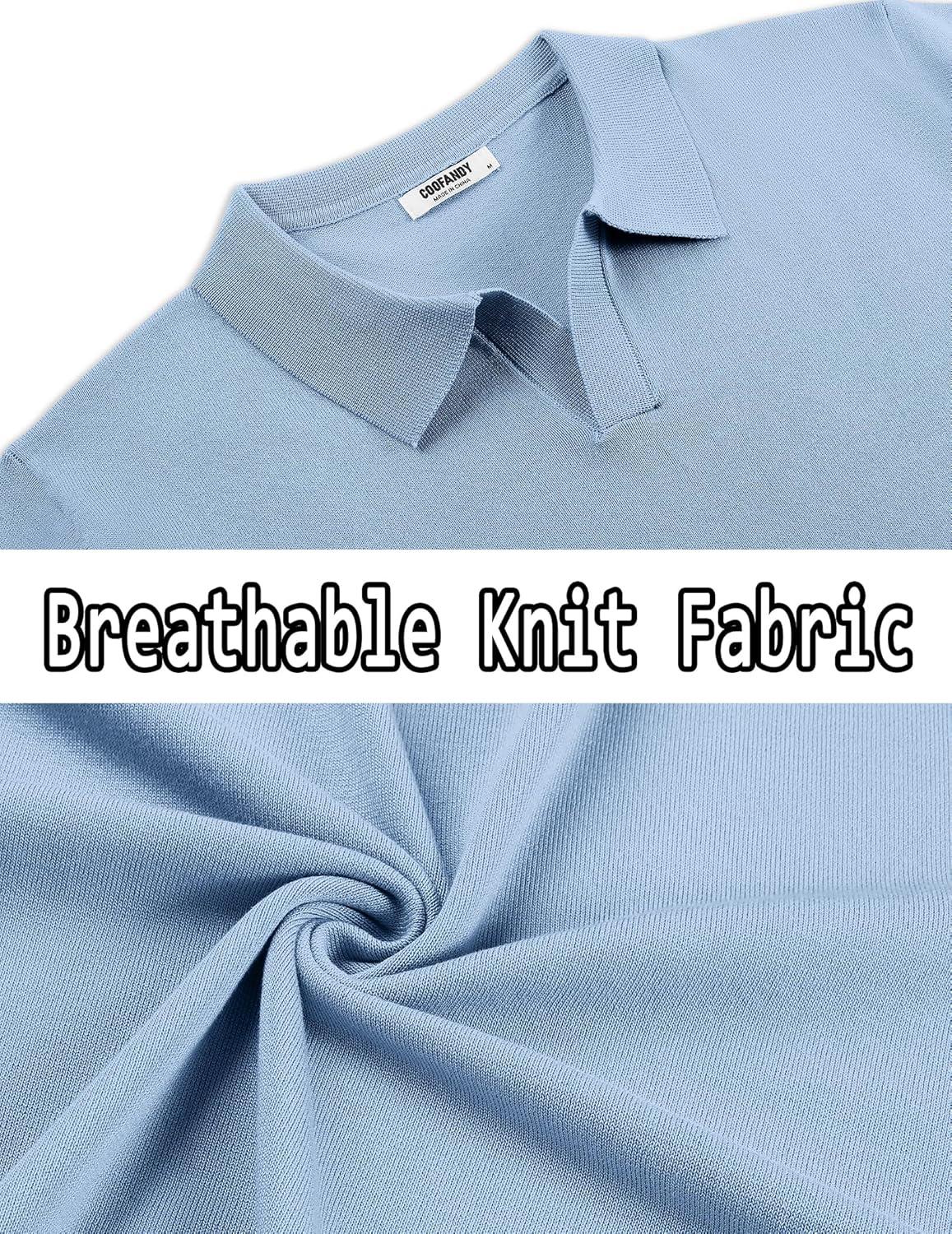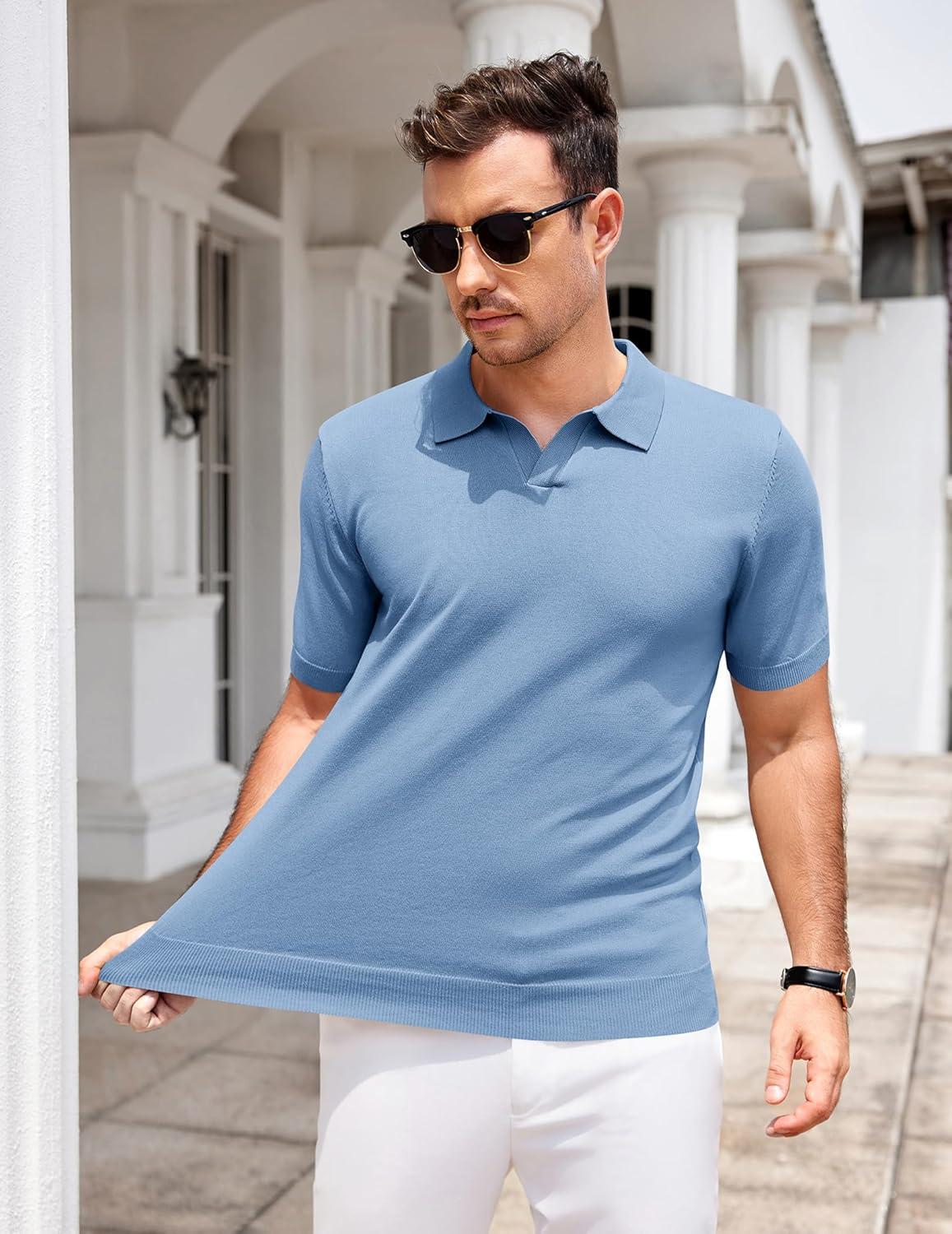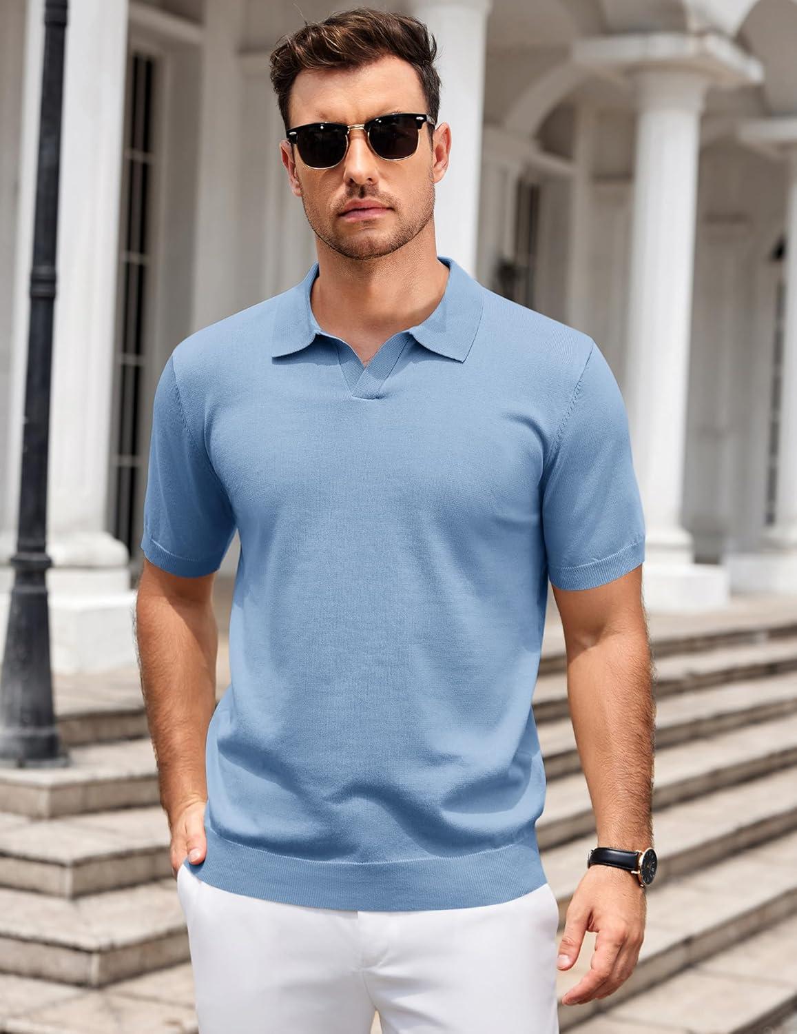 COOFANDY Men’s V Neck Short Sleeve Stretch Knit Polo Shirt(Light Blue)