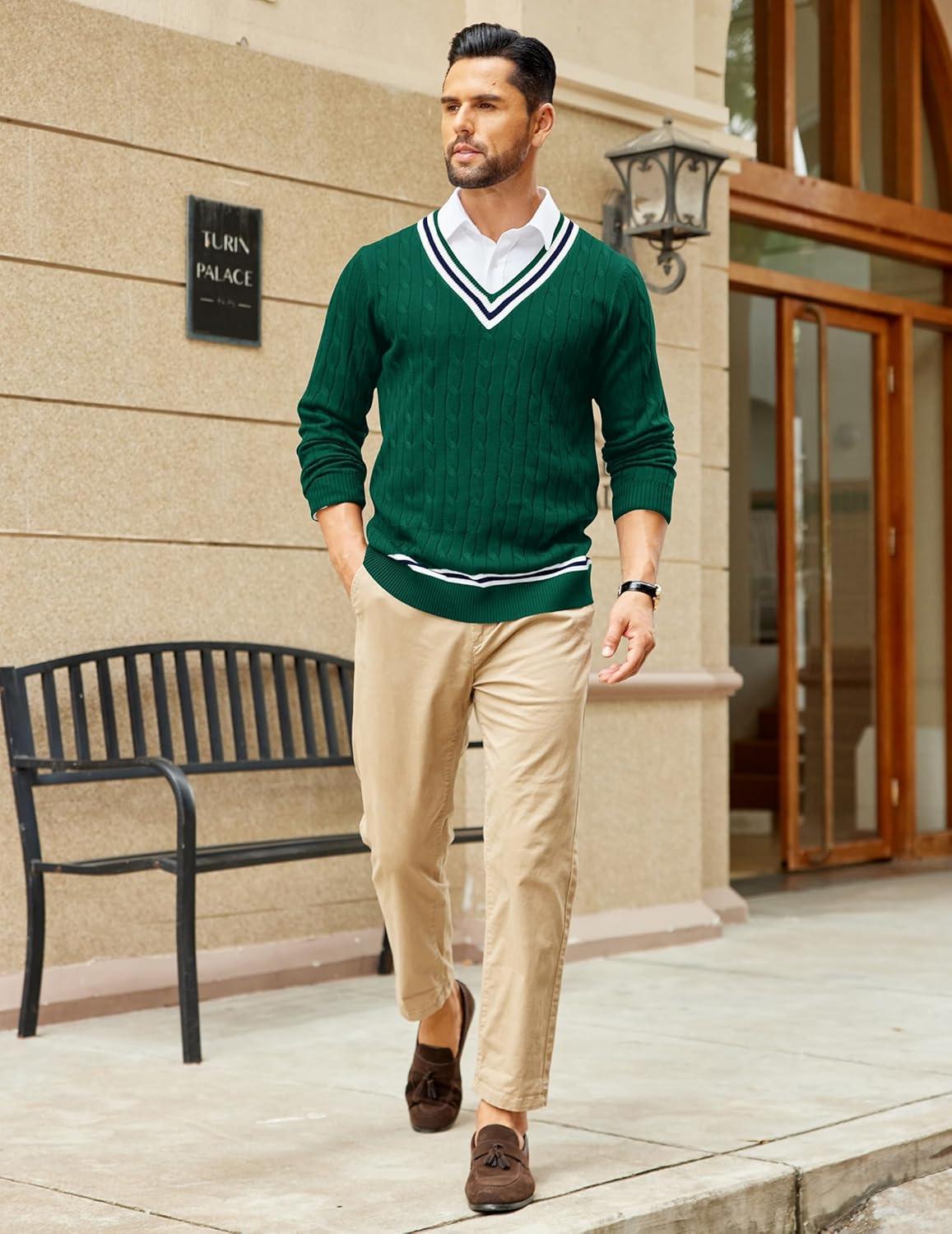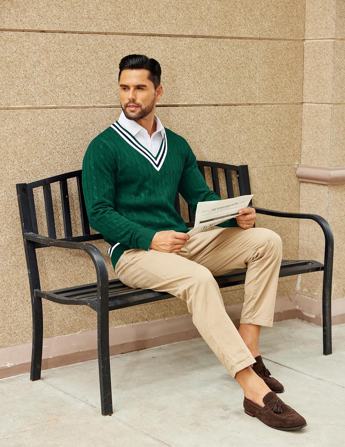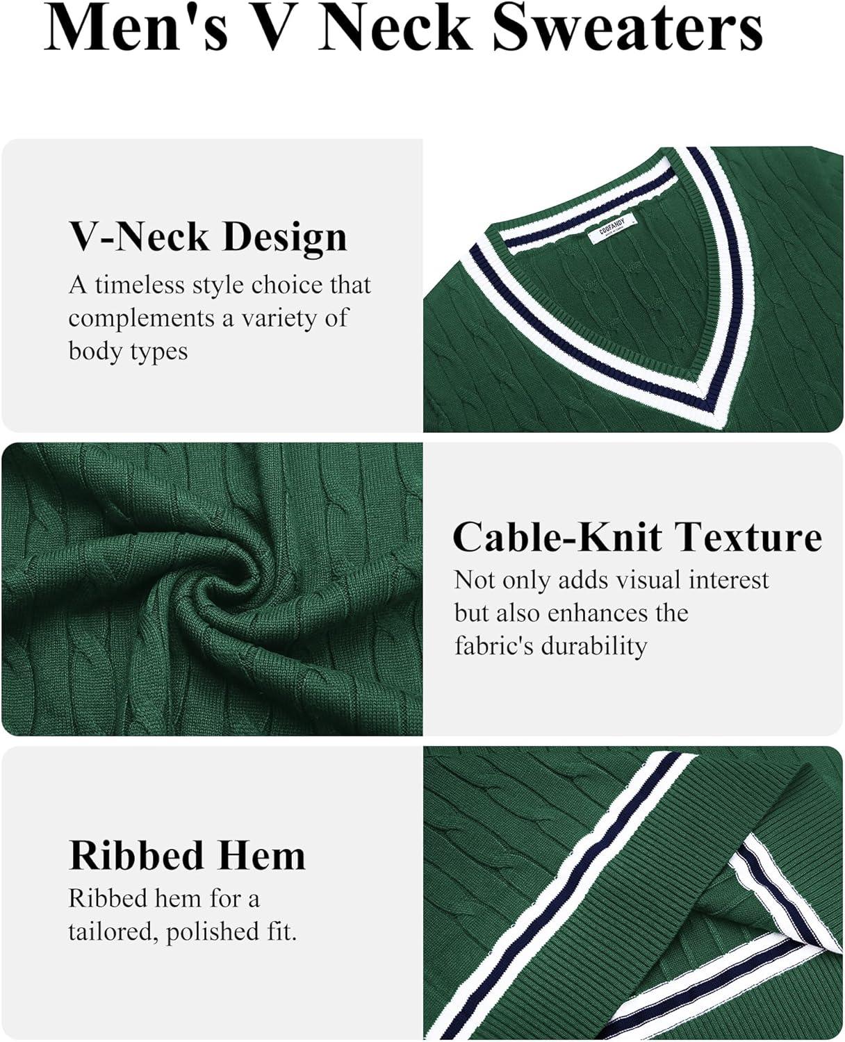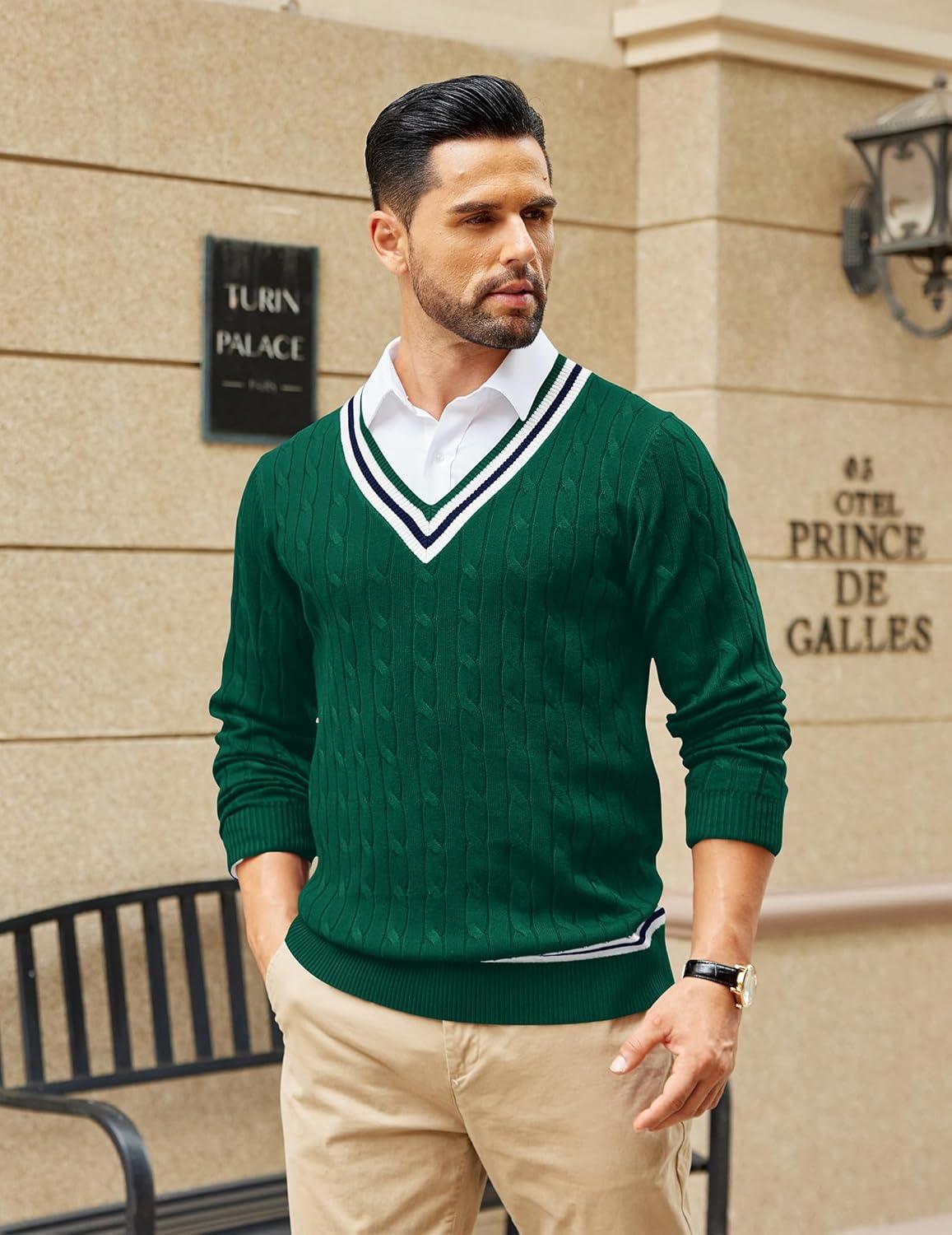 COOFANDY Mens V Neck Sweater Long Sleeve Cable Knit Sweater Fall Winter Pullover Slim Fit Stretchy Fabric Preppy Style(Christmas Green)
