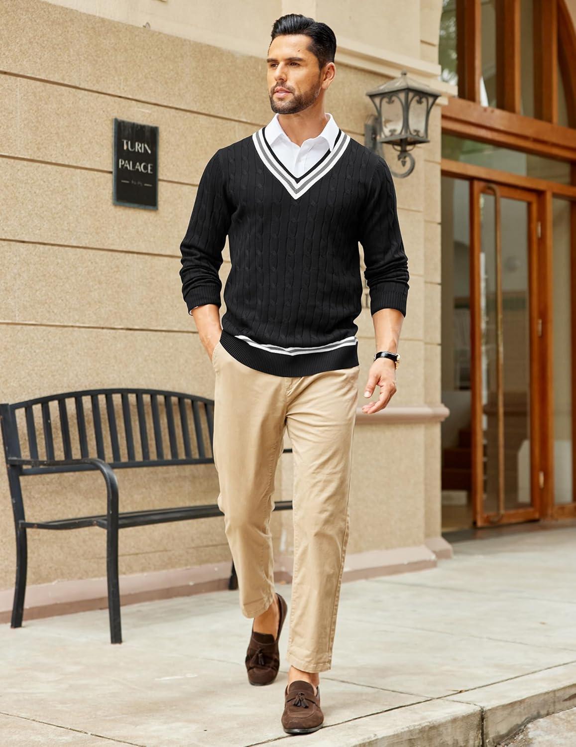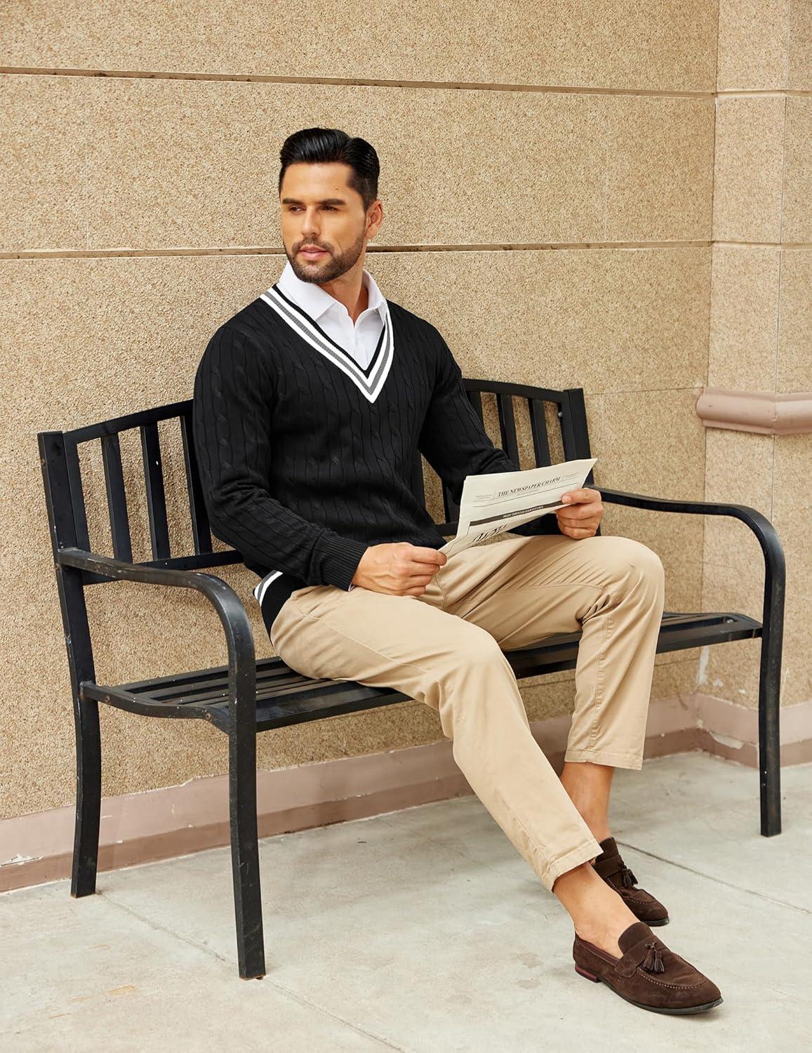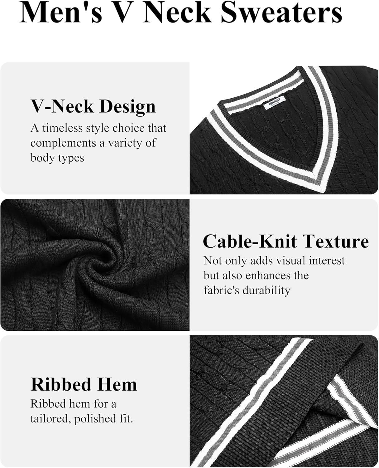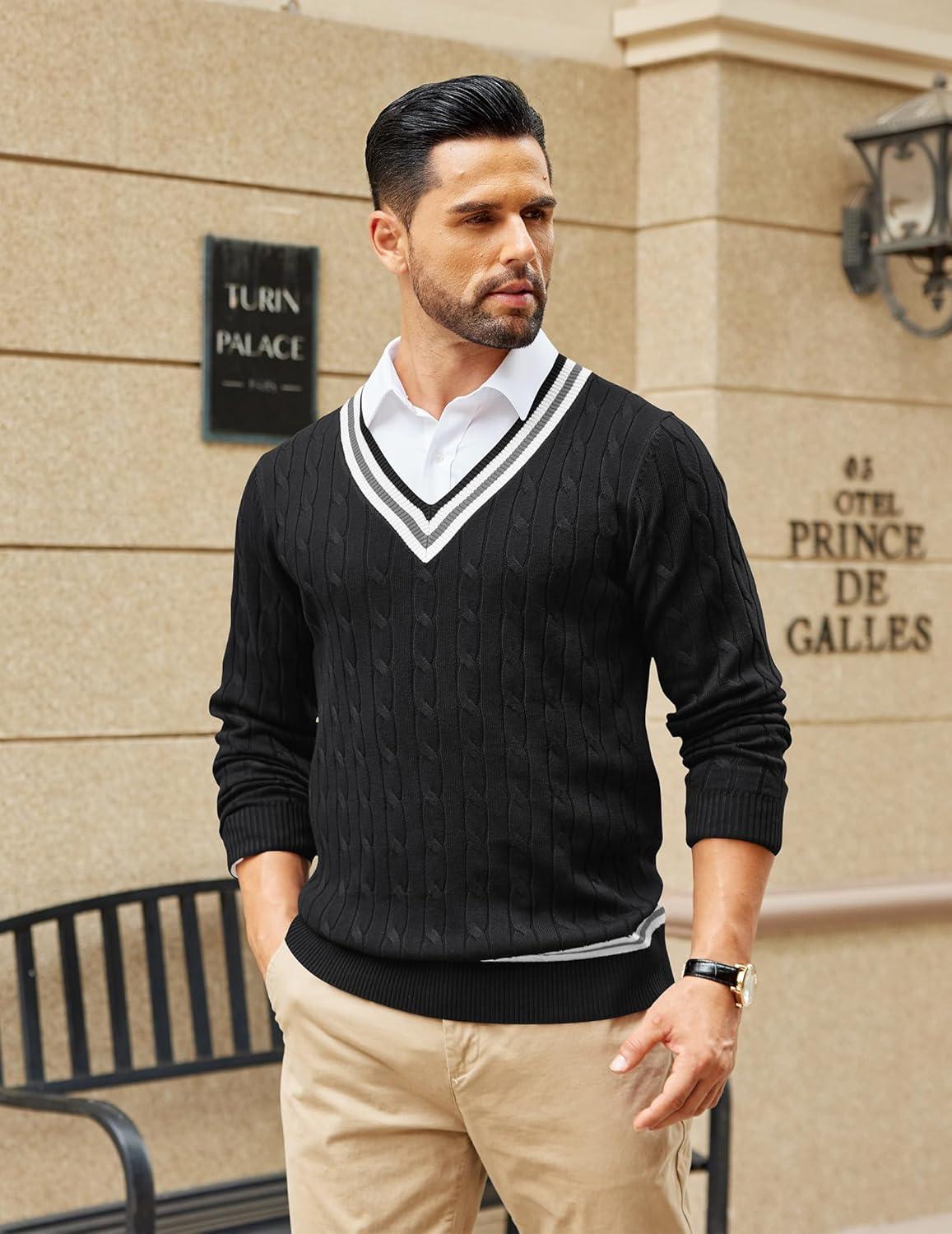 COOFANDY Mens V Neck Sweater Long Sleeve Cable Knit Sweater Fall Winter Pullover Slim Fit Stretchy Fabric Preppy Style(Ink Black)