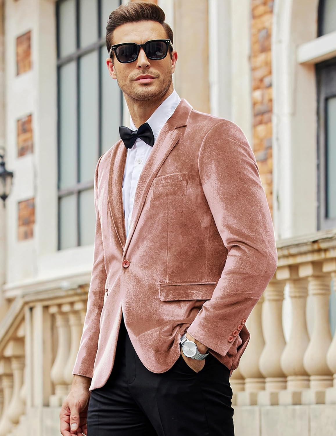 imageCOOFANDY Mens Velvet Blazer Notched Lapel Velour Suit Jacket One Button Tuxedo Jackets for Wedding Prom Party DinnerBeige Pink