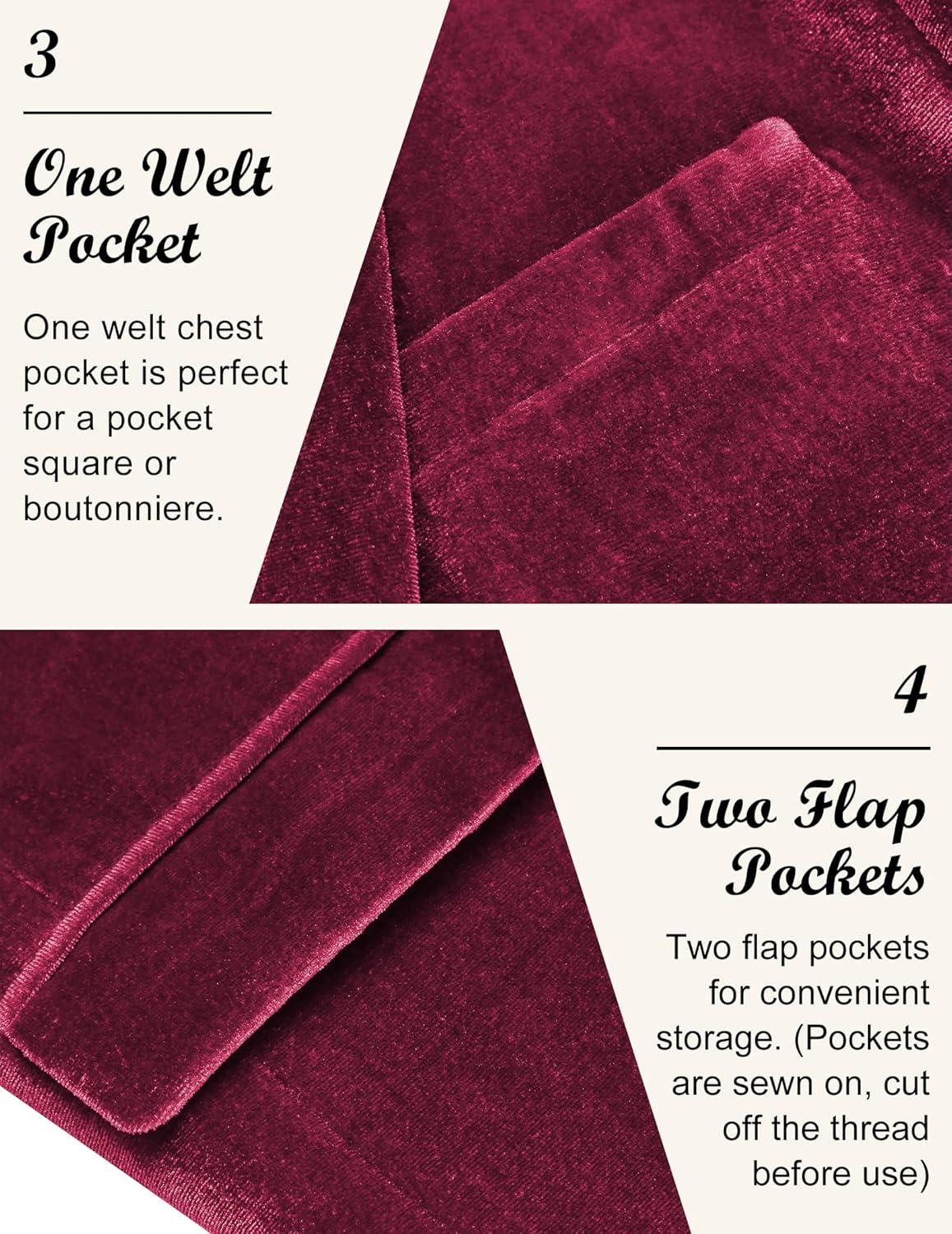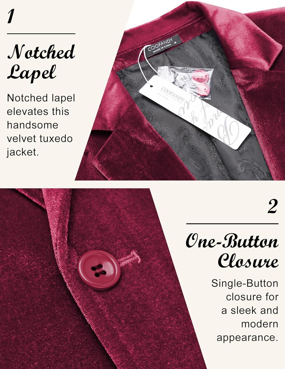 Don’t miss out on our limited-time offer: buy COOFANDY Men’s Velvet Blazer Notched Lapel Velour Suit Jacket One Button Tuxedo Jackets for Wedding Prom Party Dinner(Dark Red), get {accessory} 50% off!