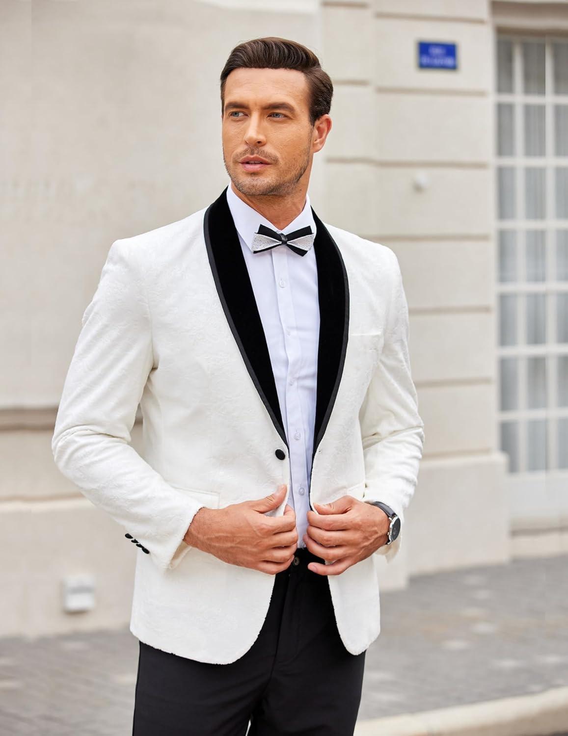 COOFANDY Men’s Velvet Tuxedo Floral Blazer Jacket One Button Shawl Lapel Suit Jacket for Dinner Prom Party Wedding(White)
