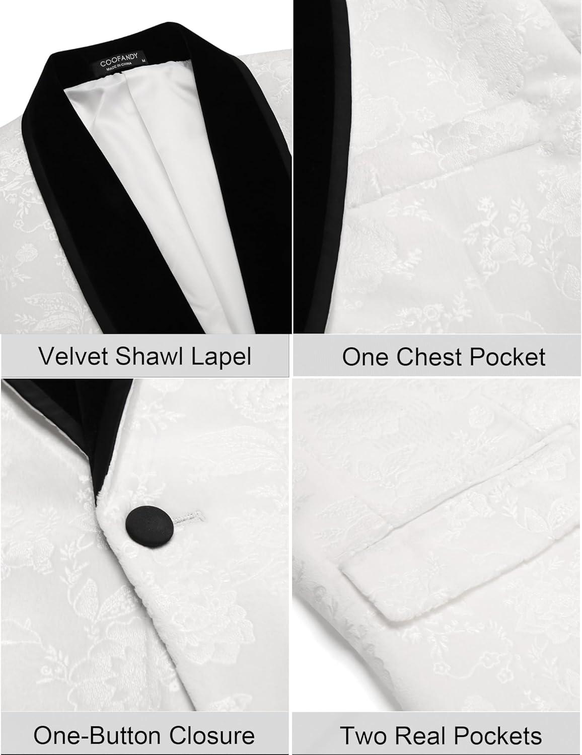 COOFANDY Men's Velvet Tuxedo Floral Blazer Jacket One Button Shawl Lapel Suit Jacket for Dinner Prom Party Wedding(White)