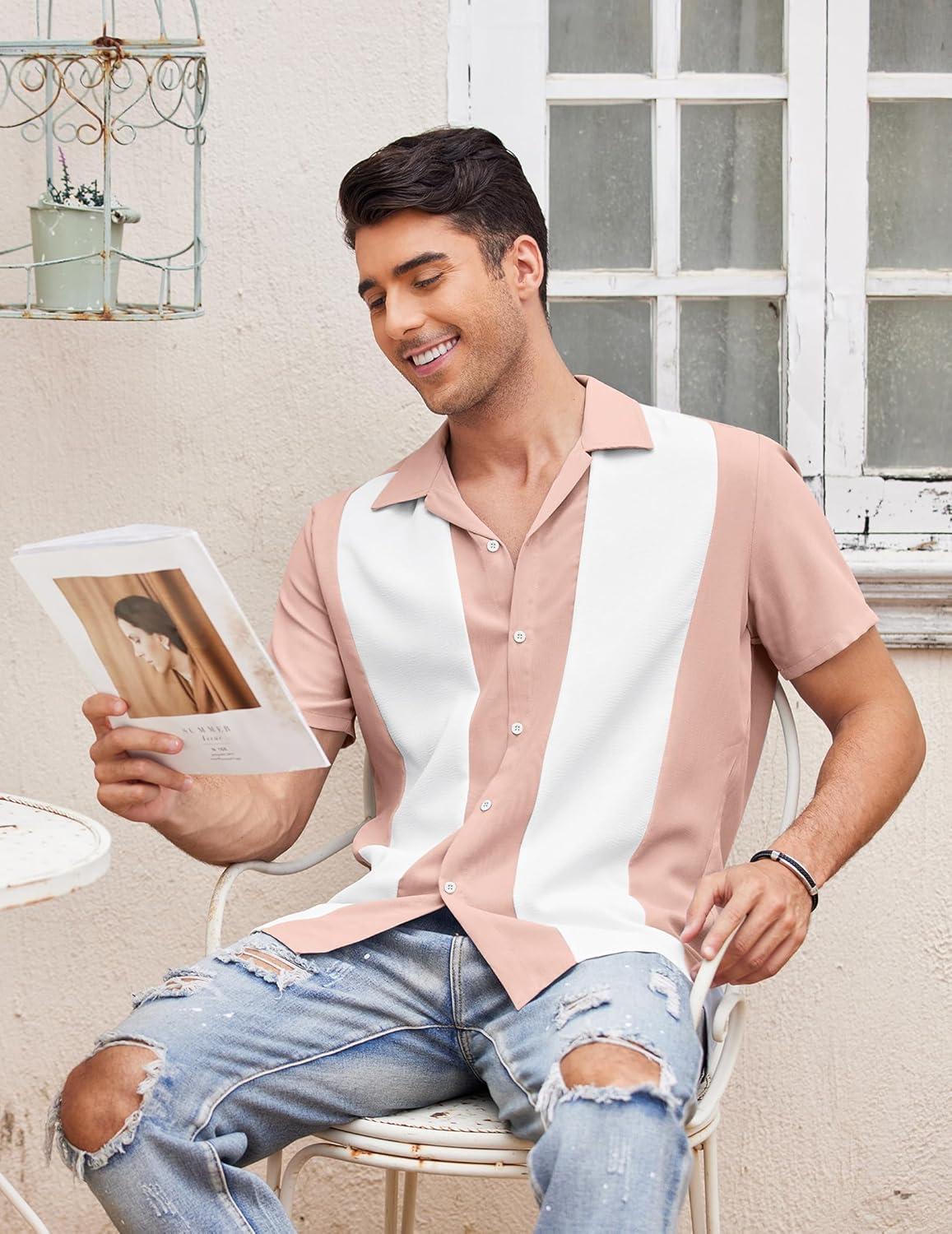 COOFANDY Men’s Vintage Bowling Shirt Short Sleeve Button Down Summer Cuba Beach Shirts(Pink White)