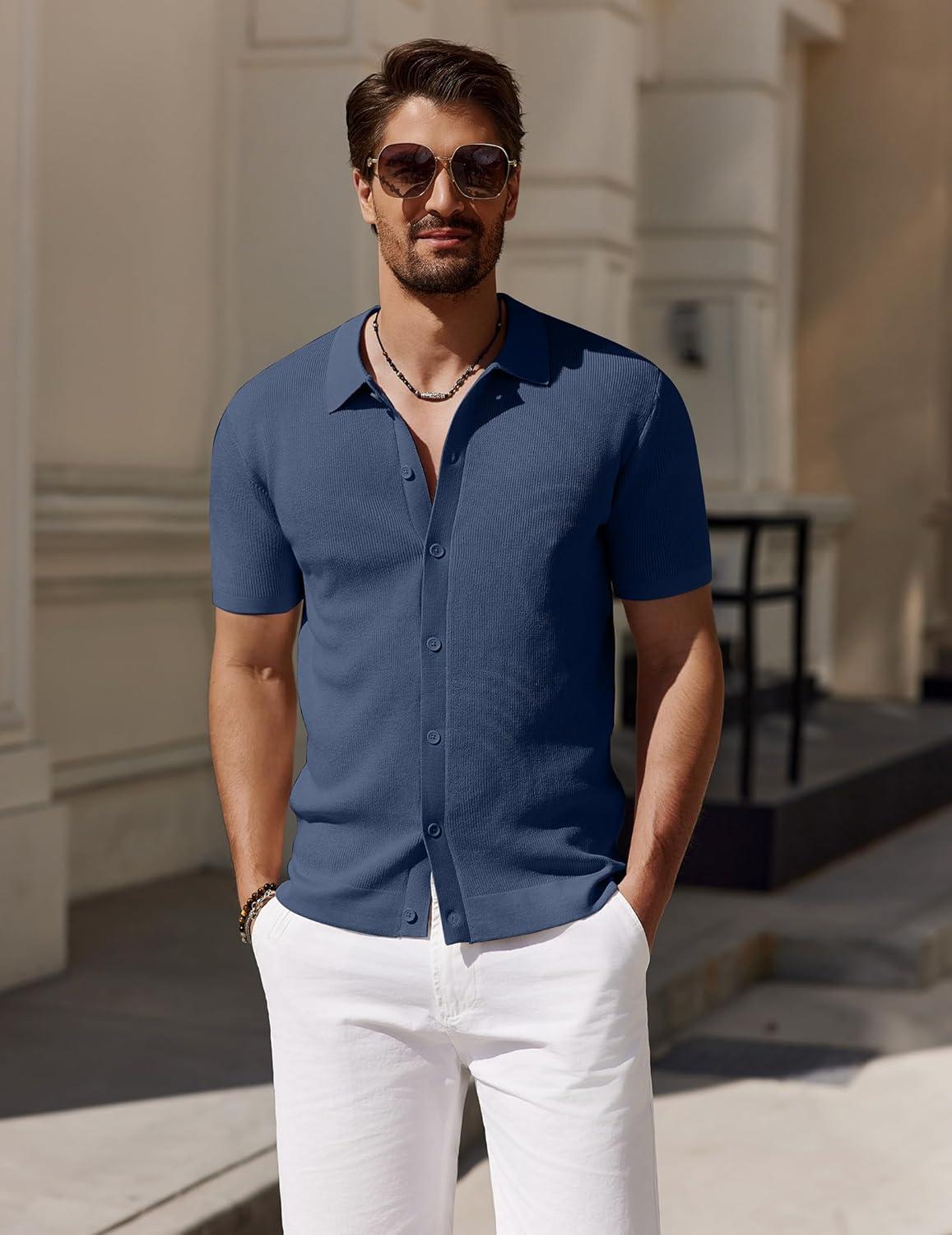 COOFANDY Men’s Vintage Knit Shirt Short Sleeve Button Down Polo Shirts for Summer Casual & Vacation(Navy Blue)