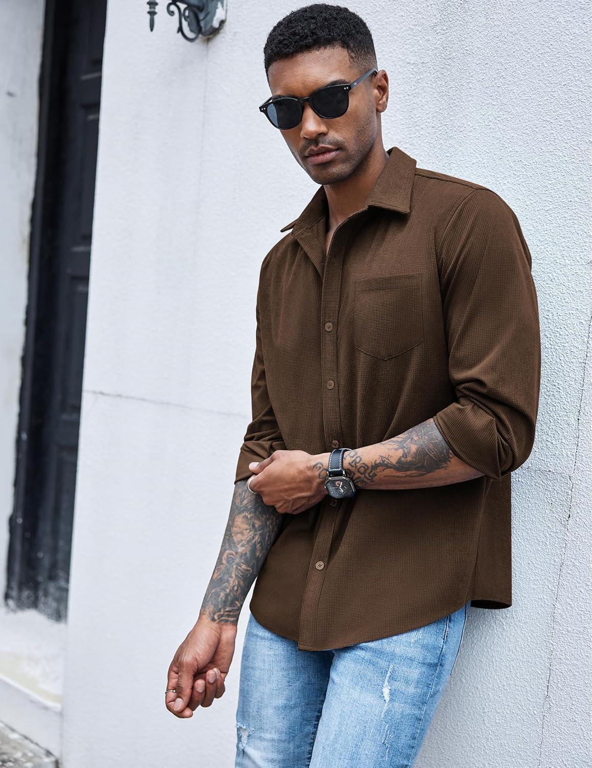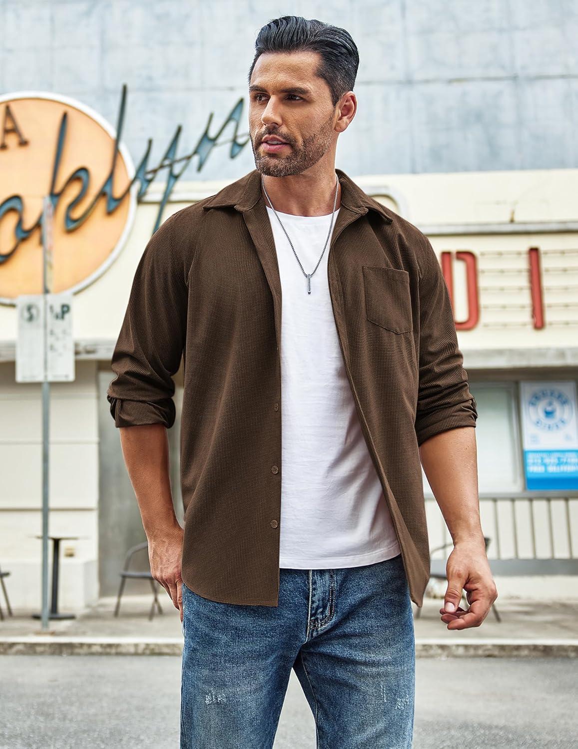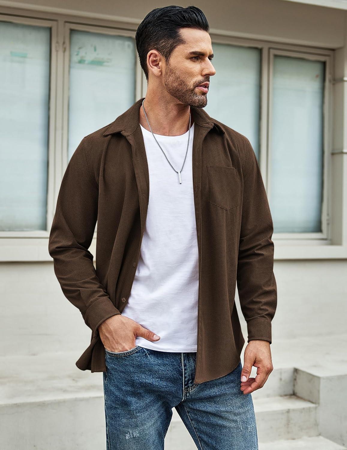COOFANDY Men’s Waffle Button Down Shirts Casual Long Sleeve Shacket Jacket with Pockets(Brown)