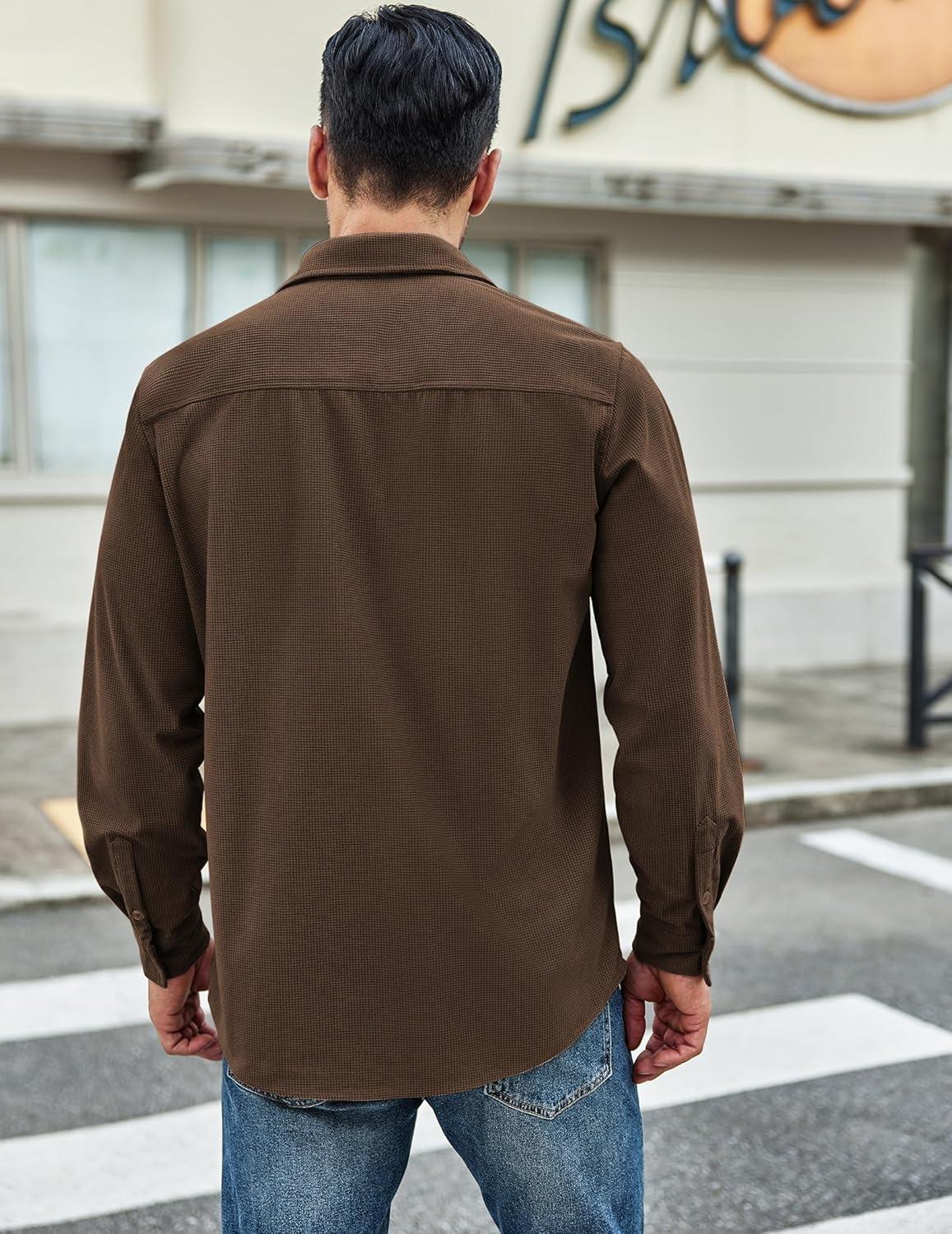 COOFANDY Men's Waffle Button Down Shirts Casual Long Sleeve Shacket Jacket with Pockets(Brown)