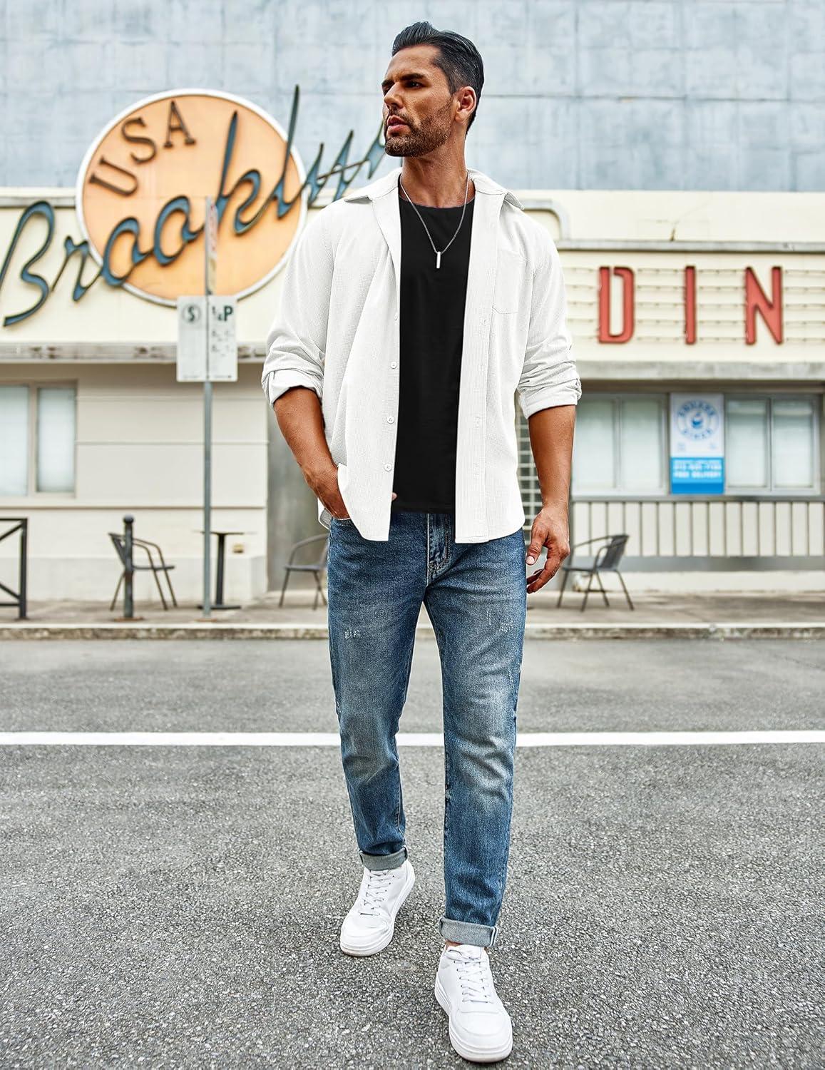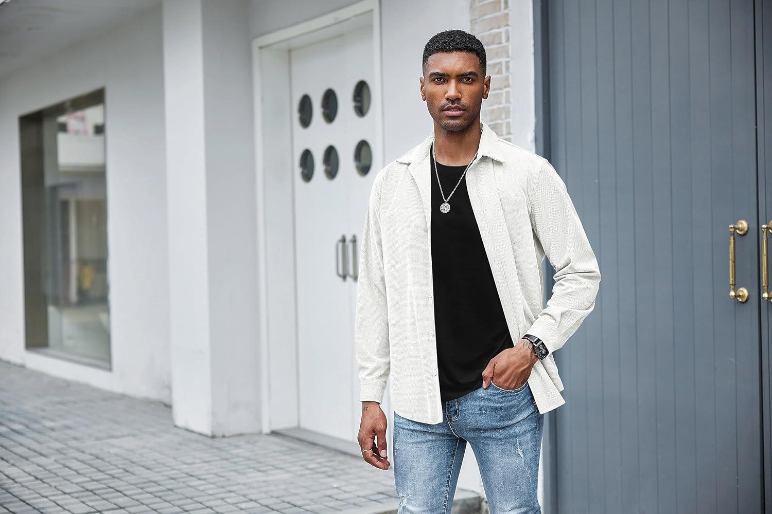 COOFANDY Men’s Waffle Button Down Shirts Casual Long Sleeve Shacket Jacket with Pockets(White)
