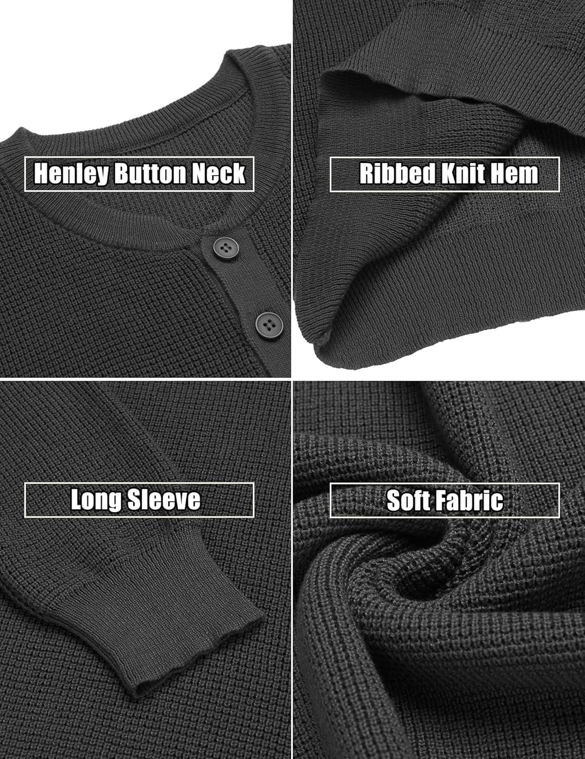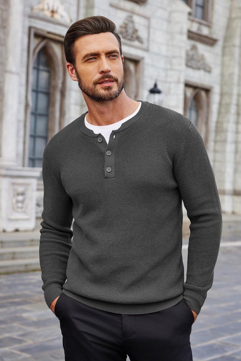 COOFANDY Men's Waffle Henley Shirts Crewneck Lightweight Sweater Long Sleeve Causal Knitted Pullover T Shirt(Dark Grey)