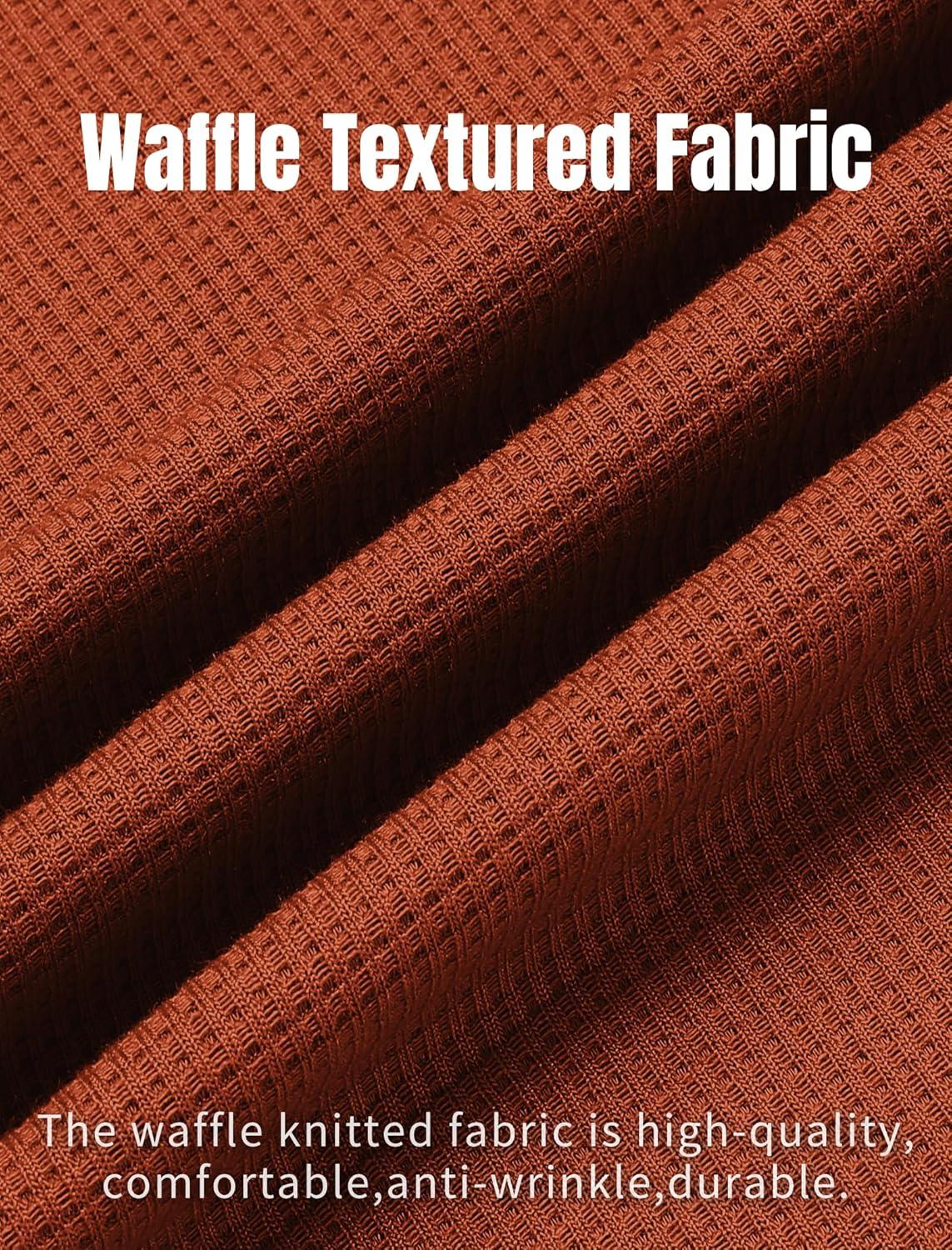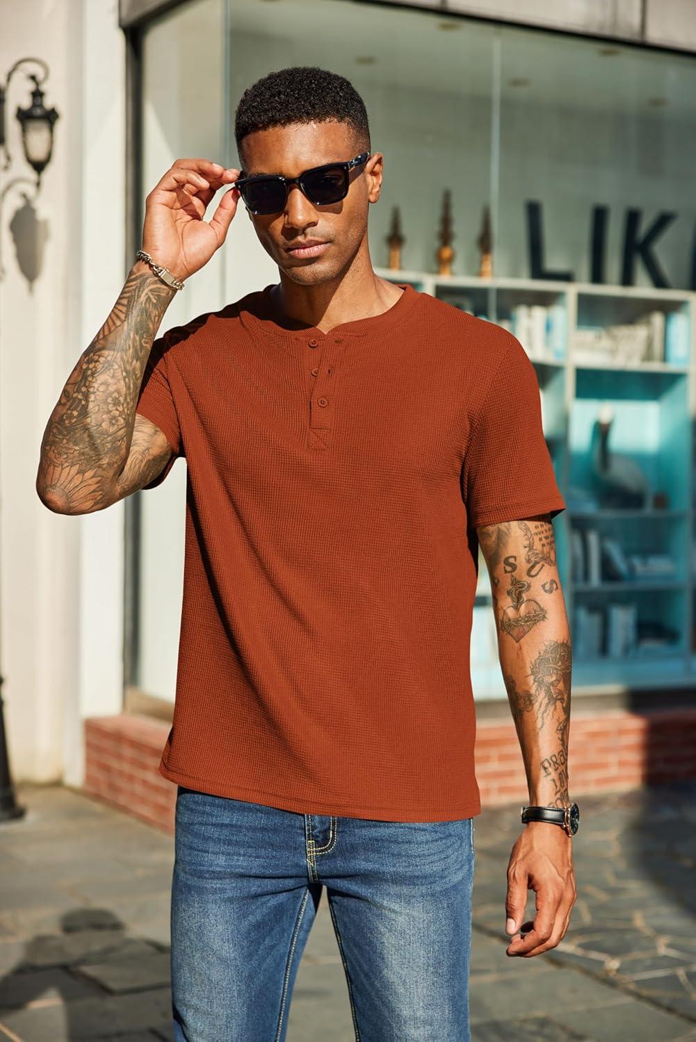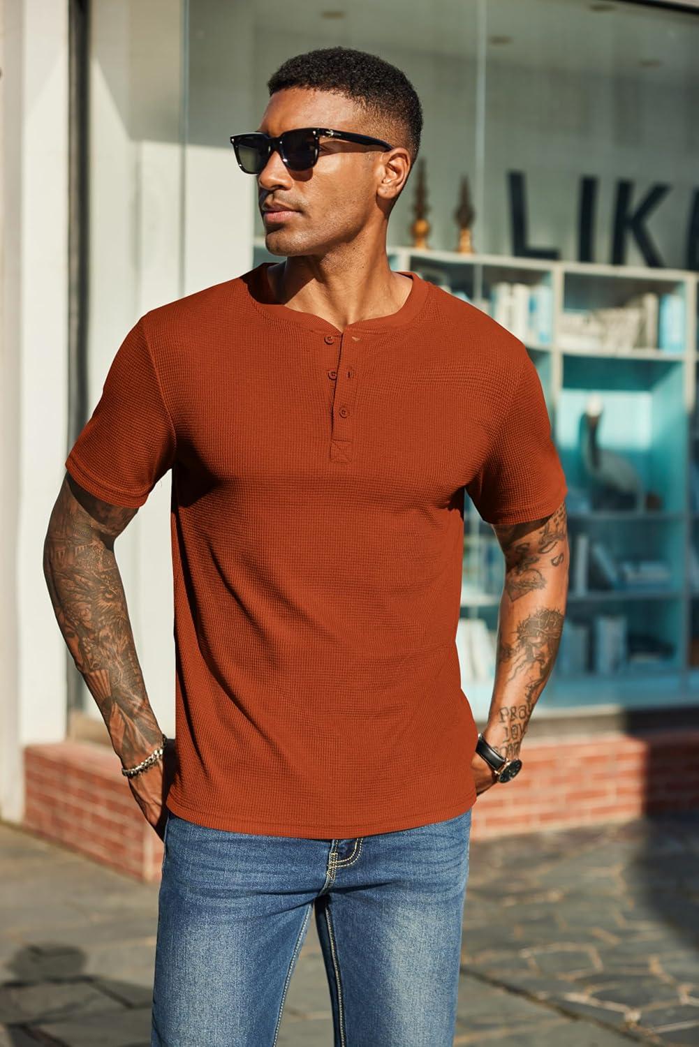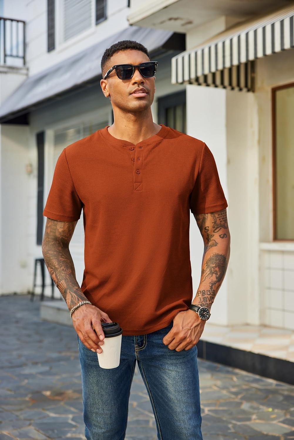 COOFANDY Men’s Waffle Henley Short Sleeve Textured T Shirt Casual Button Tee Shirts Heavyweight Henley Summer Top(Caramel)