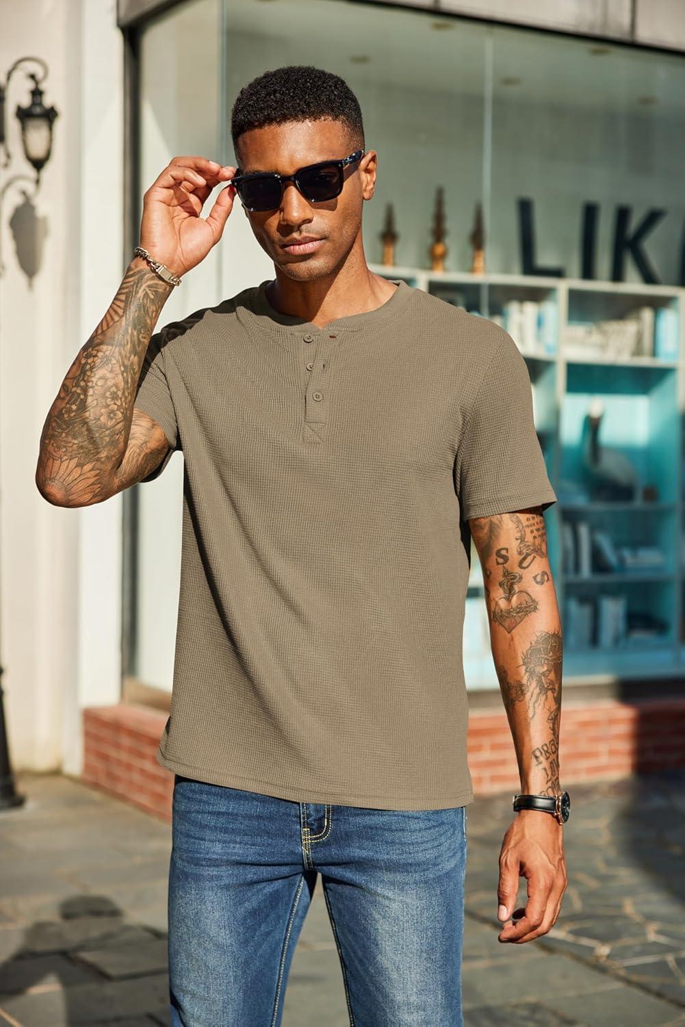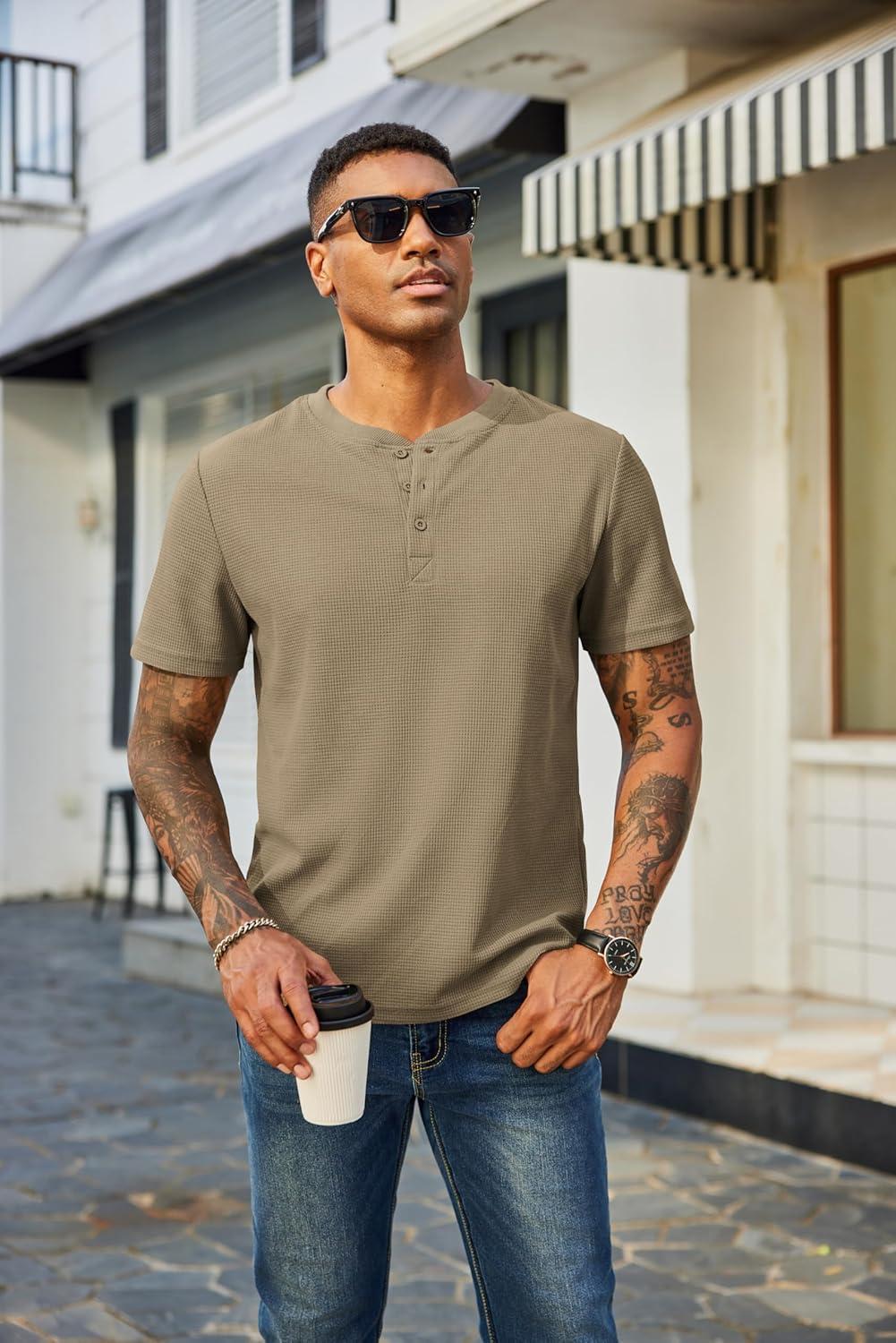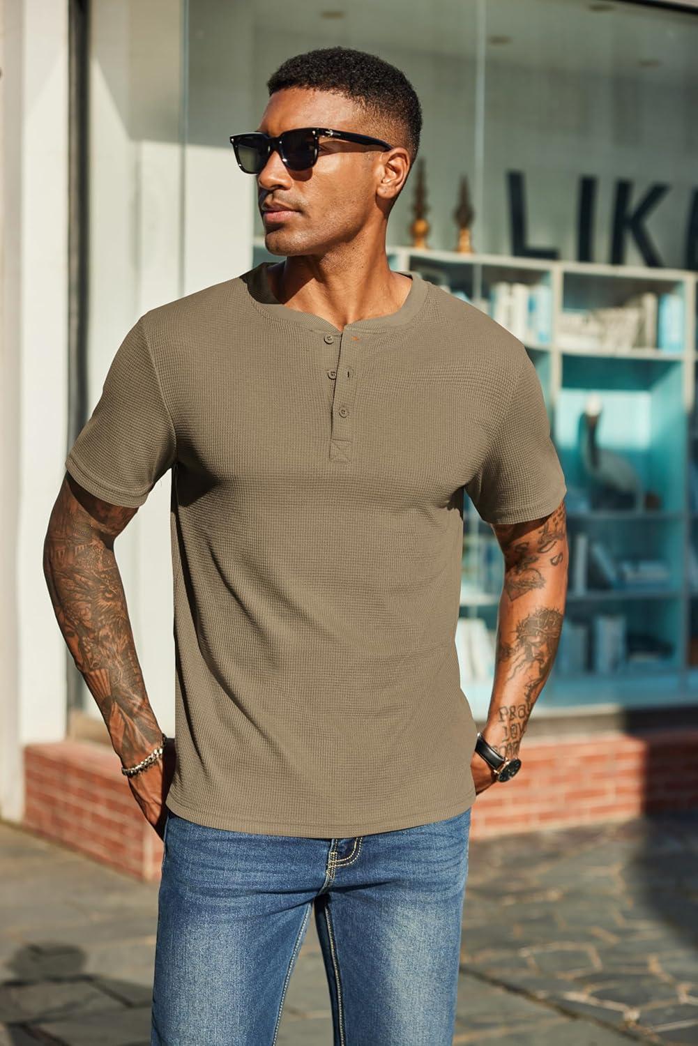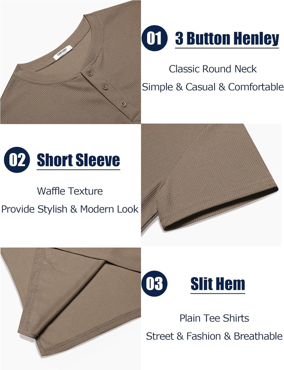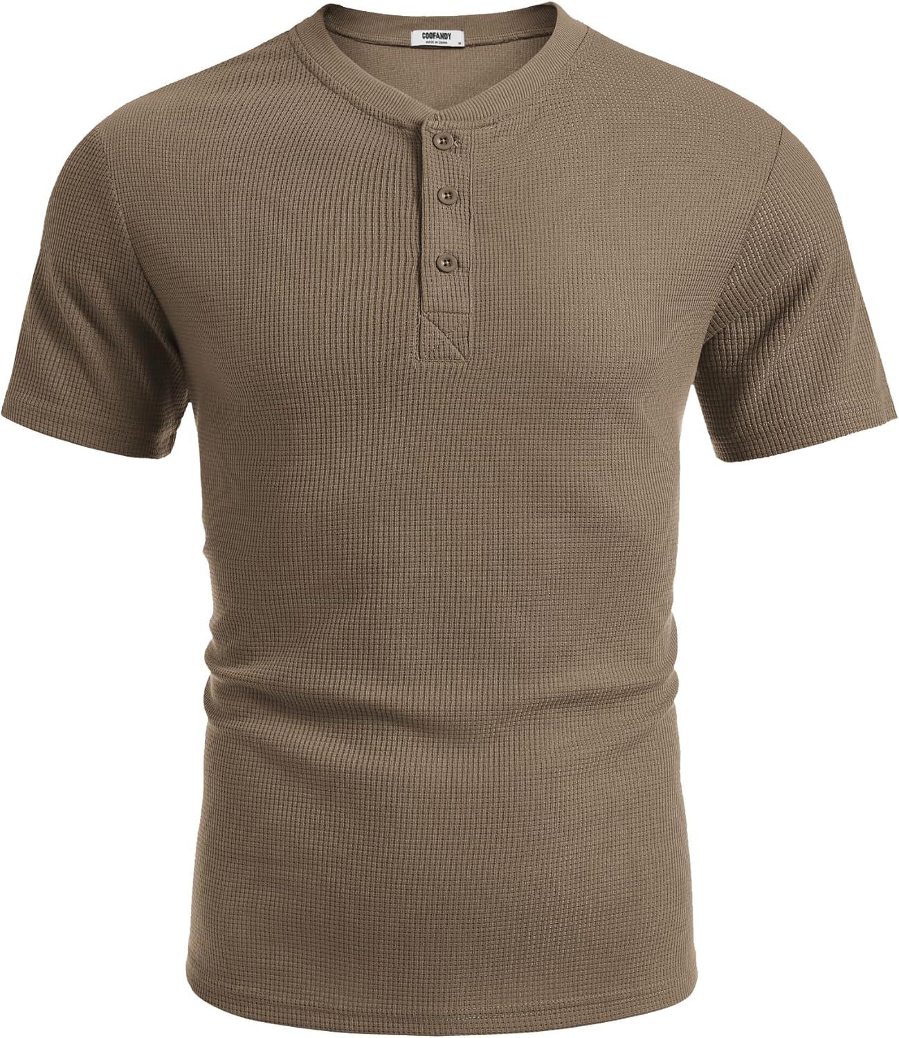 Get up to 60% off on COOFANDY Men’s Waffle Henley Short Sleeve Textured T Shirt Casual Button Tee Shirts Heavyweight Henley Summer Top(Khaki) styles during our winter sale event.