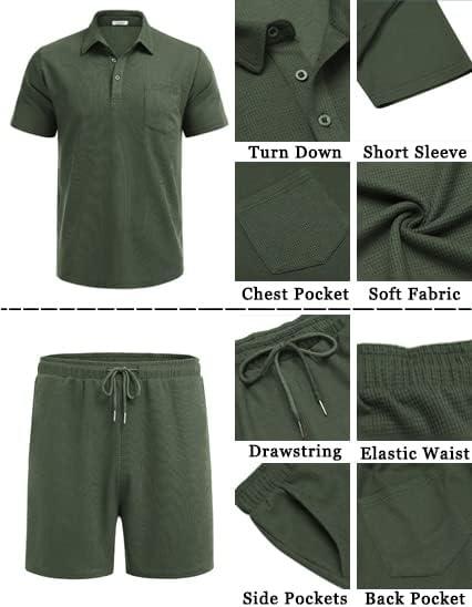 COOFANDY Men's Waffle Knit Polo Shirt and Shorts Set 2 Pieces Outfits Summer Suit Casual Tracksuit with Pockets(Army Green)