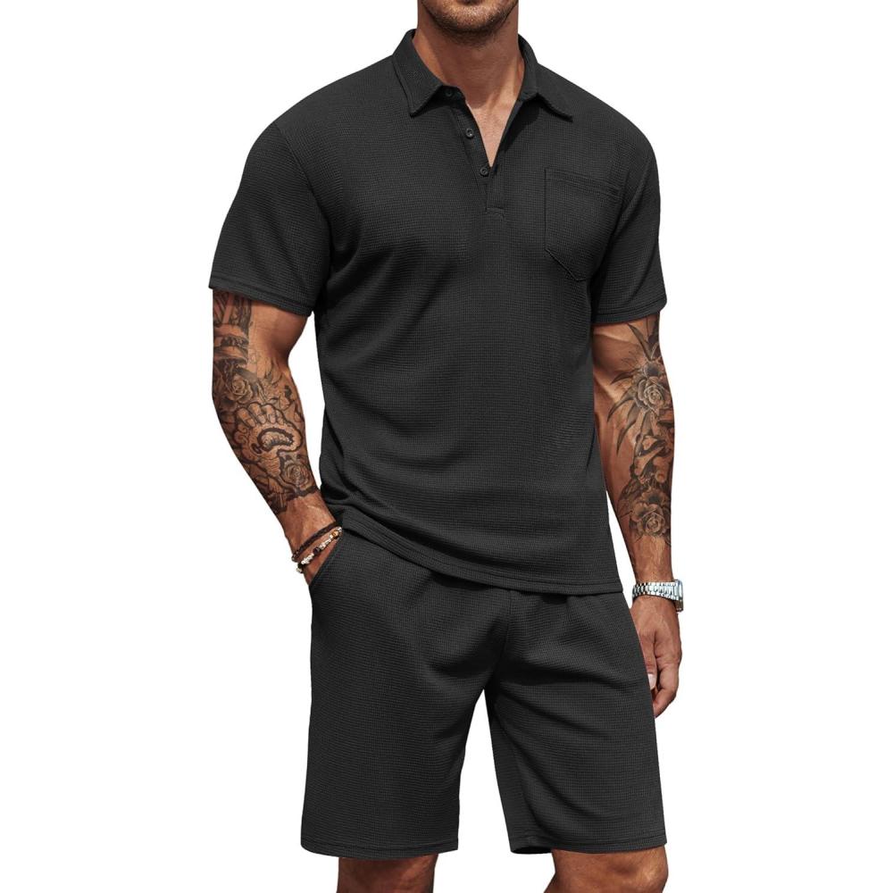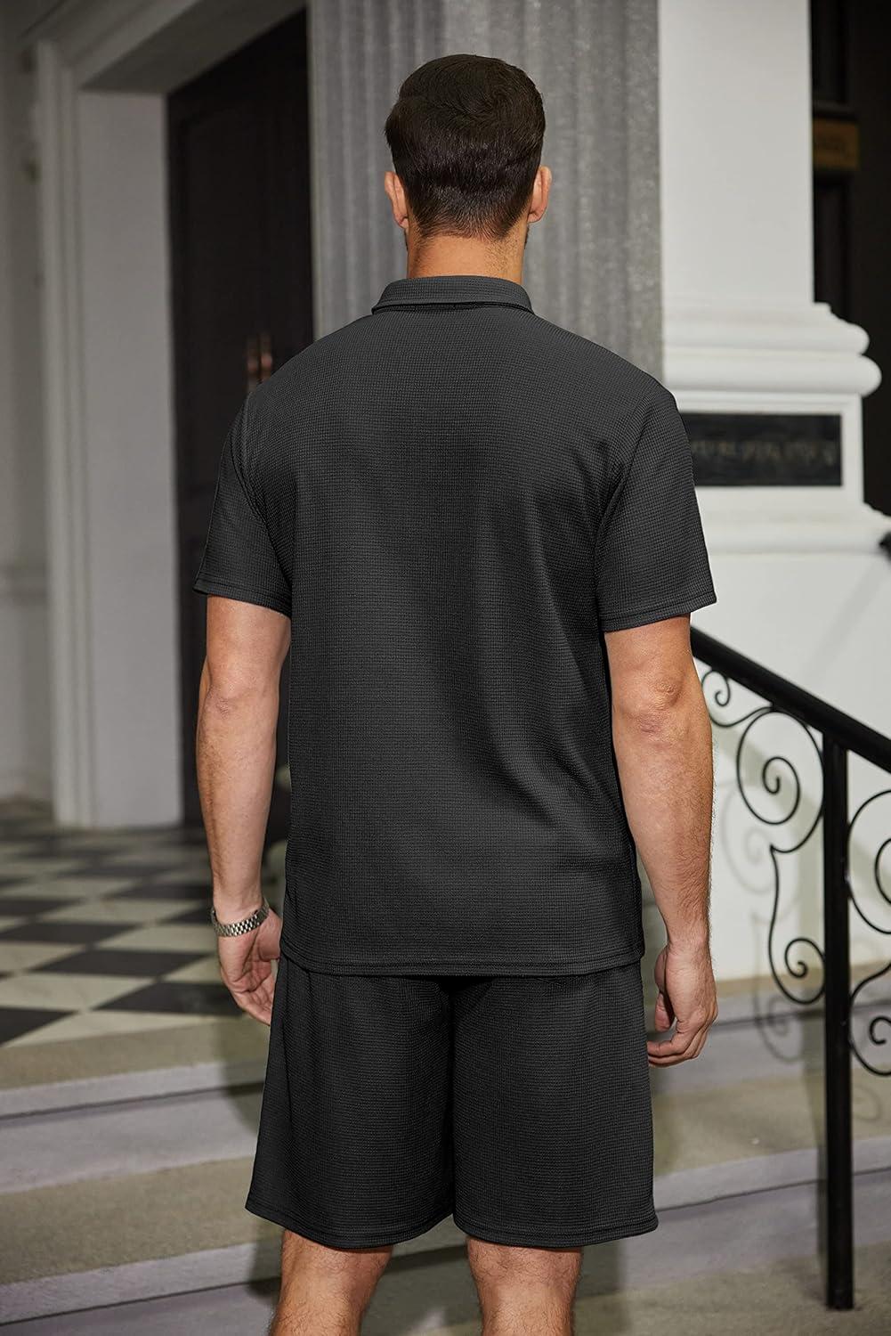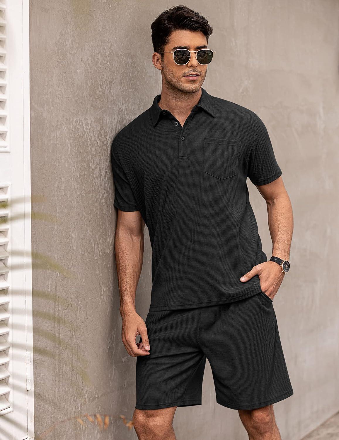 COOFANDY Men's Waffle Knit Polo Shirt and Shorts Set 2 Pieces Outfits Summer Suit Casual Tracksuit with Pockets(Black)