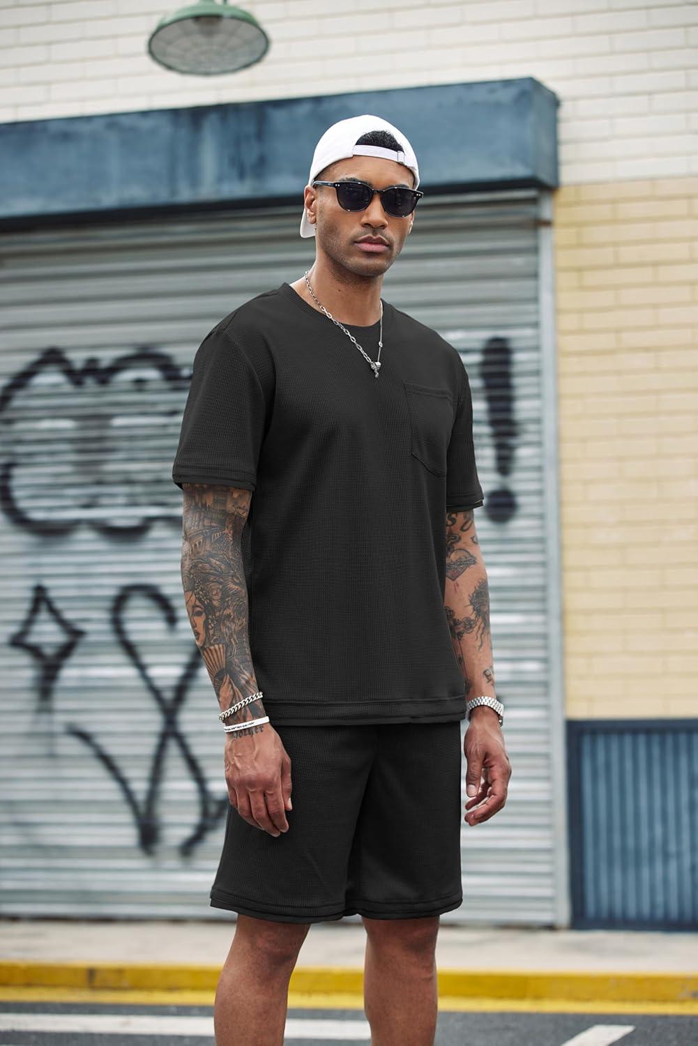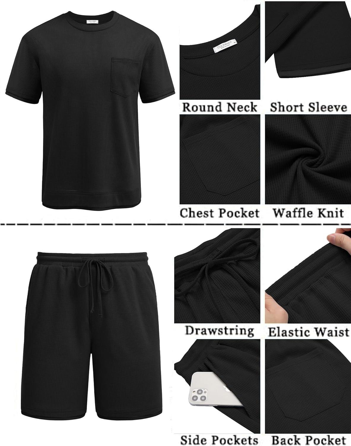 COOFANDY Men's Waffle Shirt and Shorts Set 2 Piece Outfits Casual Summer Tracksuits Set with Pockets(Pure Black)