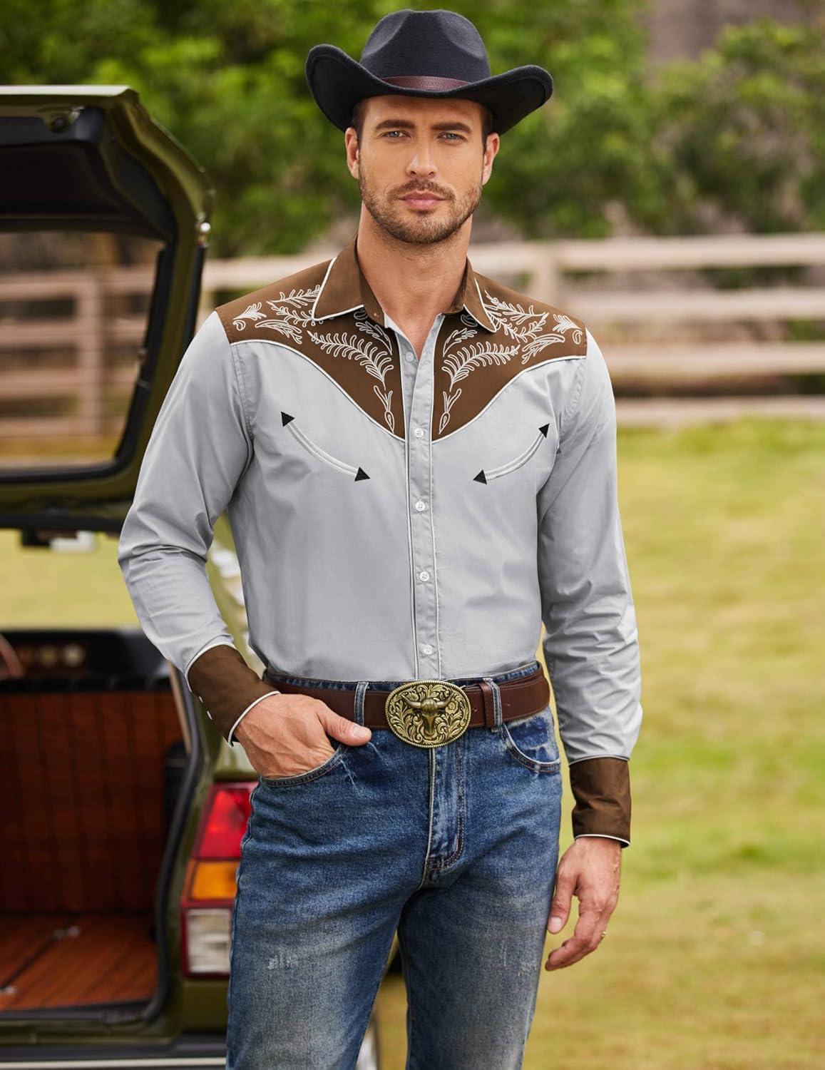 COOFANDY Men’s Western Cowboy Shirt Embroidered Button Down Long Sleeve Shirts(Cotton – Grey)
