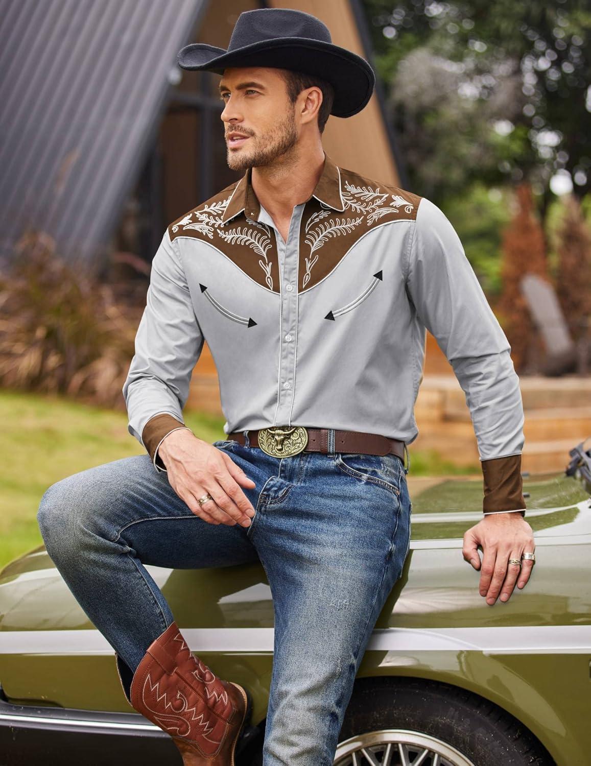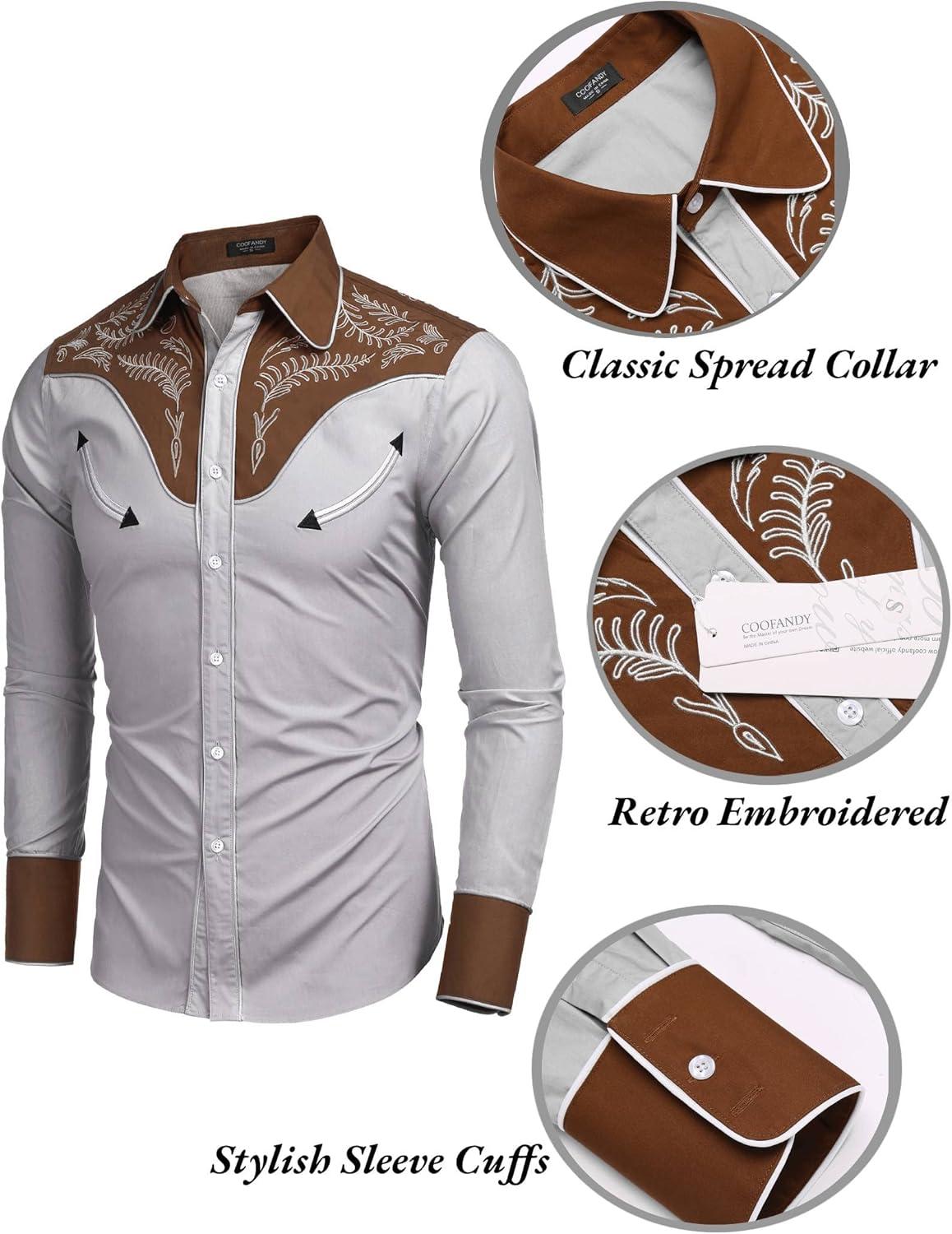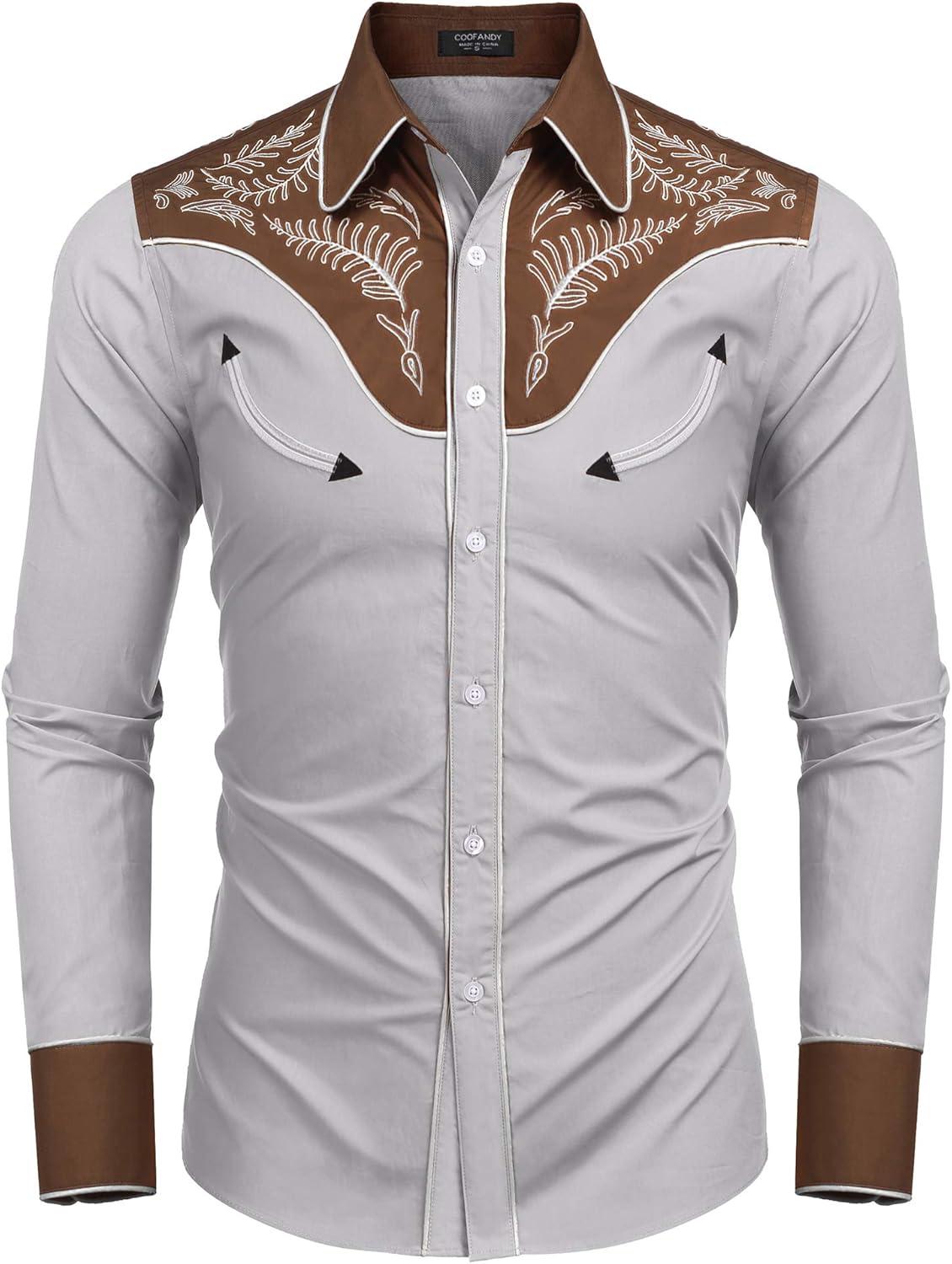 COOFANDY Men's Western Cowboy Shirt Embroidered Button Down Long Sleeve Shirts(Cotton - Grey)