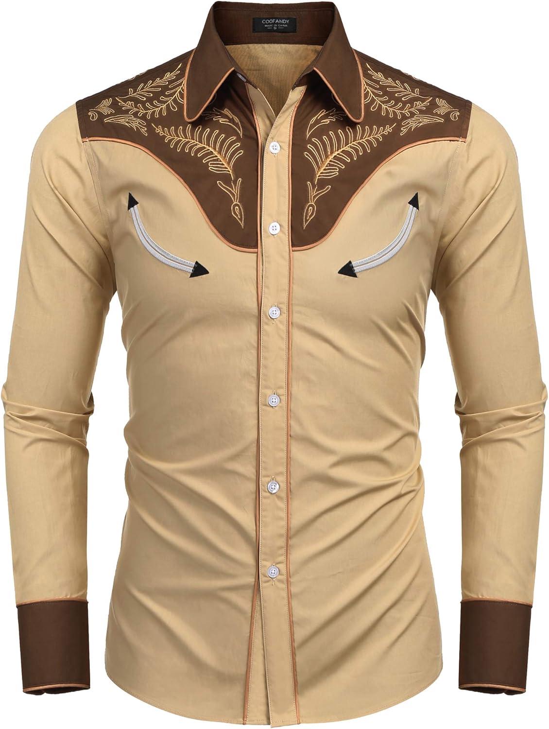 COOFANDY Men's Western Cowboy Shirt Embroidered Button Down Long Sleeve Shirts(Cotton - Khaki)