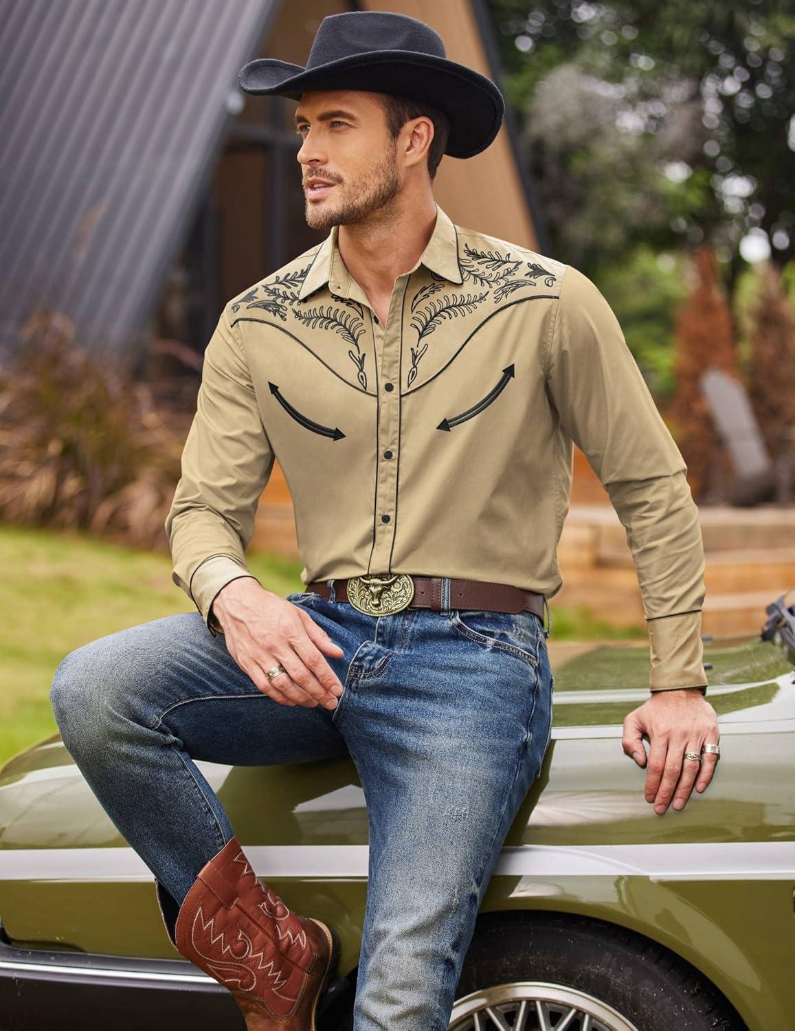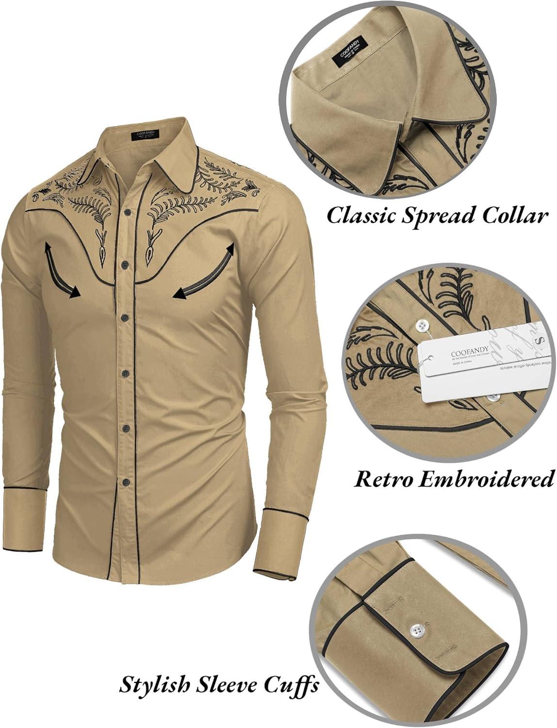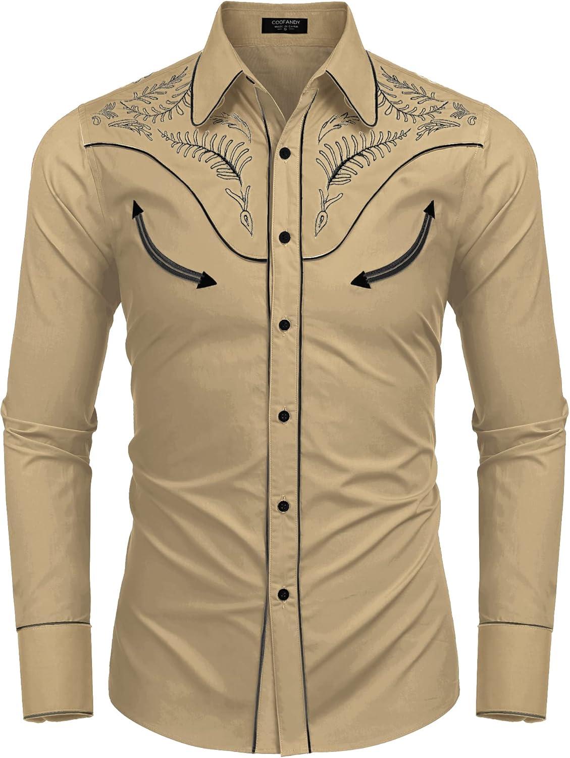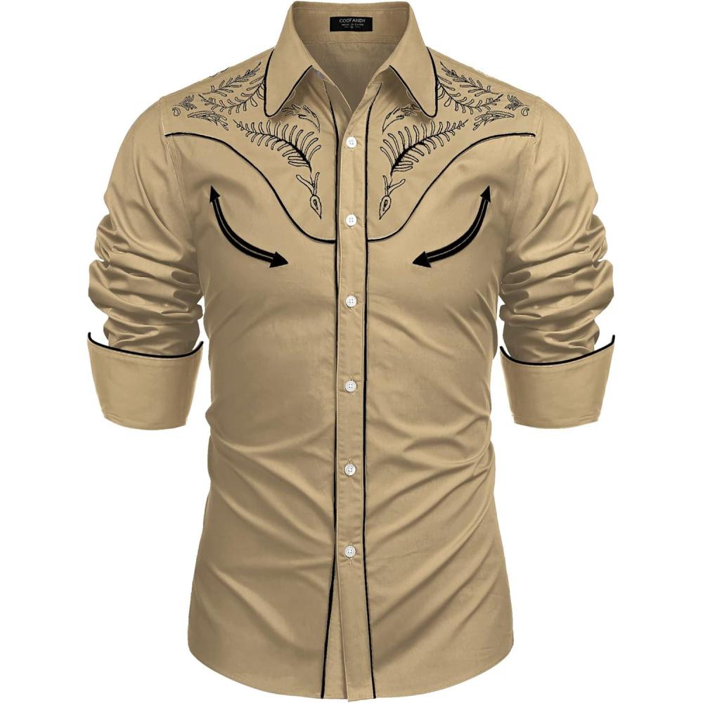 COOFANDY Men’s Western Cowboy Shirt Embroidered Button Down Long Sleeve Shirts(Cotton – Khaki)
