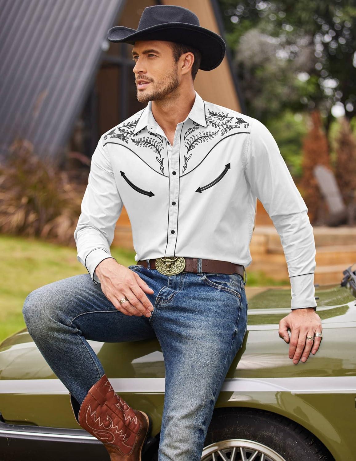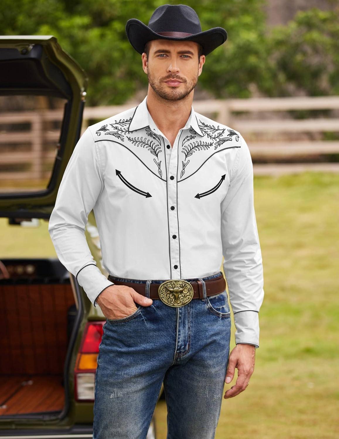 COOFANDY Men’s Western Cowboy Shirt Embroidered Button Down Long Sleeve Shirts(Cotton – White)