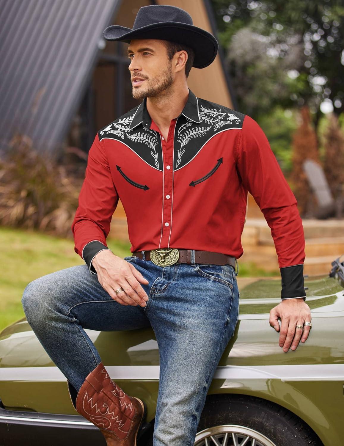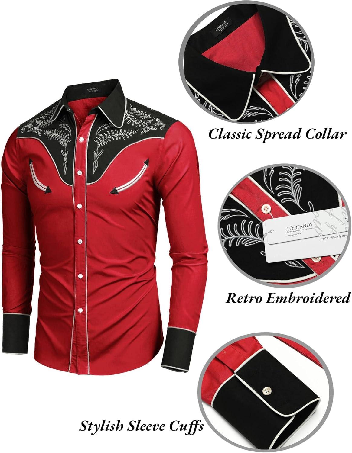 COOFANDY Men's Western Cowboy Shirt Embroidered Button Down Long Sleeve Shirts(Cotton - Red)