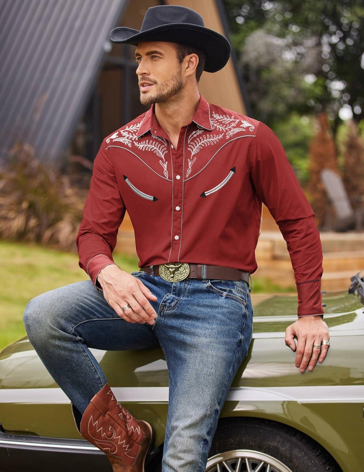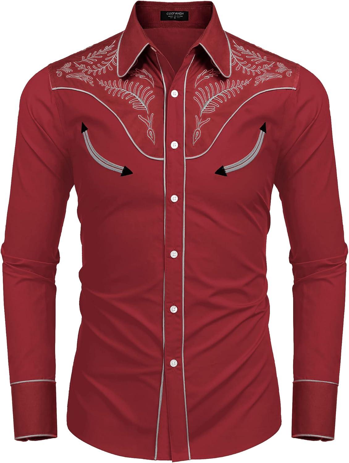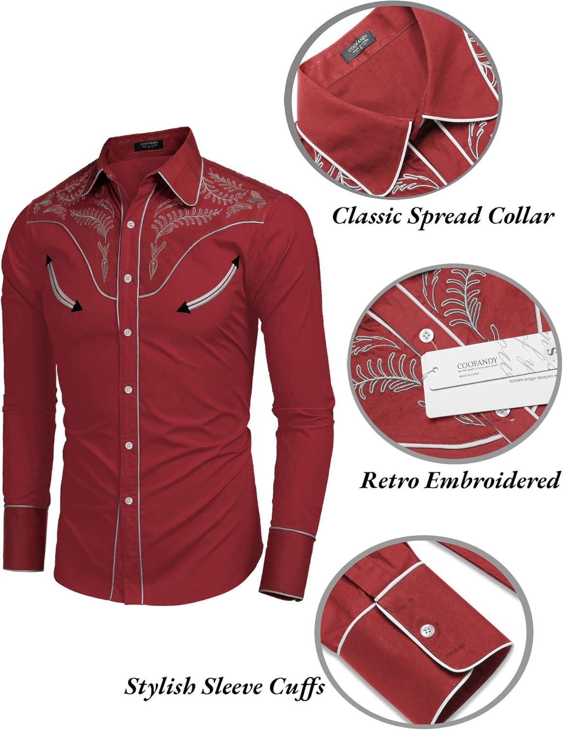 COOFANDY Men's Western Cowboy Shirt Embroidered Button Down Long Sleeve Shirts(Cotton - Red2)