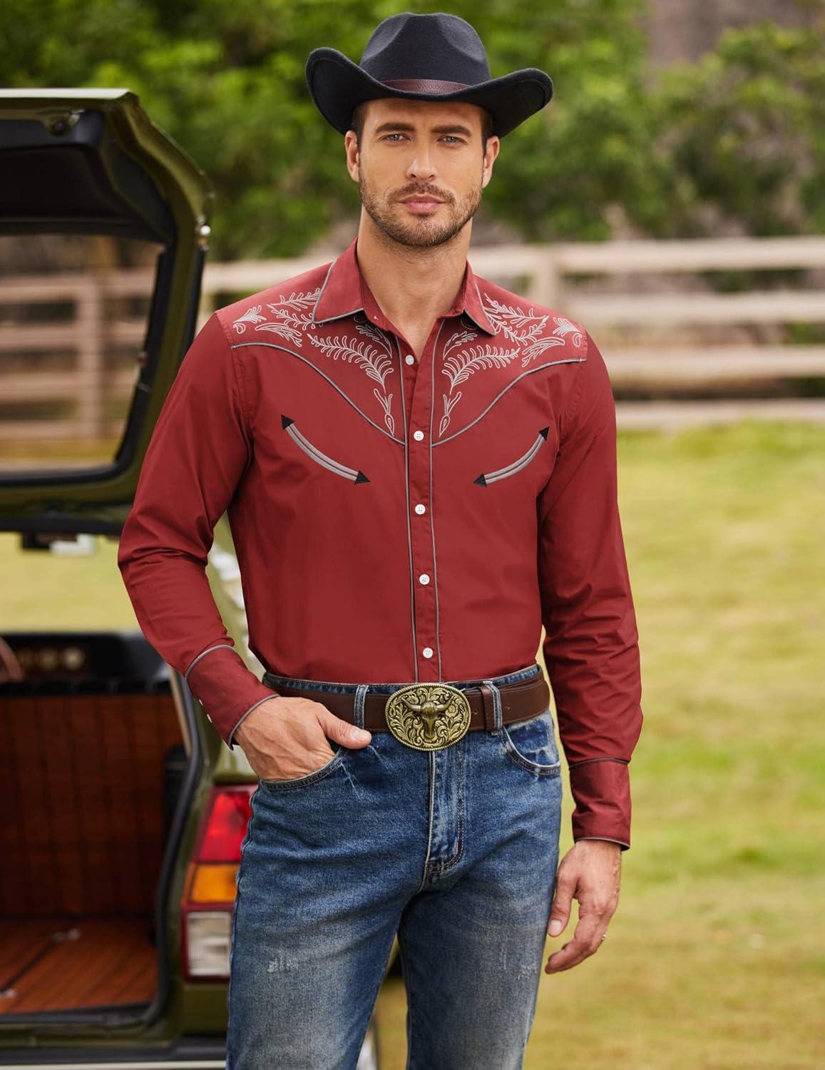 COOFANDY Men’s Western Cowboy Shirt Embroidered Button Down Long Sleeve Shirts(Cotton – Red2)