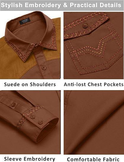 COOFANDY Men’s Western Cowboy Shirt Embroidered Long Sleeve Slim Fit Casual Cotton Button Down Hippie Shirts with Pockets(Brown & Black)
